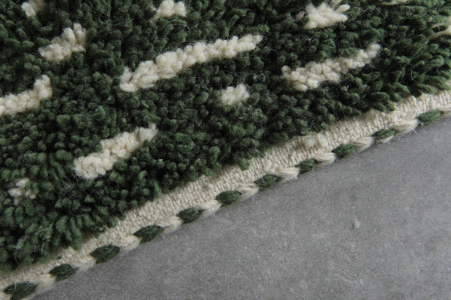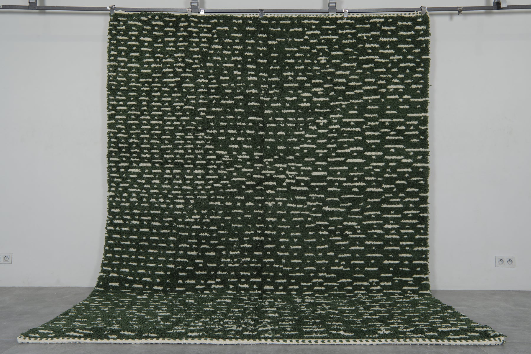 Elevate your space with the warmth and sophistication of this handwoven Moroccan wool rug, featuring a rich deep green base adorned with an intricate textured ivory pattern. Designed to complement both modern and traditional interiors, this rug blends authentic craftsmanship with timeless style.
