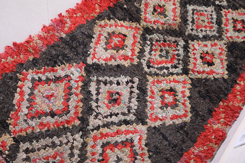 Add a bold touch to your space with this handwoven Moroccan runner rug, measuring 2.8 x 6.1 feet. Featuring intricate diamond patterns in striking shades of red, white, and black, this unique piece is perfect for hallways, entryways, or narrow spaces. Its rich colors and geometric design bring a sophisticated yet traditional charm to any interior.