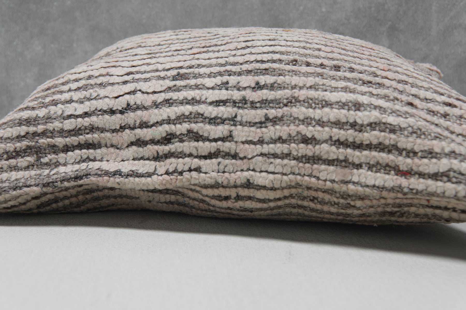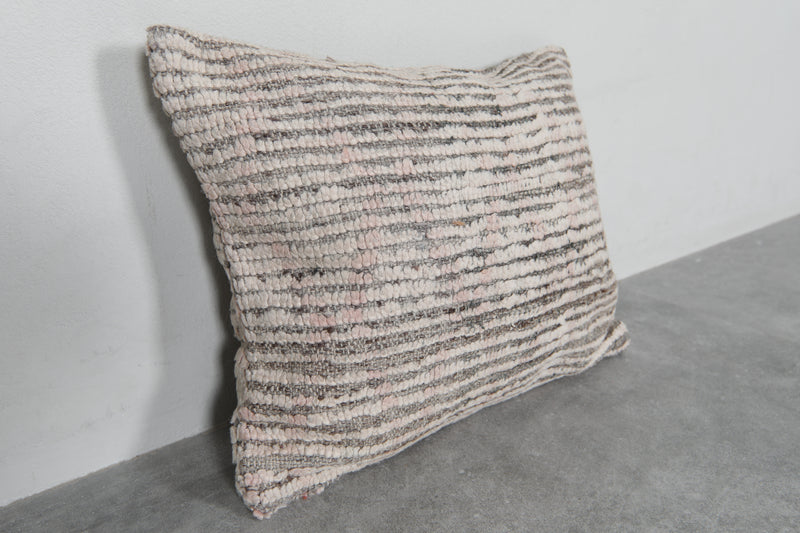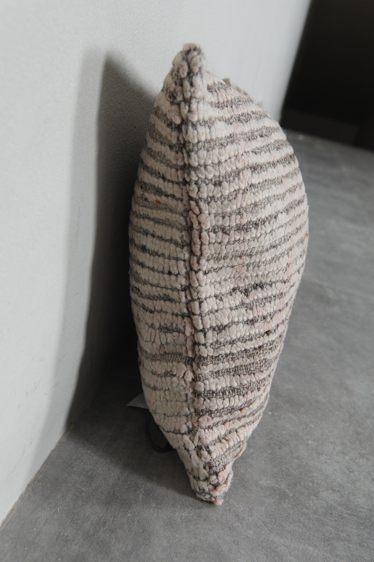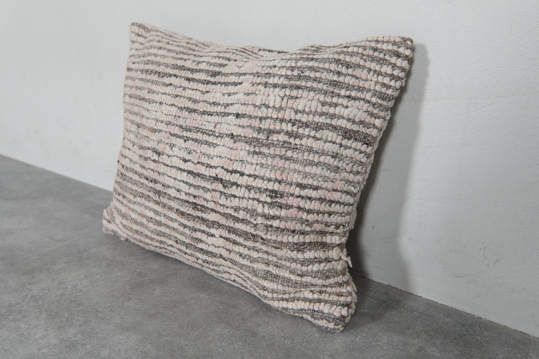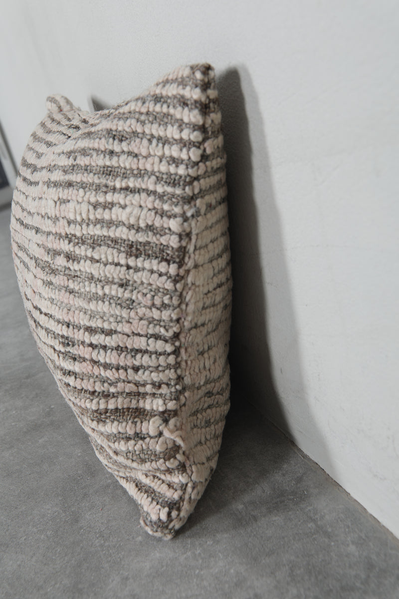 Transform your space with this handwoven Moroccan wool pillow, featuring soft, textured stripes in neutral shades of beige, gray, and pink. Crafted with care, its subtle hues blend effortlessly with modern, bohemian, or minimalist decor. Perfect for adding warmth and comfort to your sofa or bed. Size: 16.1 x 20 inches.