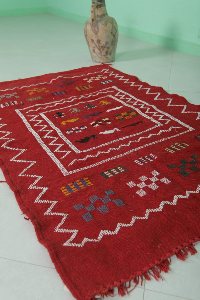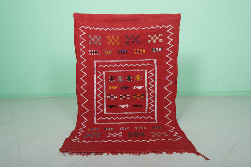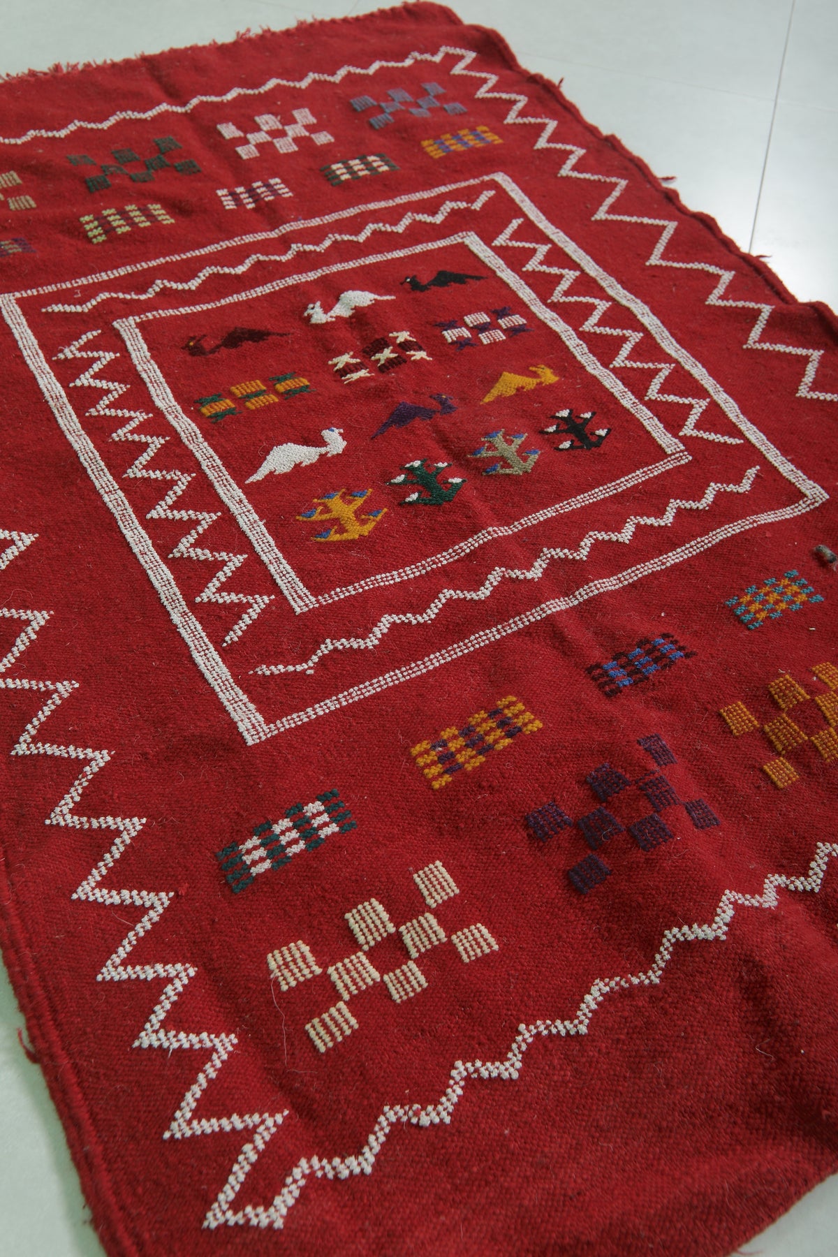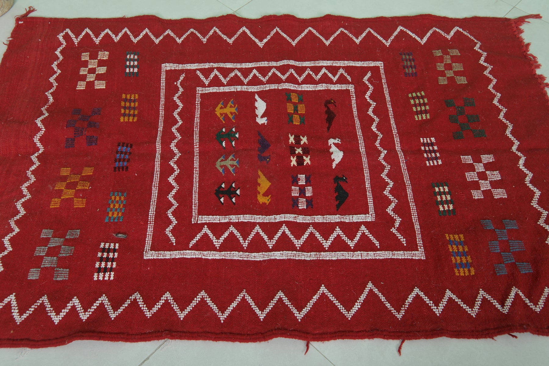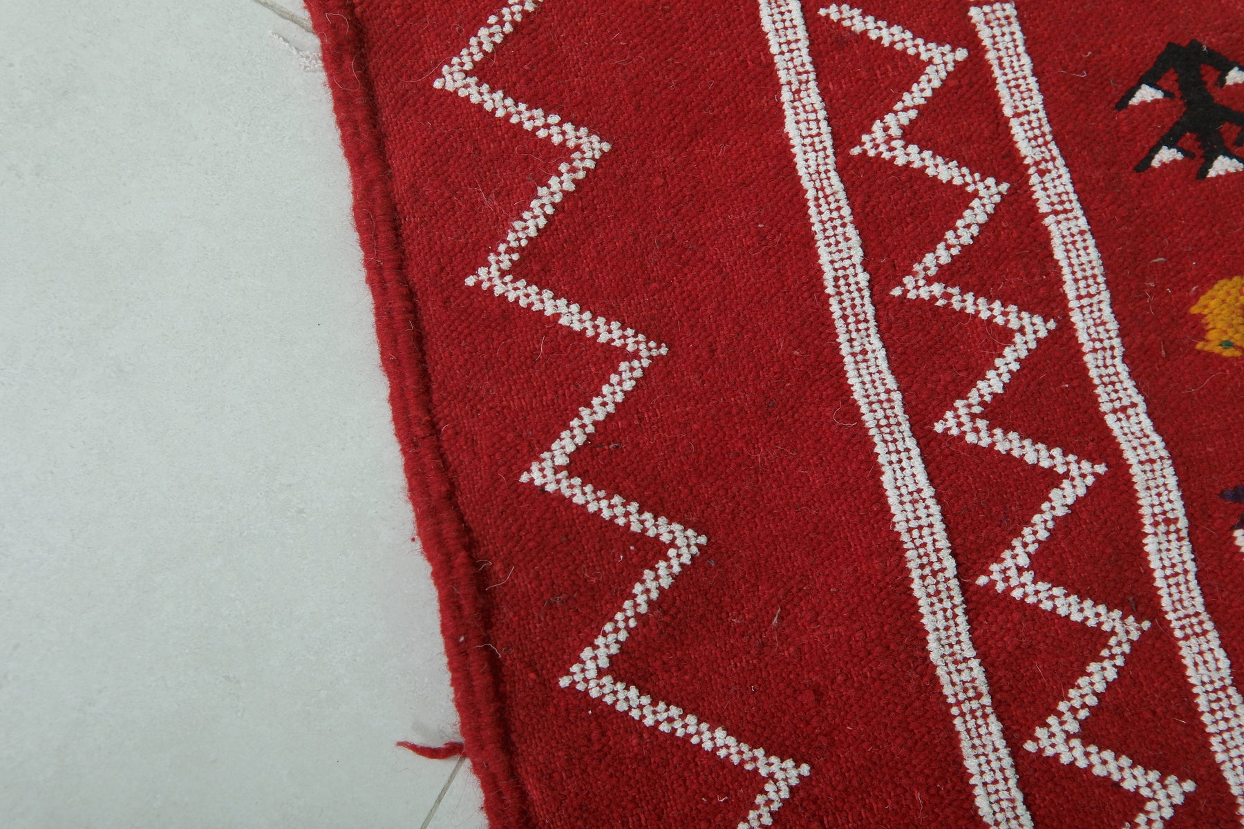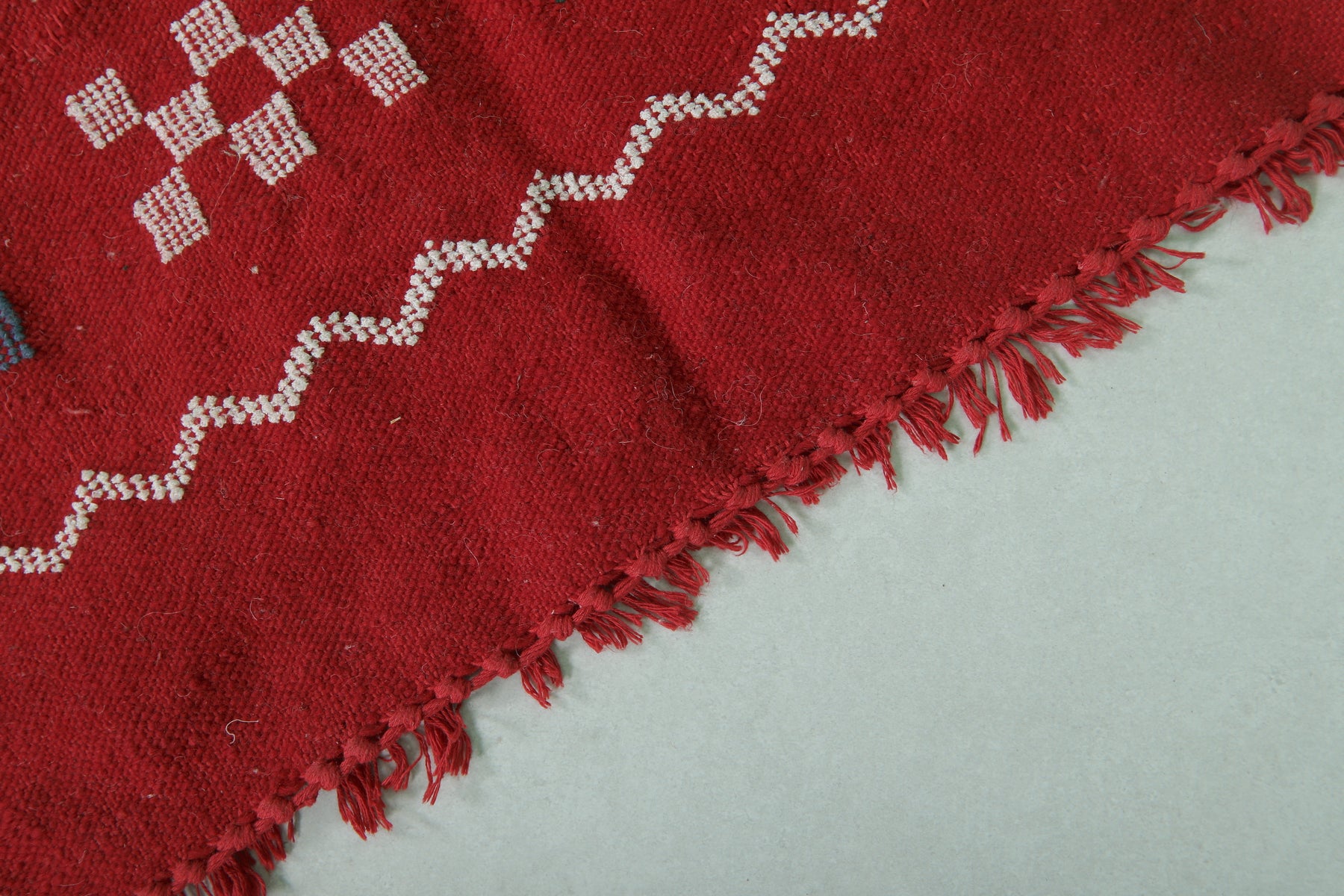 This 3.1 x 4.7 feet Handwoven Red Kilim Rug features a striking red base adorned with detailed geometric motifs in vibrant hues. Perfect for small spaces or as a decorative statement piece, it blends traditional Moroccan artistry with cozy charm.