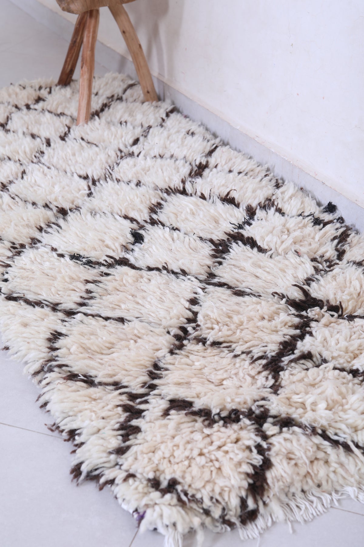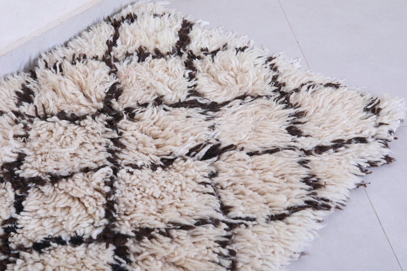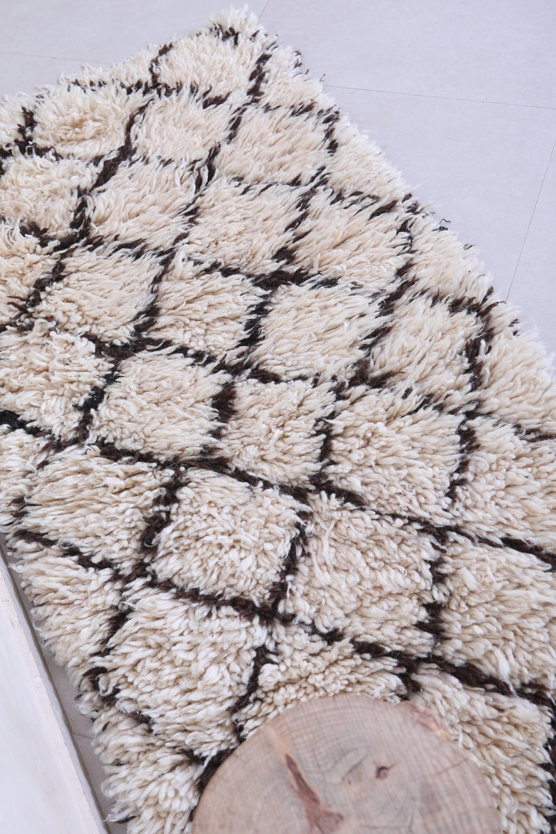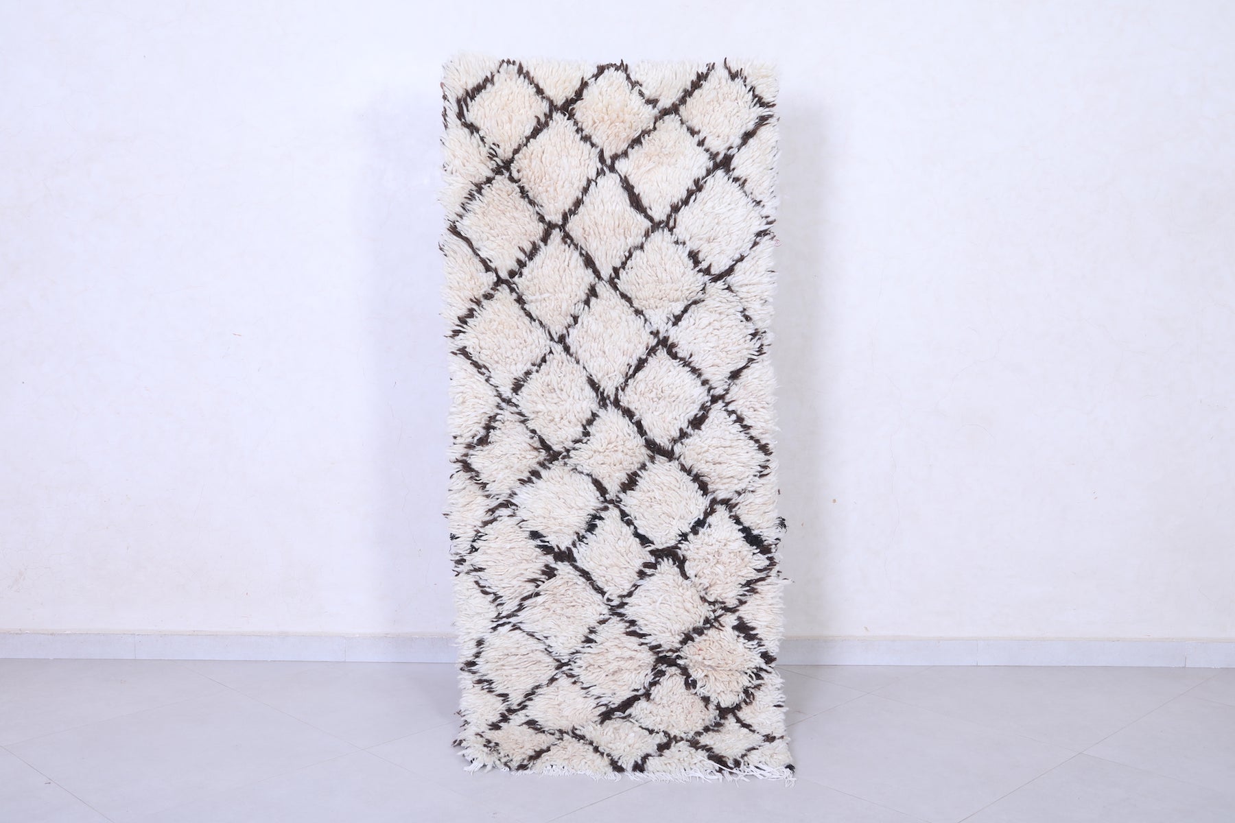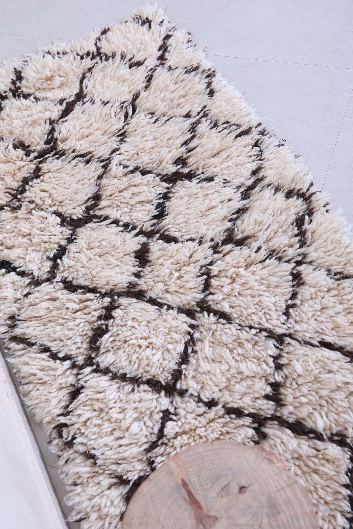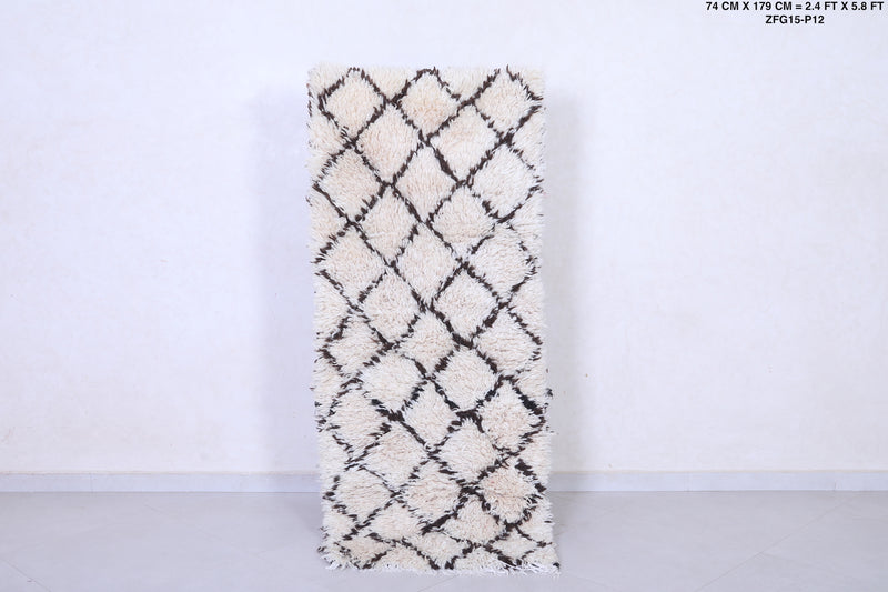 Upgrade your space with this Handwoven Vintage Moroccan Runner Rug, measuring 2.4 FT x 5.8 FT. Featuring a timeless black diamond lattice on an ivory base, this plush, high-pile rug blends traditional Berber craftsmanship with modern sophistication—ideal for entryways, narrow halls, or minimalist interiors.
