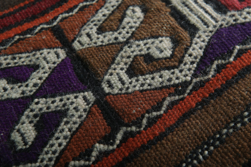 This 5.6 FT x 10.9 FT Large Handwoven Moroccan Kilim Rug is a vibrant display of Berber craftsmanship, featuring traditional geometric motifs in rich, earthy tones. Its spacious dimensions and bold aesthetic make it ideal for large living rooms, dining areas, or as a cultural centerpiece in modern interiors.