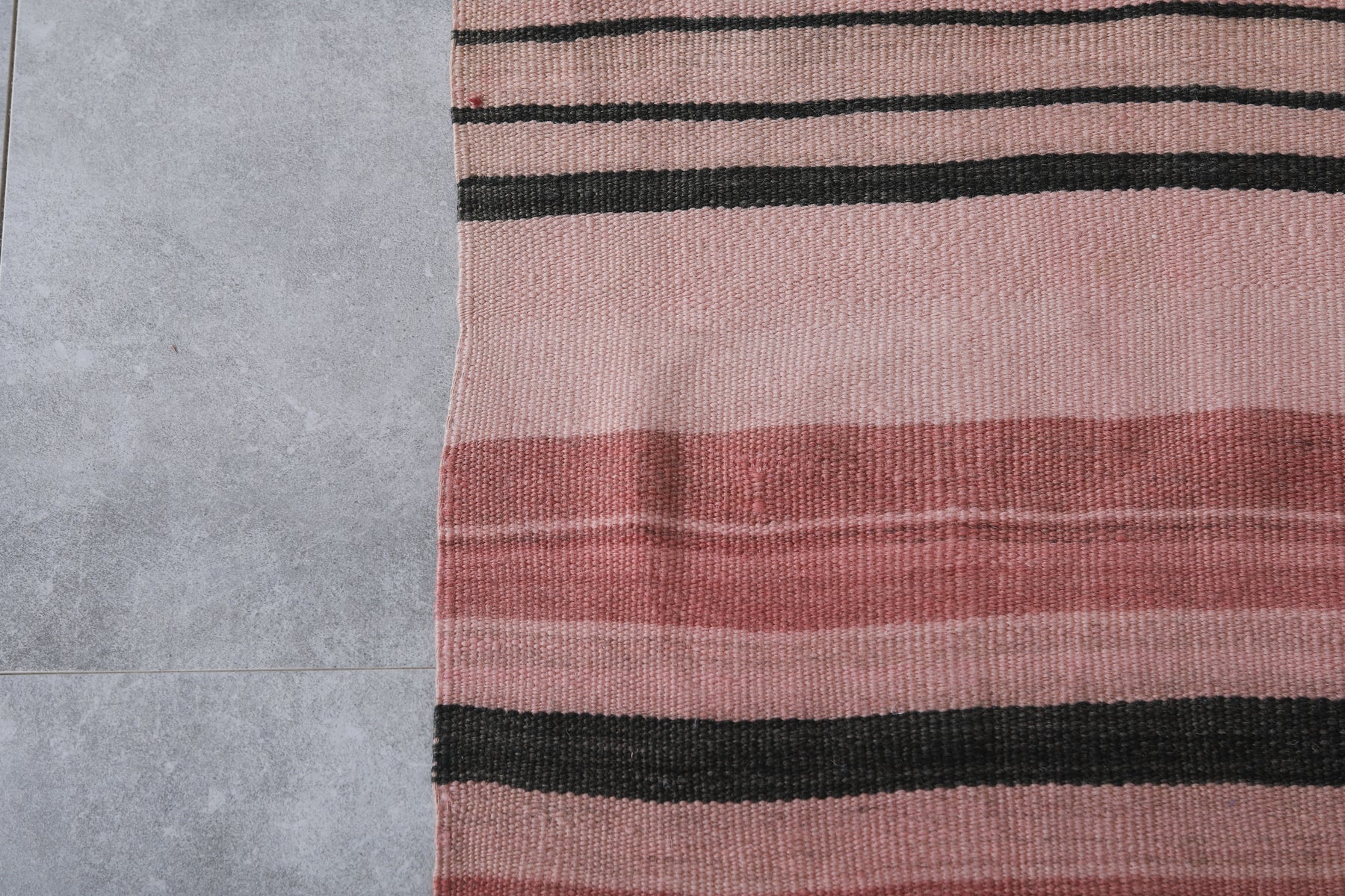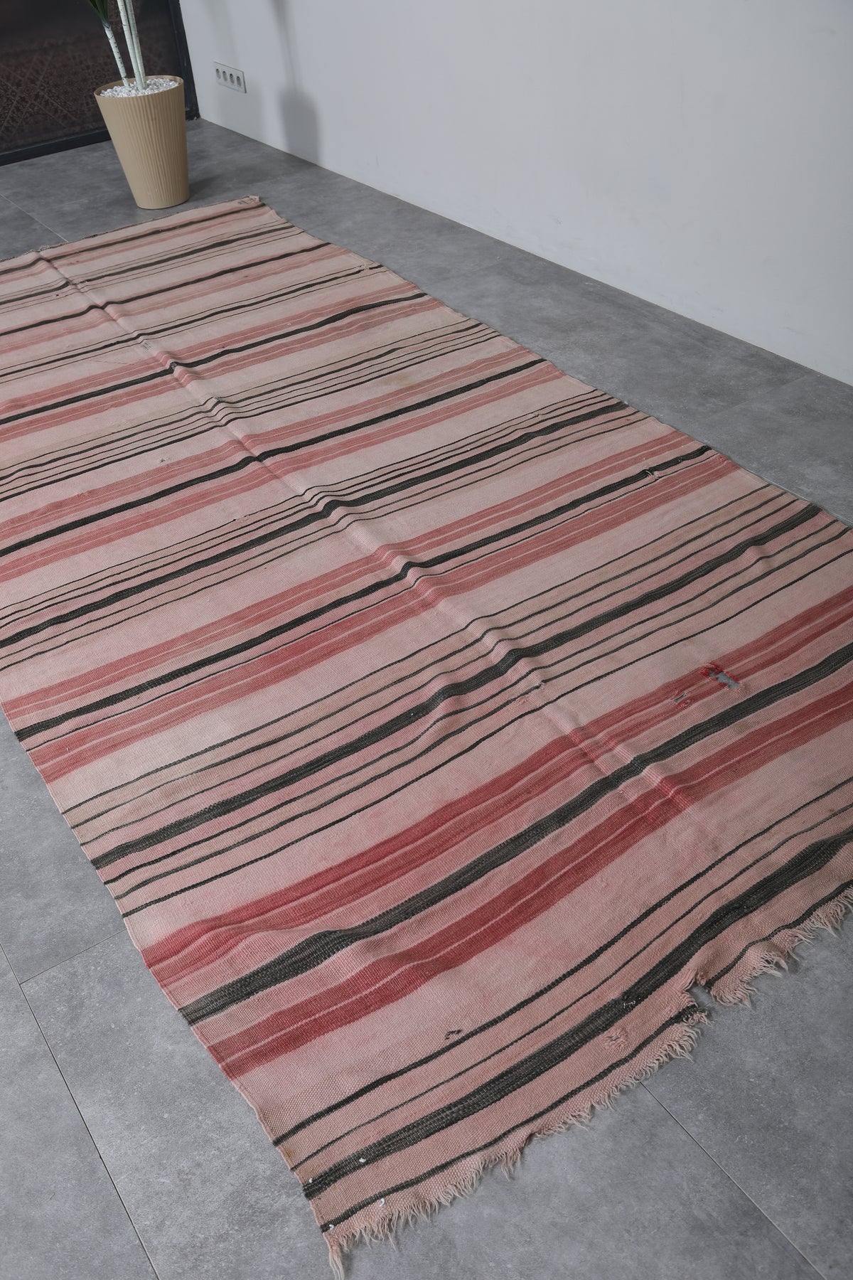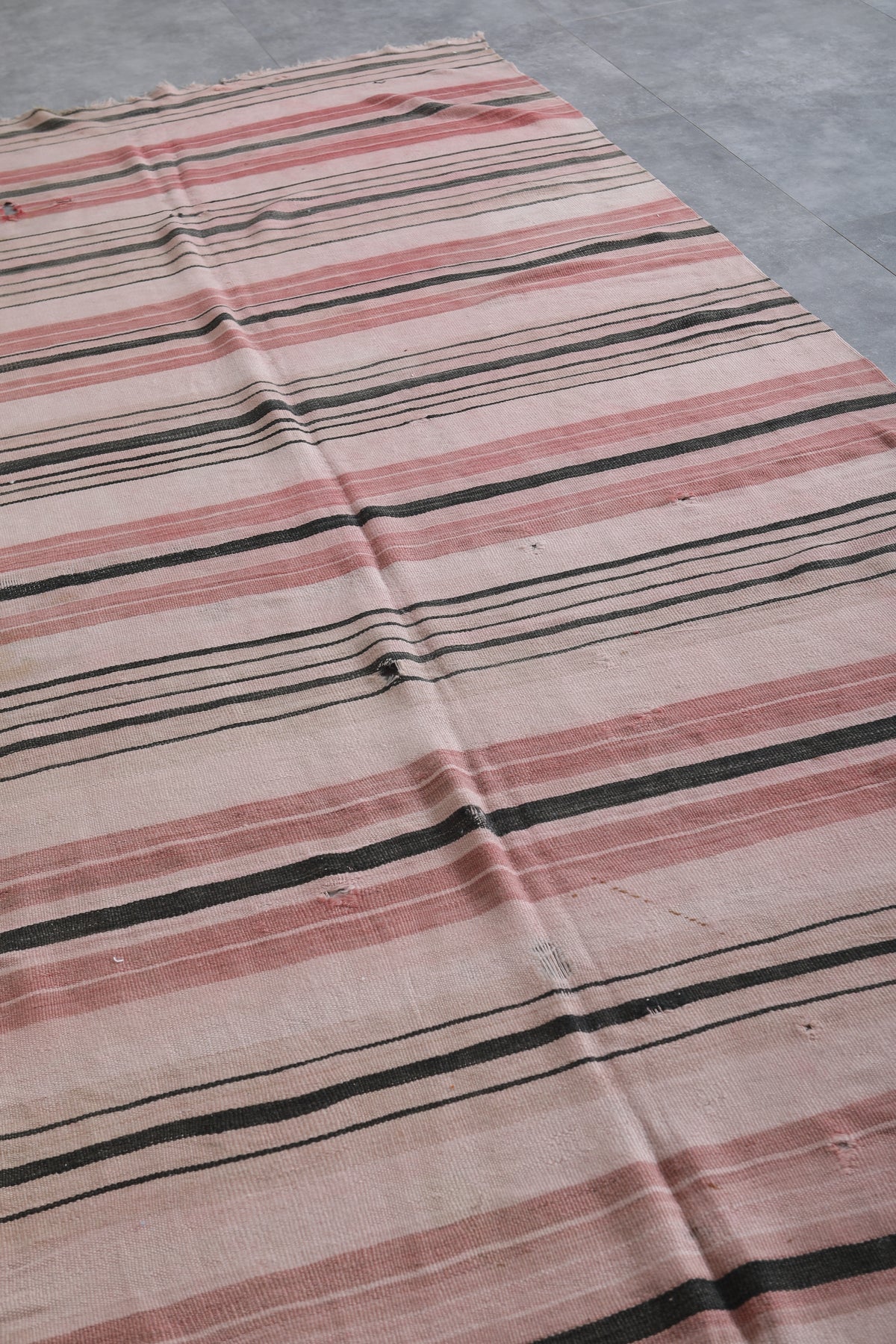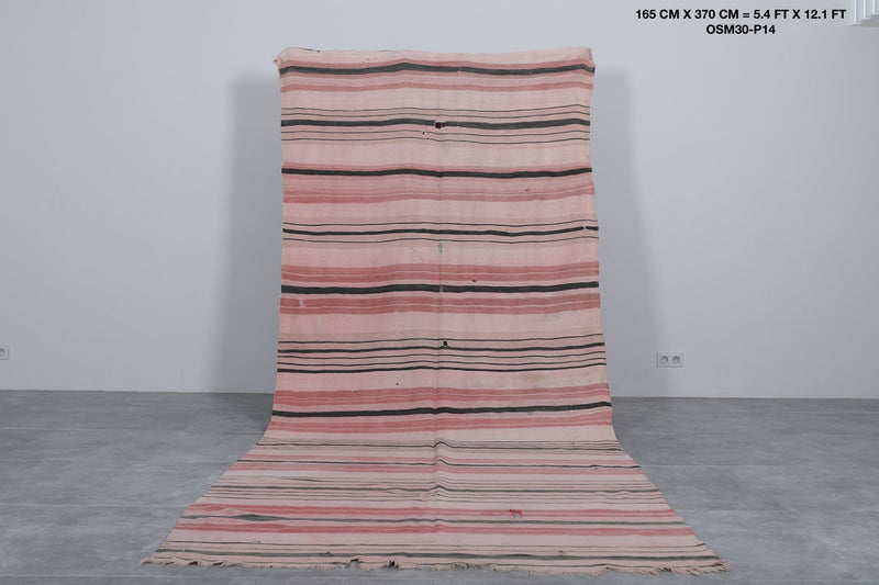 This 5.4 x 12.1 feet Large Moroccan Handwoven Kilim features soft pink hues with classic black stripes, offering a perfect blend of warmth and elegance. A true reflection of Moroccan craftsmanship, this vintage kilim is ideal for living rooms, dining areas, or as a striking wall hanging.
