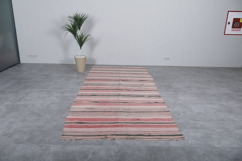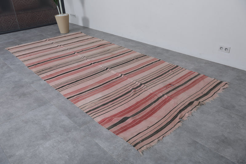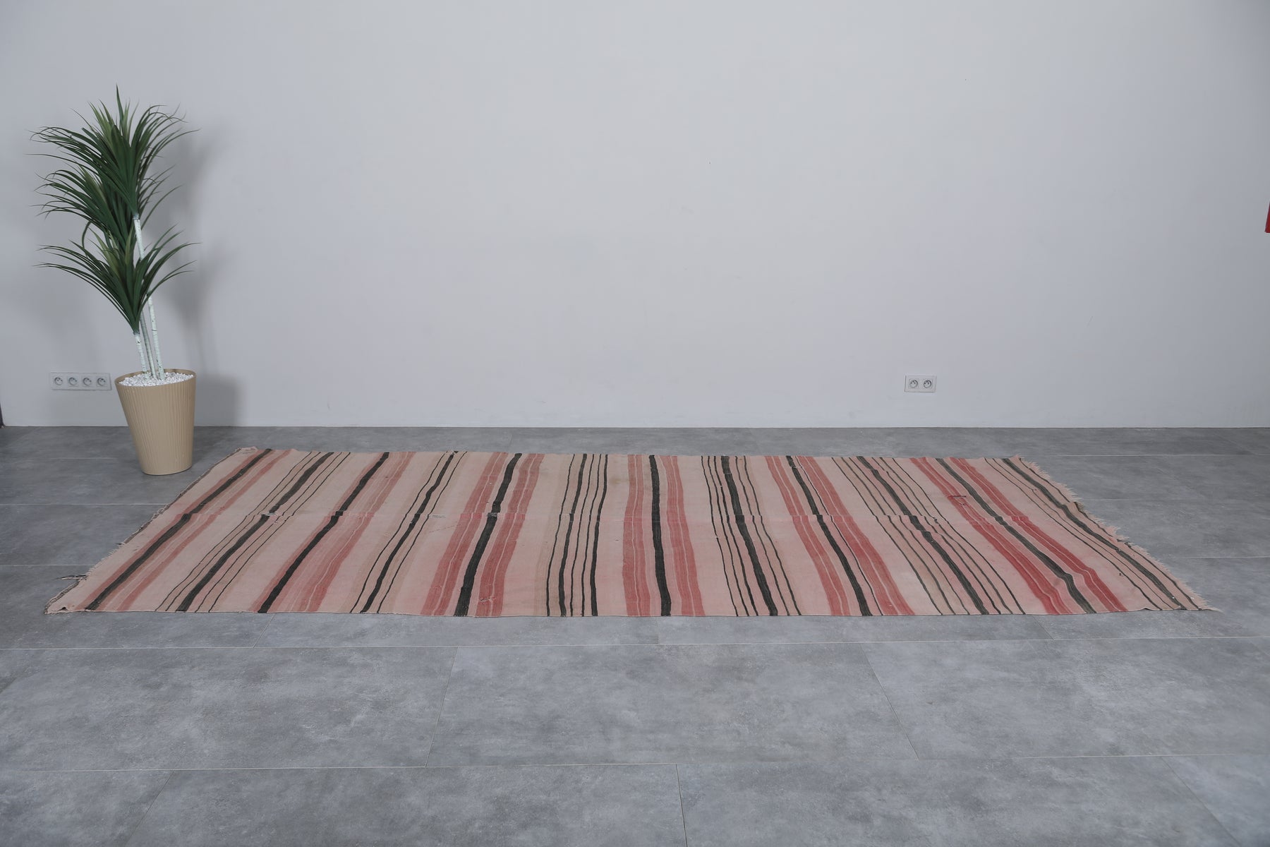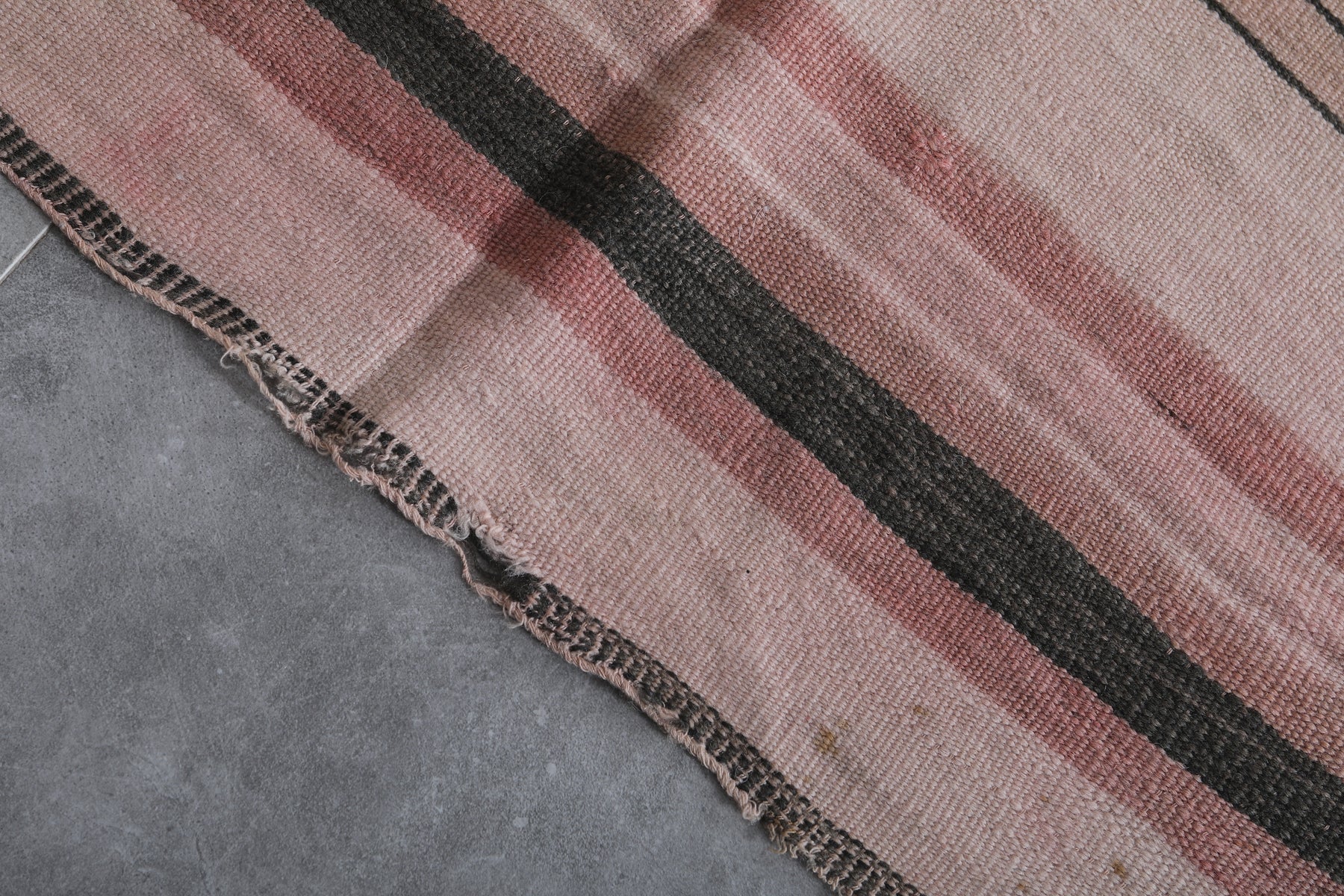 This 5.4 x 12.1 feet Large Moroccan Handwoven Kilim features soft pink hues with classic black stripes, offering a perfect blend of warmth and elegance. A true reflection of Moroccan craftsmanship, this vintage kilim is ideal for living rooms, dining areas, or as a striking wall hanging.