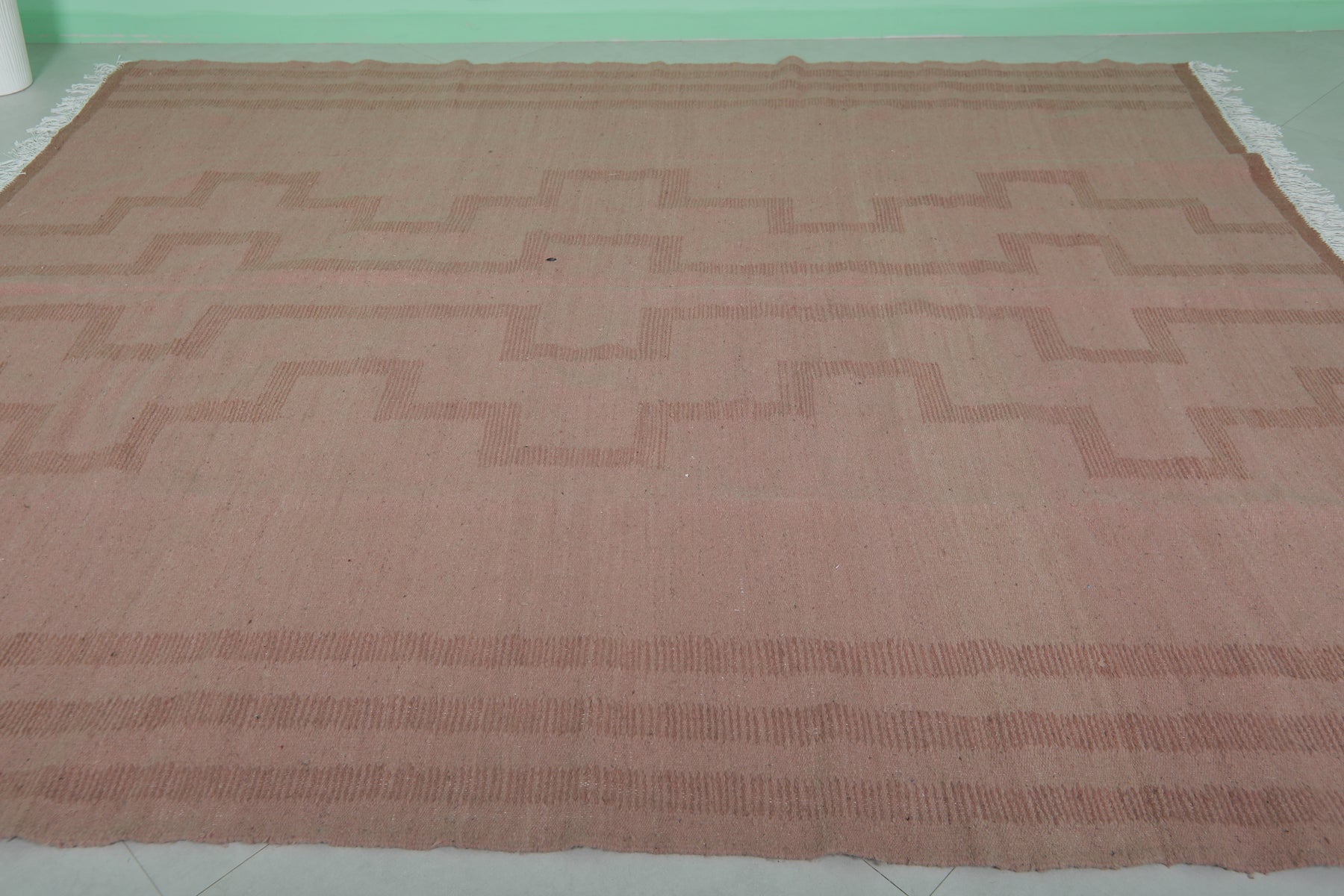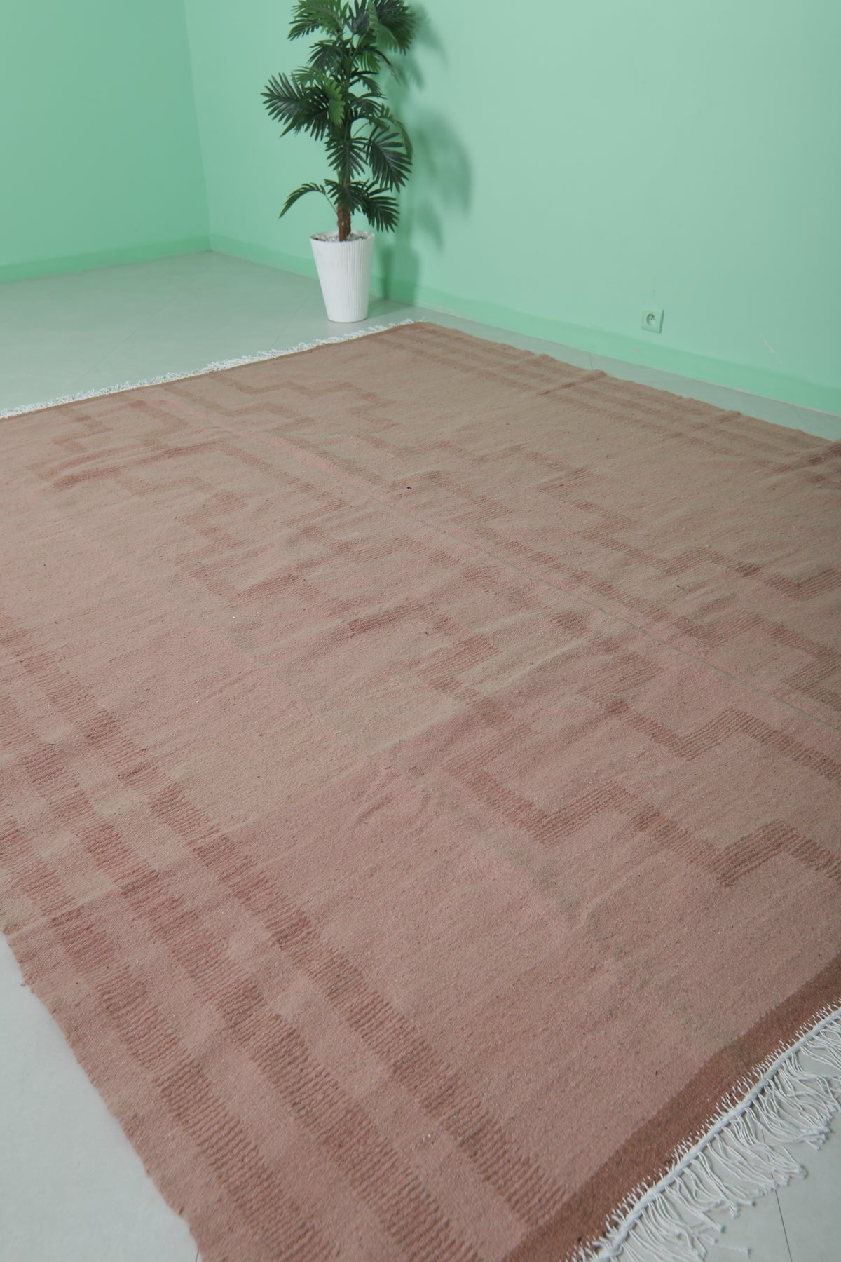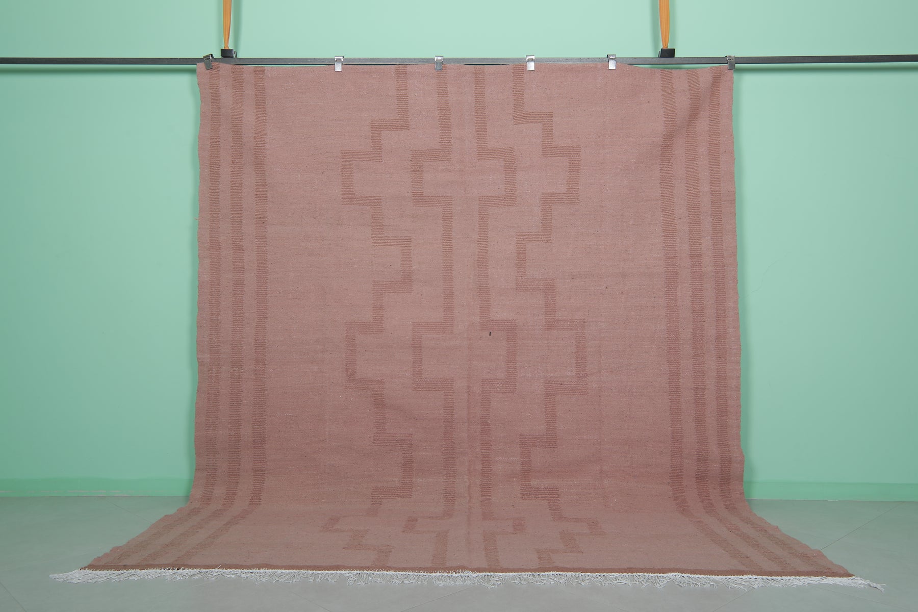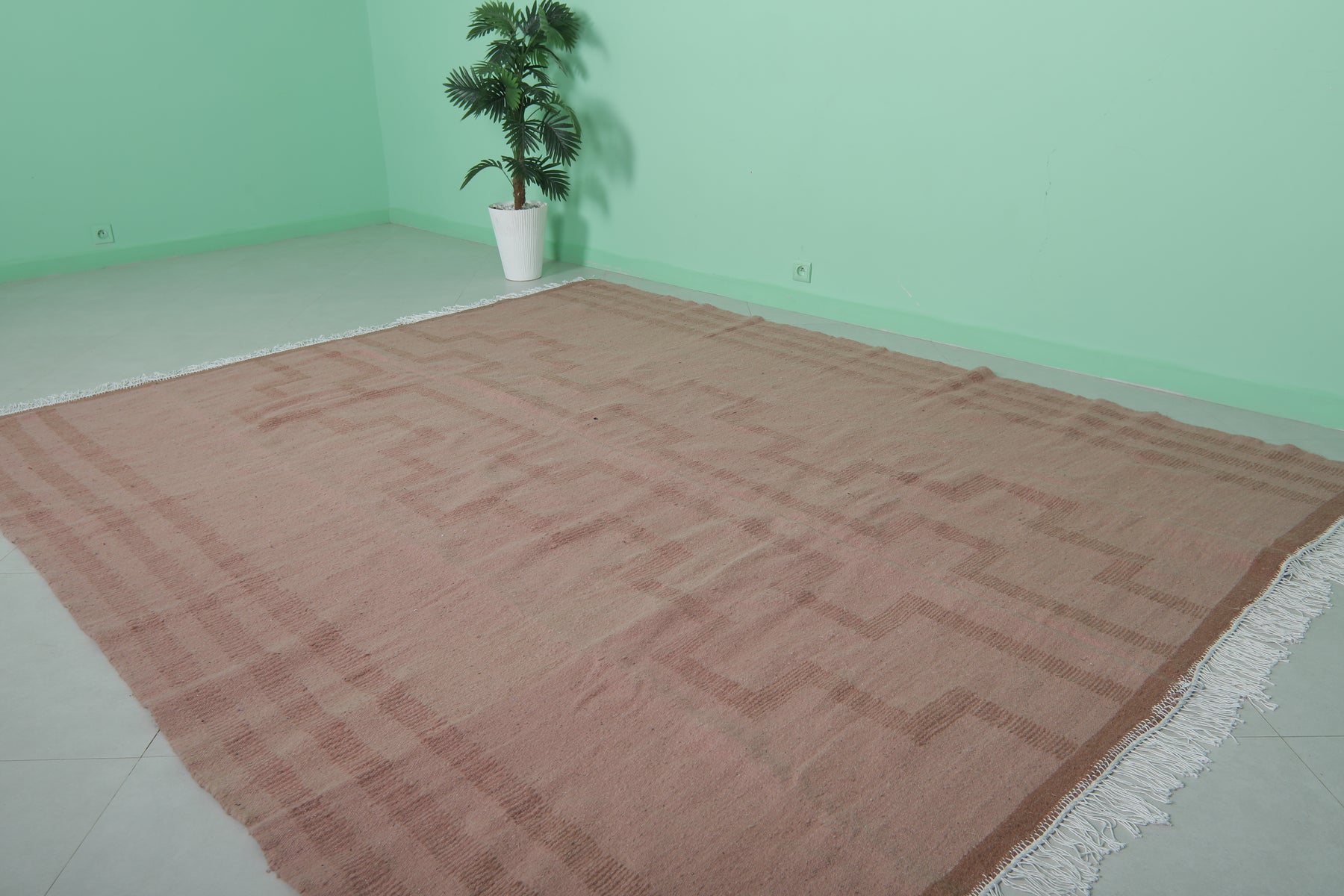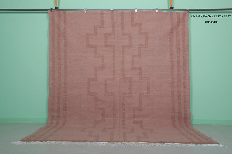This 8.3 x 9.7 feet large Moroccan rug showcases a modern geometric flatweave design in warm earthy tones, blending simplicity and sophistication. Its understated elegance makes it ideal for living rooms, bedrooms, or creative spaces, seamlessly complementing modern, minimalist, or bohemian interiors. Handwoven from premium natural wool, this rug is durable, easy to maintain, and a timeless addition to any home.