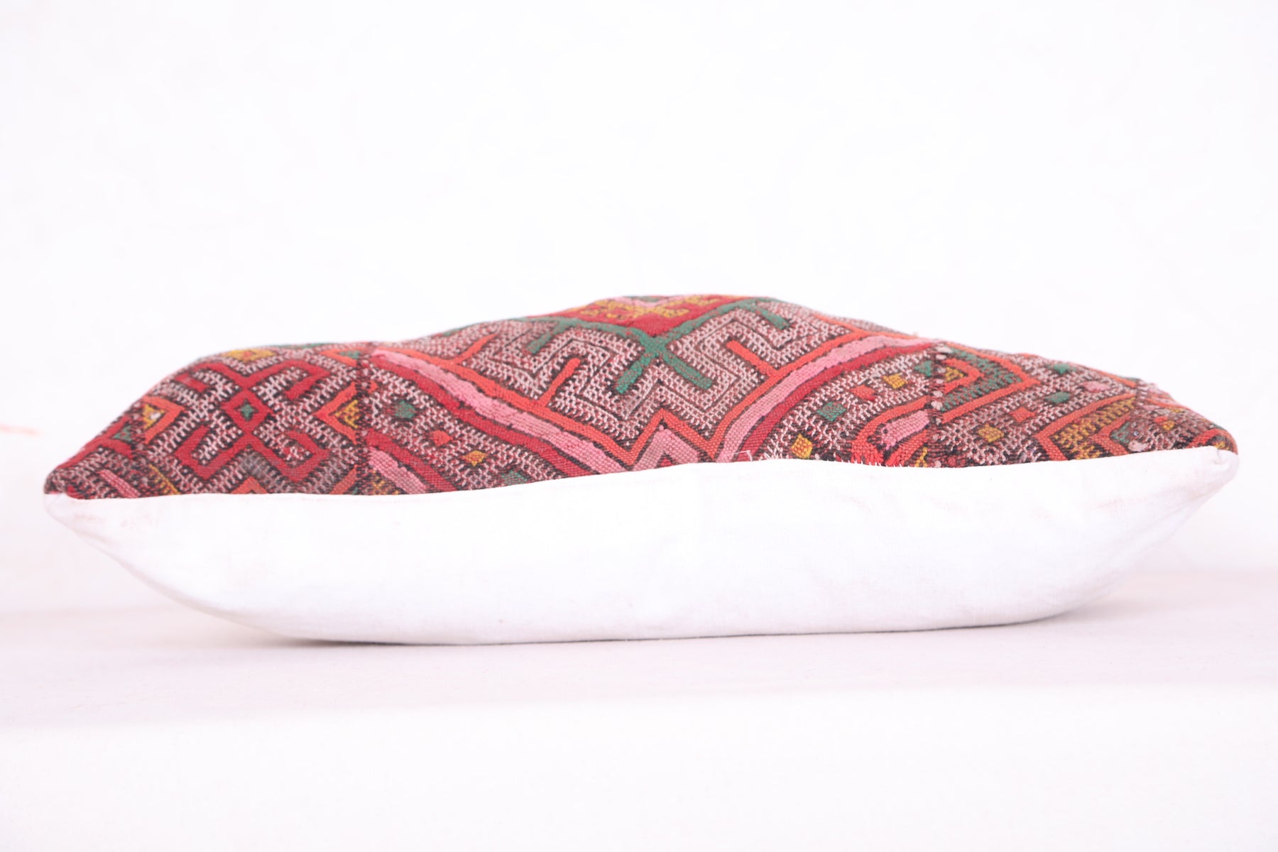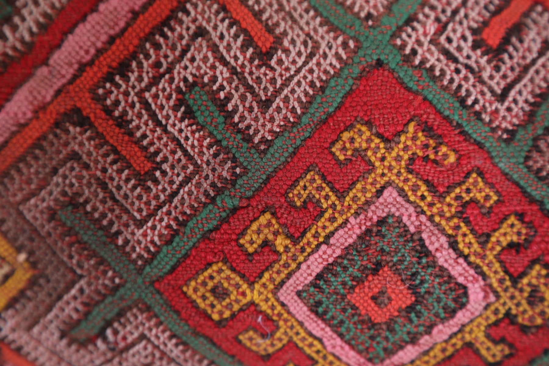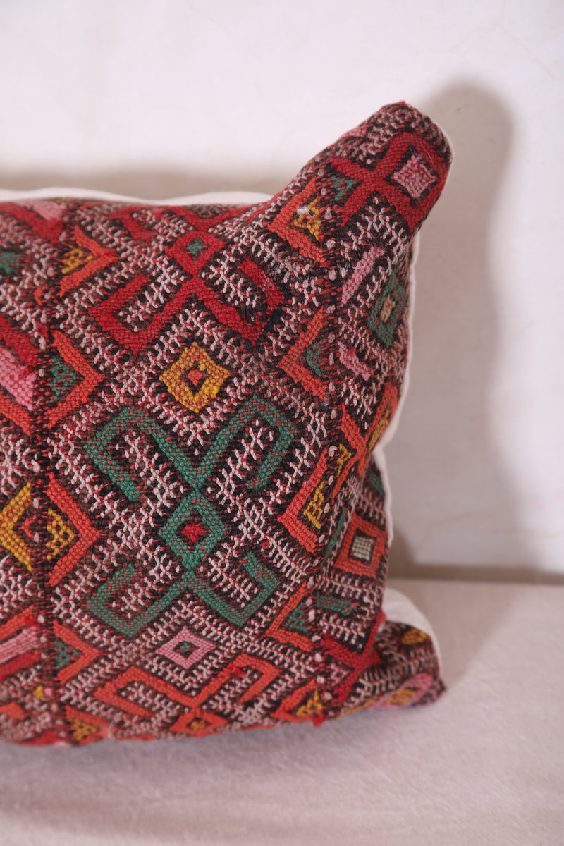 Made from vintage wool and cotton, the pillow features vibrant red, pink, and earthy tones, with intricate tribal and geometric patterns that capture the beauty of traditional Moroccan textiles. Each pillow is a one-of-a-kind creation, making it a truly unique statement piece for your home.