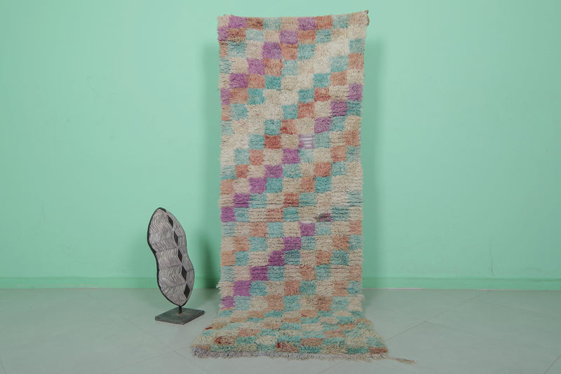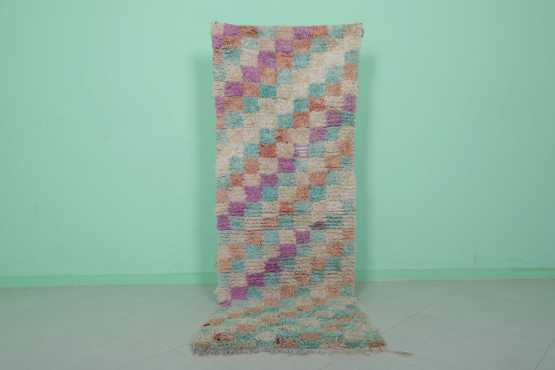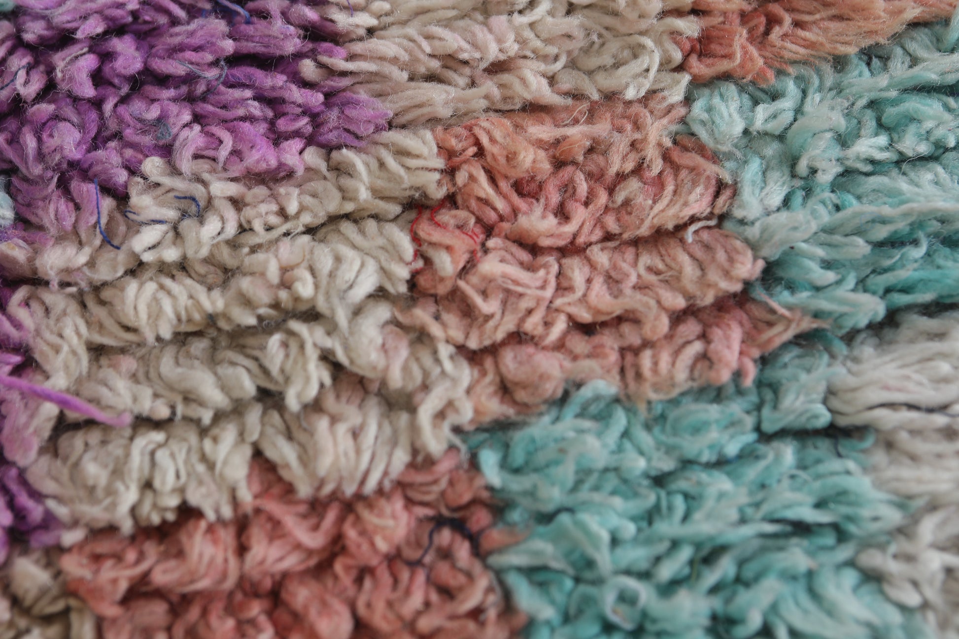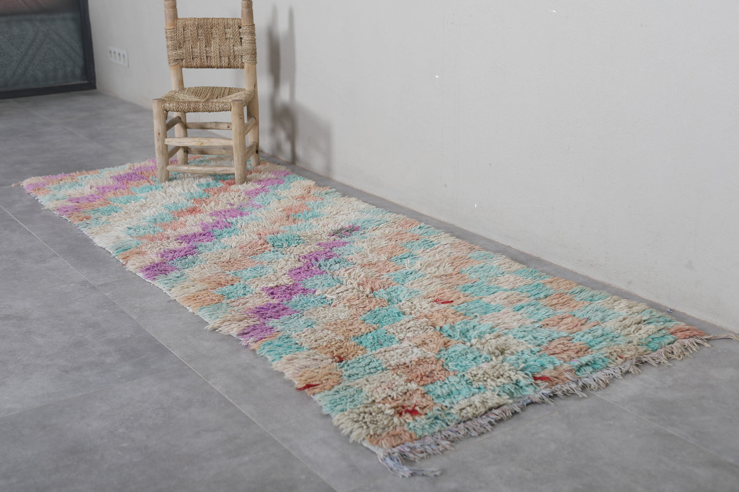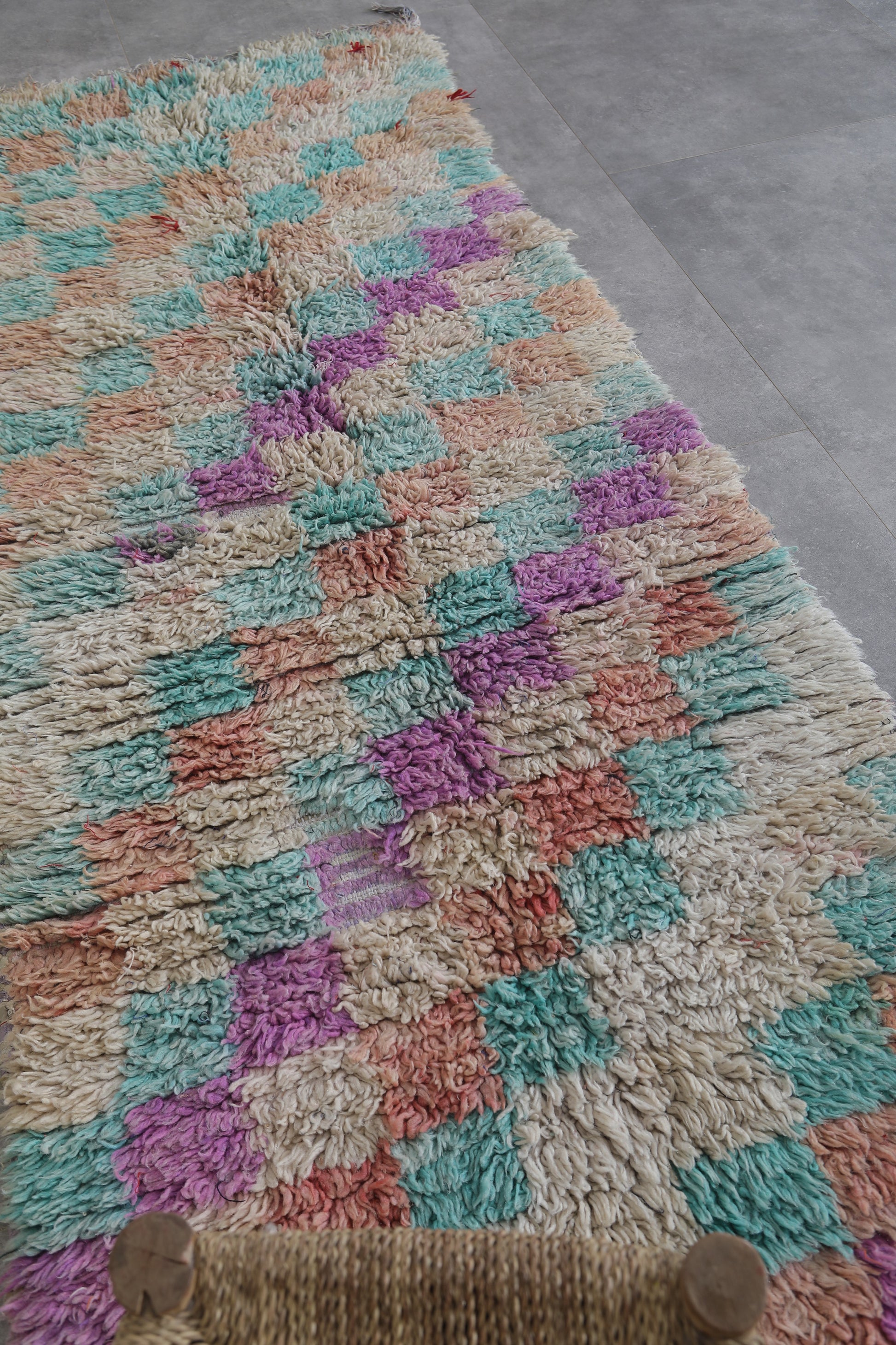 Add playful charm and warmth to your space with this Long Colorful Moroccan Rug Shag, sized at 2.7 x 7.5 feet. Handwoven in Morocco from wool, this vibrant rug features a mesmerizing checkered pattern in a rainbow of pastel tones—lavender, teal, rose, peach, and mint—creating a soothing yet lively vibe. The high-pile shag adds a soft, cushioned feel, making it perfect for hallways, reading nooks, or cozy creative corners.