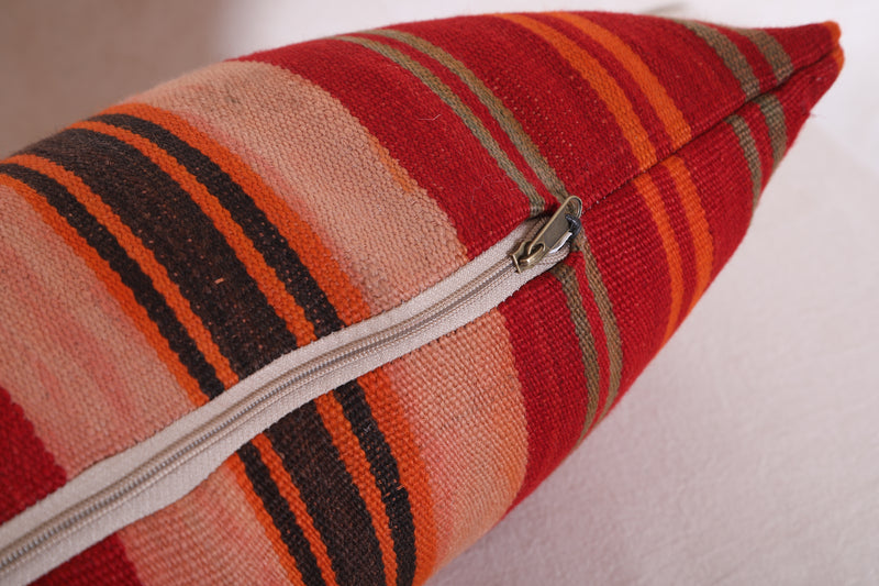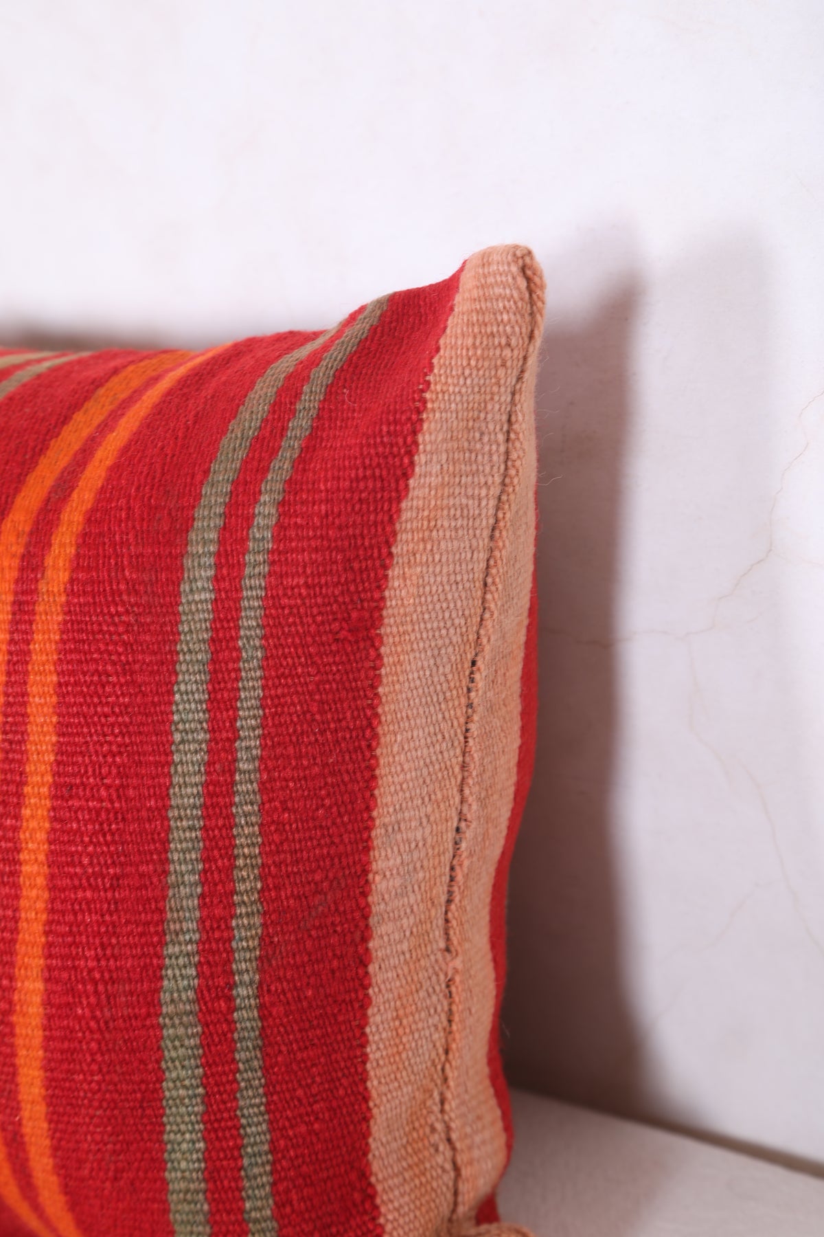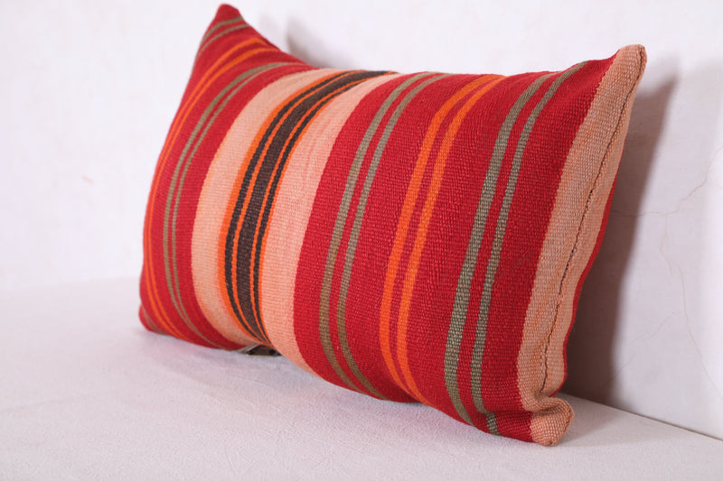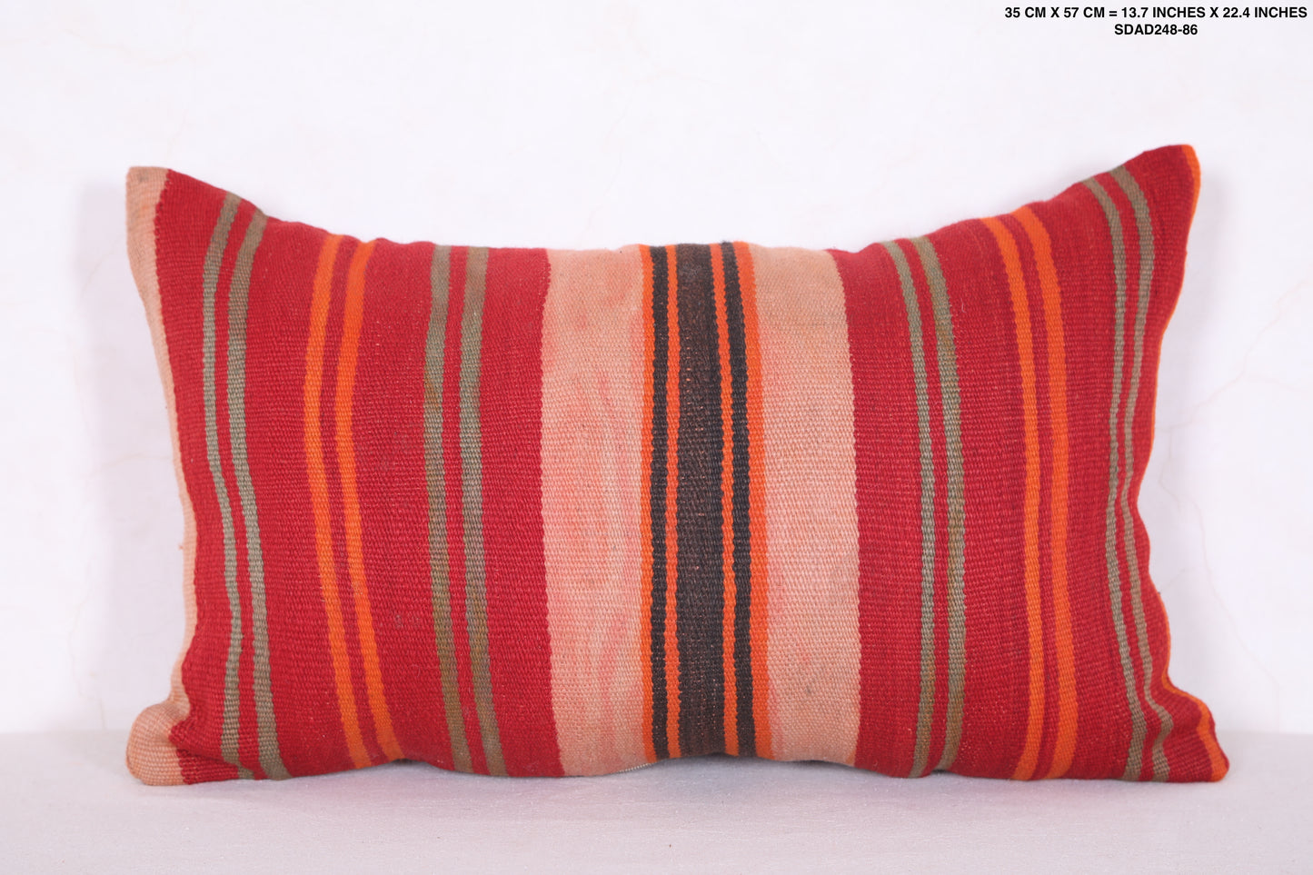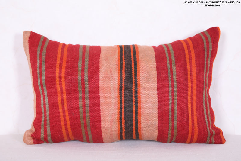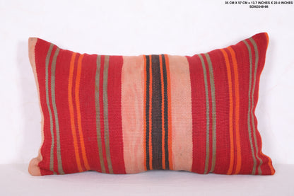 Add a bold pop of color and handcrafted artistry to your home with this handwoven Kilim Moroccan Pillow, sized at 13.7 x 22.4 inches (35 CM x 57 CM). Featuring vibrant red and earthy stripe patterns, this pillow blends traditional Moroccan craftsmanship with timeless elegance. Perfect for enhancing your sofa, bed, or favorite reading nook, it brings global charm to any space.