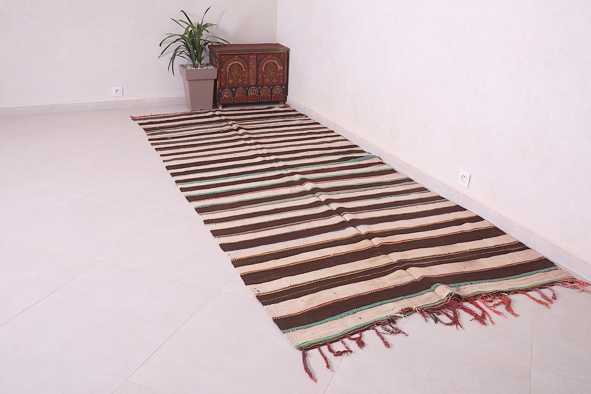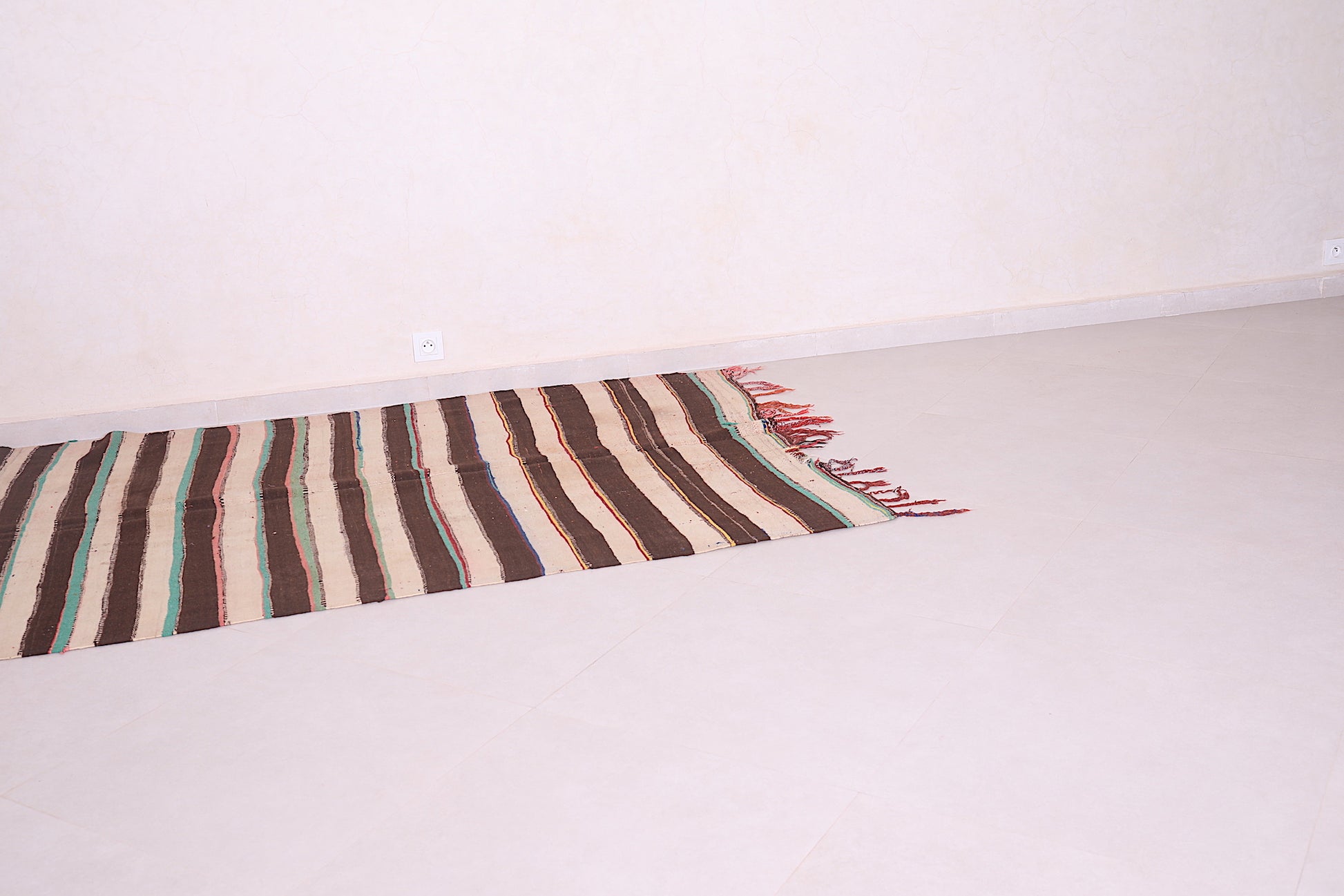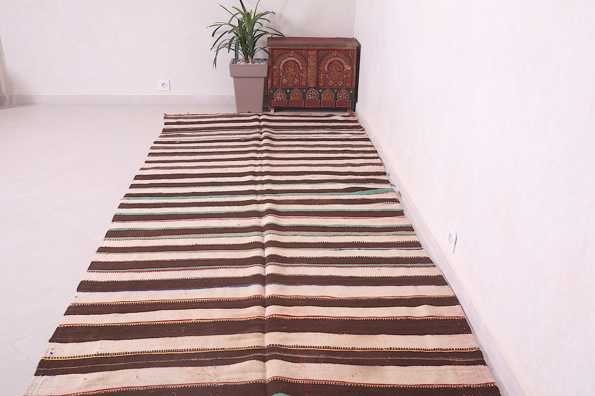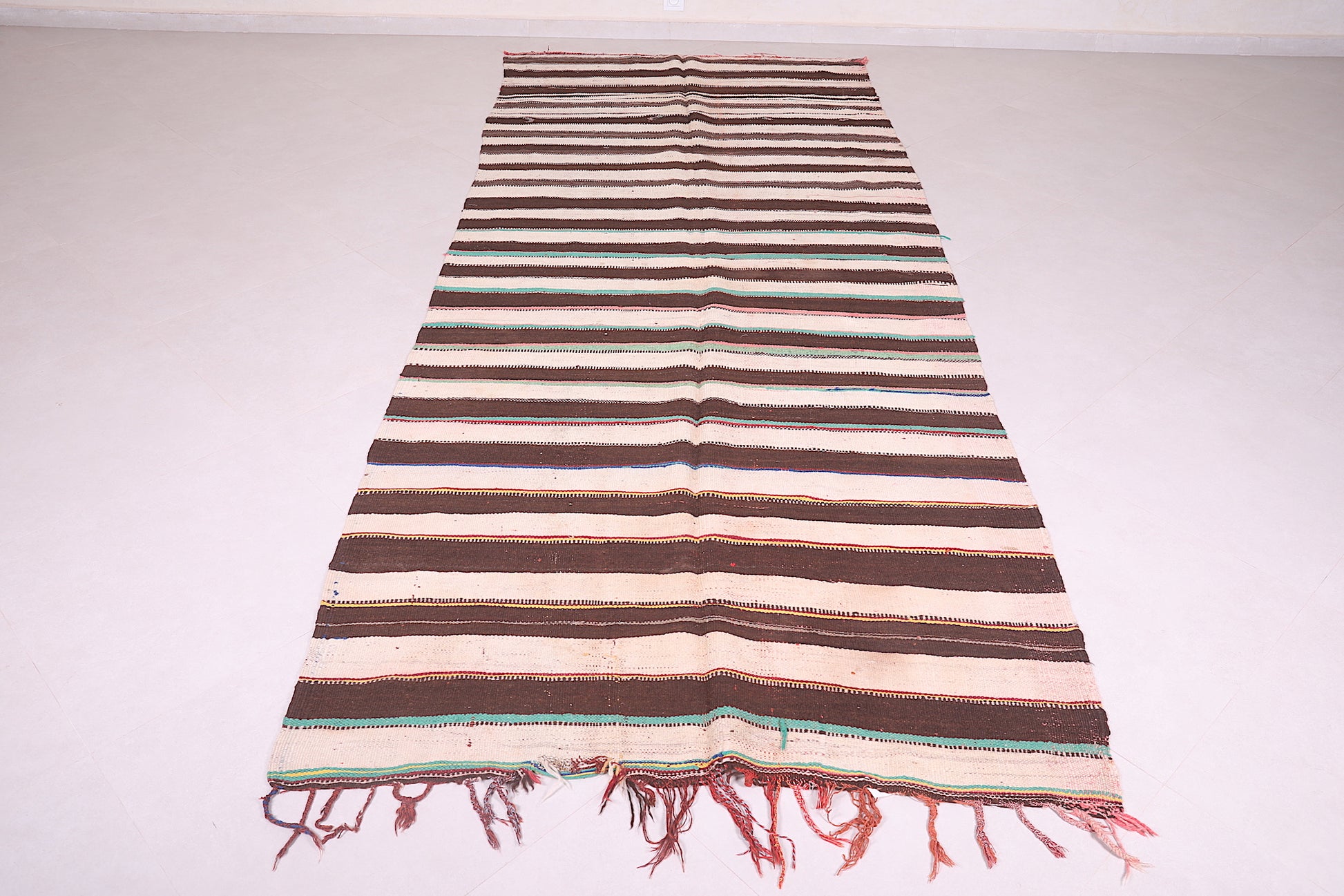 This 4.5 x 11 feet long Moroccan handwoven Kilim rug features a classic black and white striped design, offering a timeless and versatile look for any compact space. Perfect for layering or as a bold standalone accent, it enhances everything from bedrooms to cozy nooks.