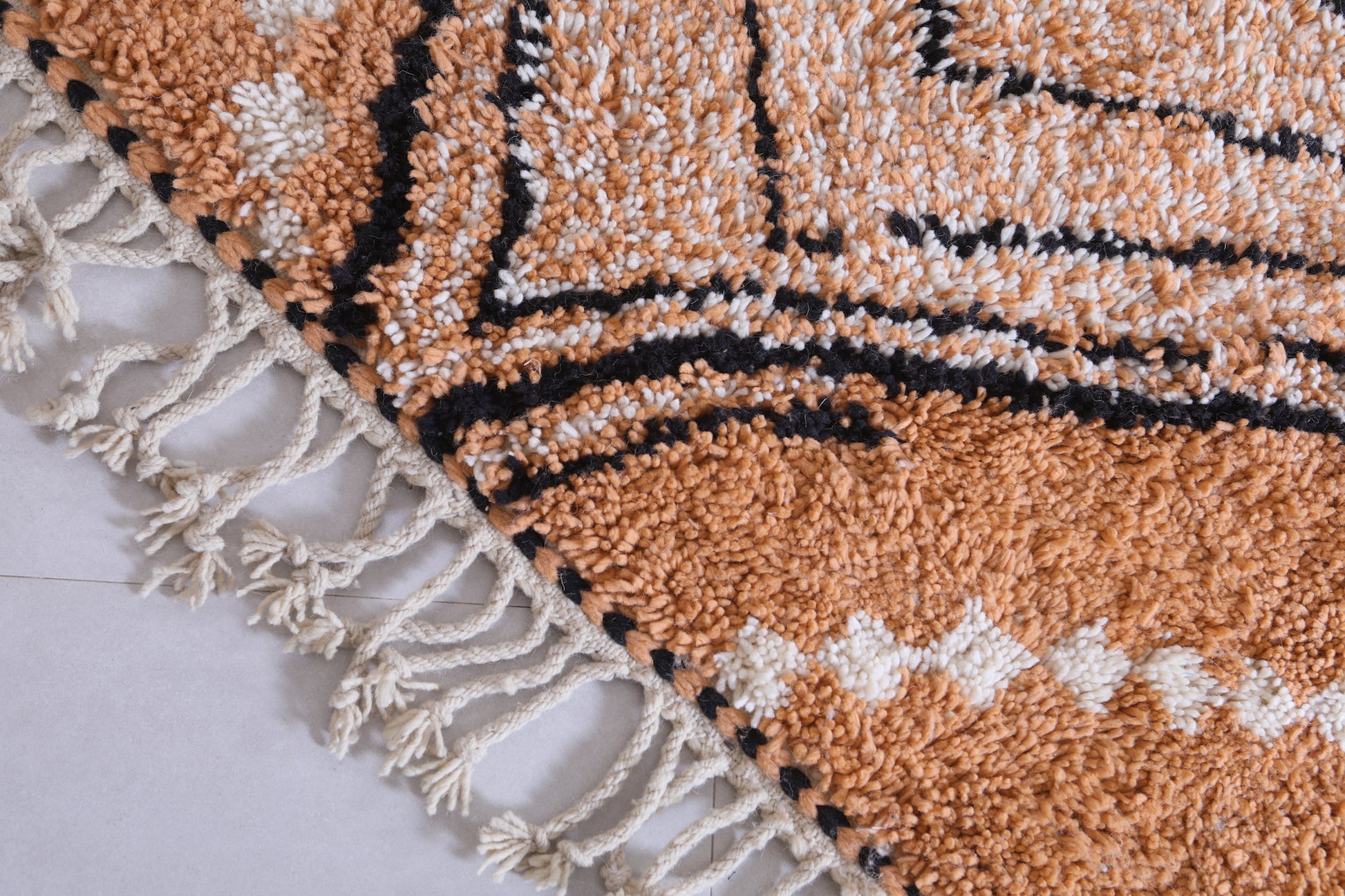 Add warmth and character to your space with this striking handmade Moroccan rug, featuring a rich burnt orange base with intricate ivory and black geometric tribal patterns. Expertly handwoven by skilled artisans, this wool rug brings texture, culture, and a bold statement to any living room, bedroom, or boho-inspired interior. A perfect blend of tradition and modern style, this Berber rug is a timeless piece of Moroccan craftsmanship.