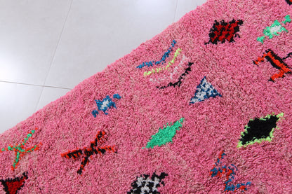 Add a playful pop of color to your home with this vibrant pink Moroccan rug, handcrafted from 100% wool by skilled artisans. Featuring a traditional Berber design with multicolored abstract symbols, this one-of-a-kind rug brings a joyful, bohemian spirit to any space. Perfect for brightening up living rooms, bedrooms, or creative spaces, its plush texture and bold palette offer both comfort and visual interest. A true statement piece for lovers of eclectic and artistic interiors.