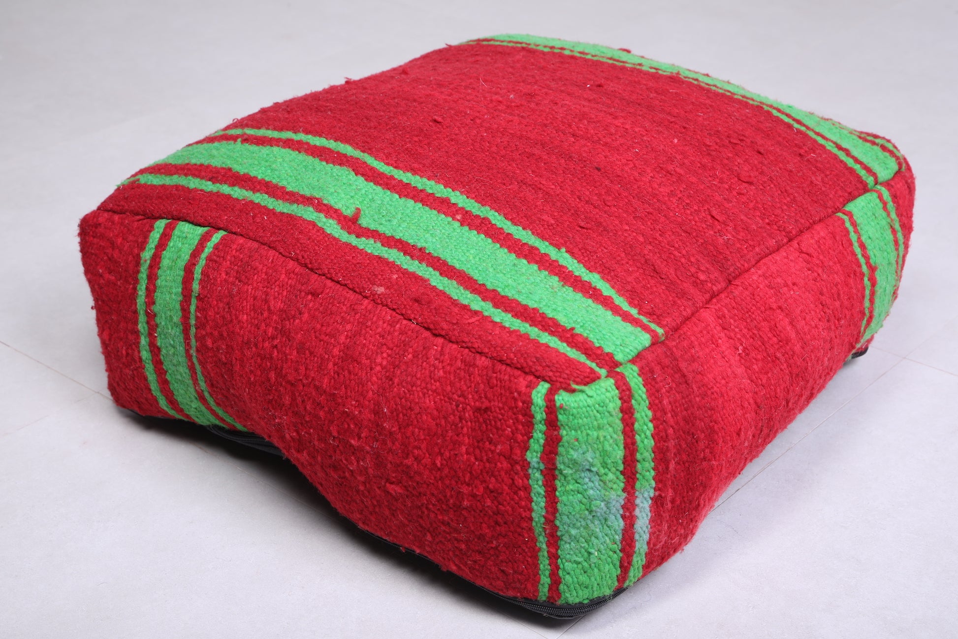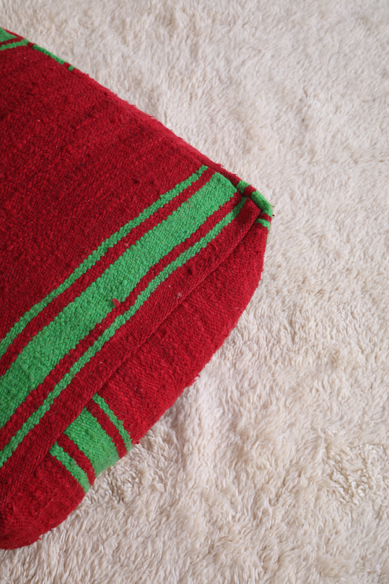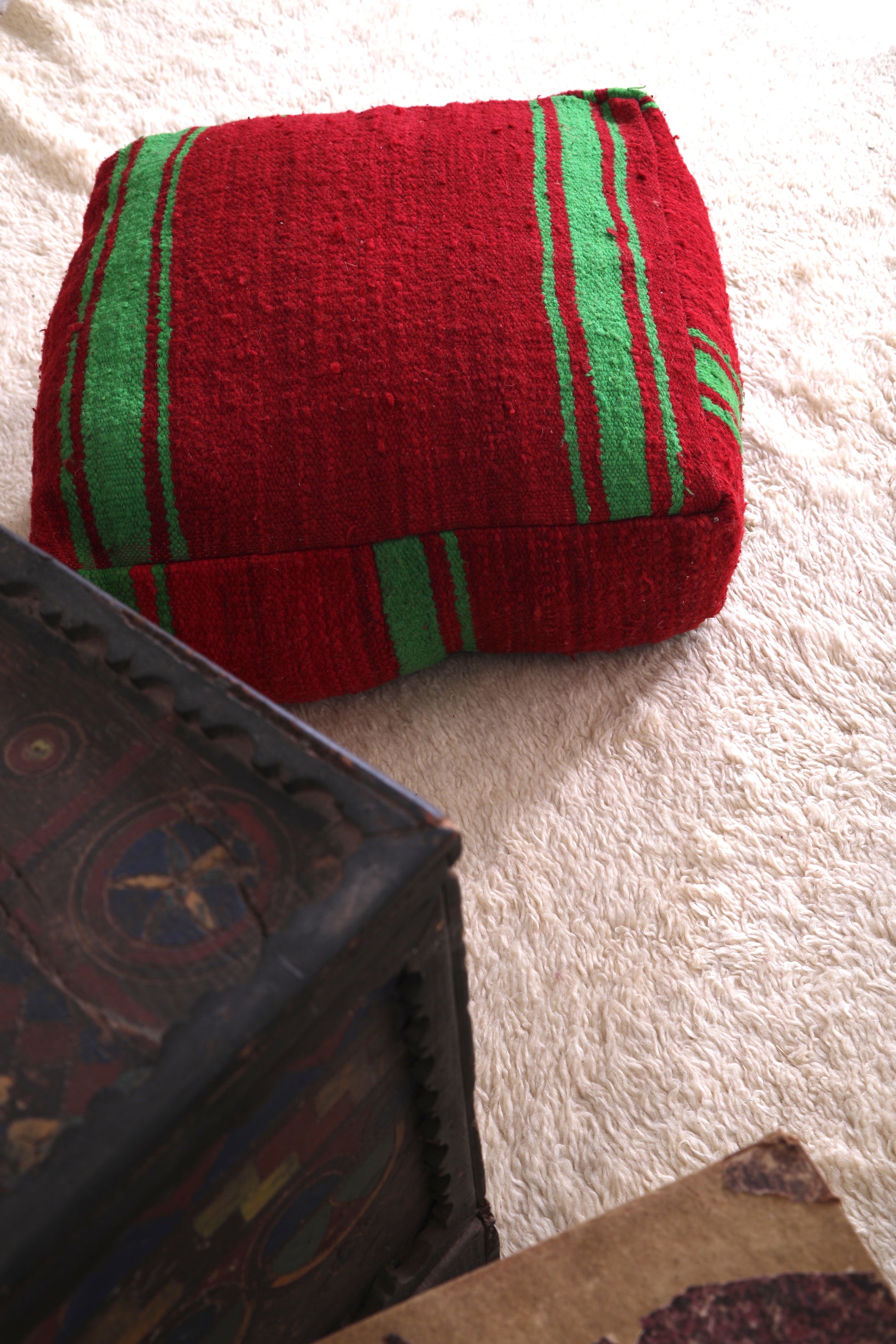 Elevate your floor space with this bold Moroccan Berber pouf, handwoven from a vintage wool rug in vivid red and green tones. A simple yet powerful design that makes a statement in boho, eclectic, or minimalist interiors.