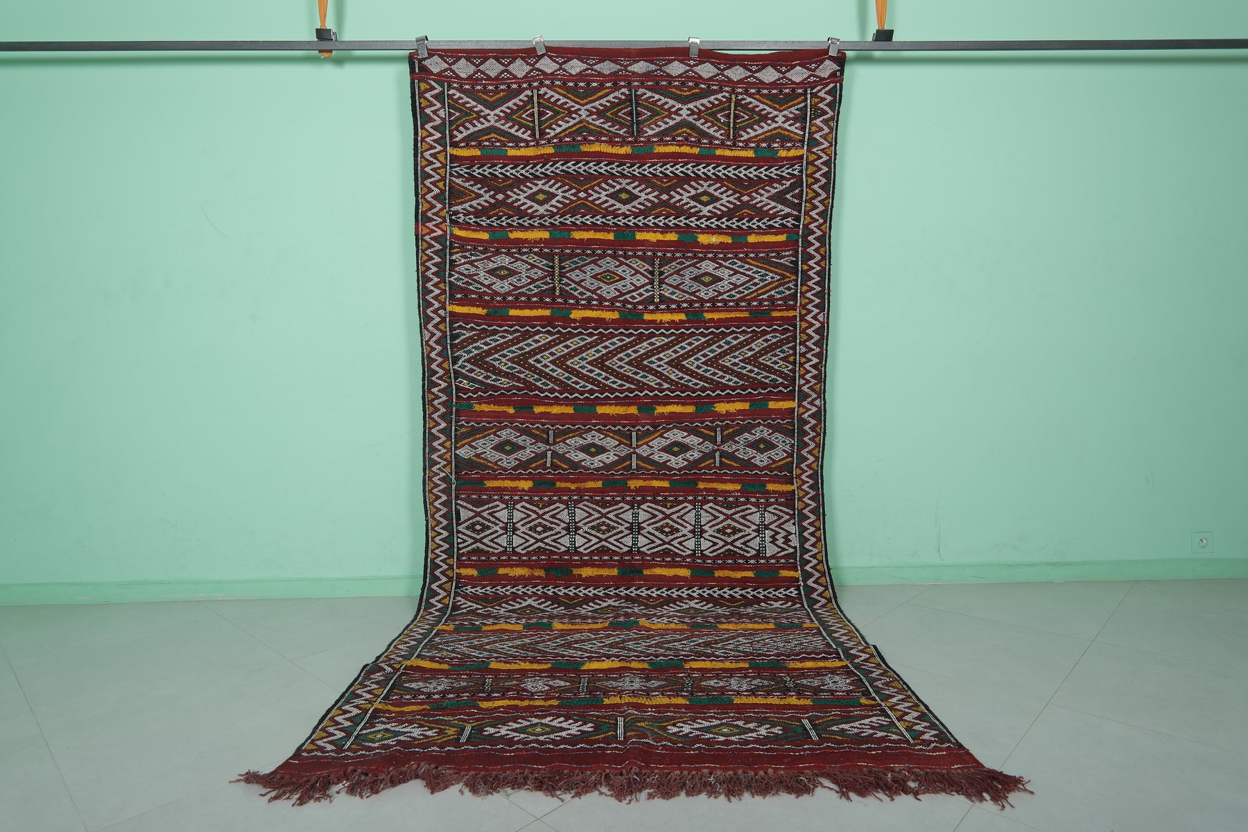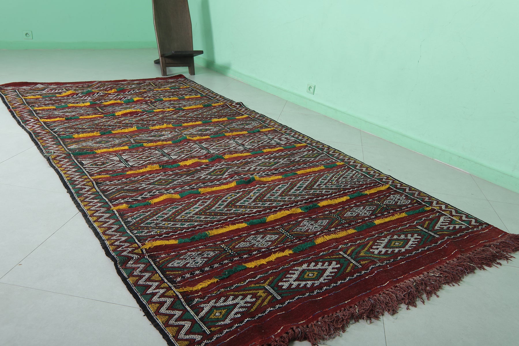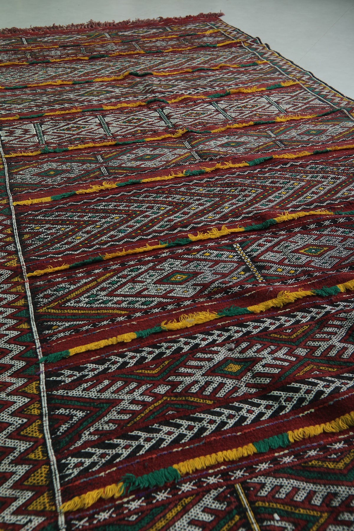 • Showcases intricate Berber-inspired geometric patterns in earthy red, yellow, and black tones.