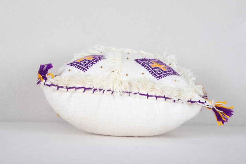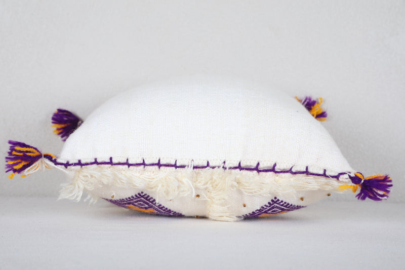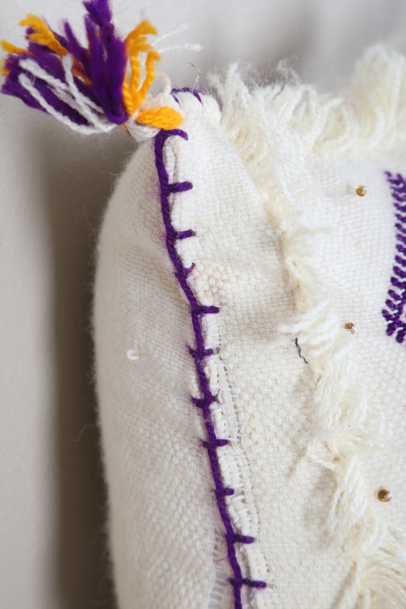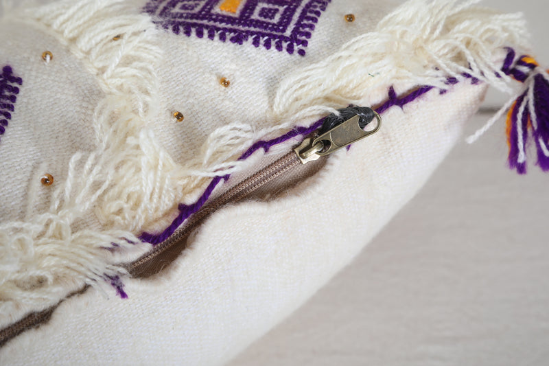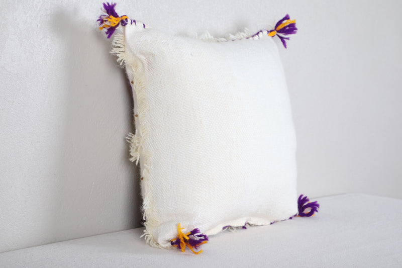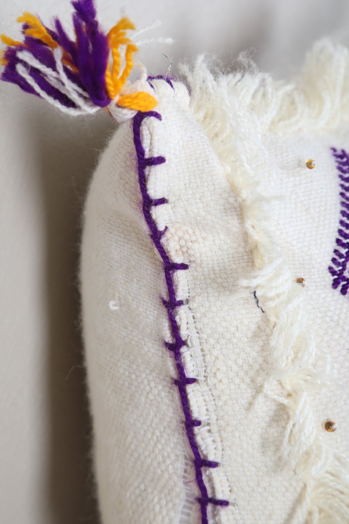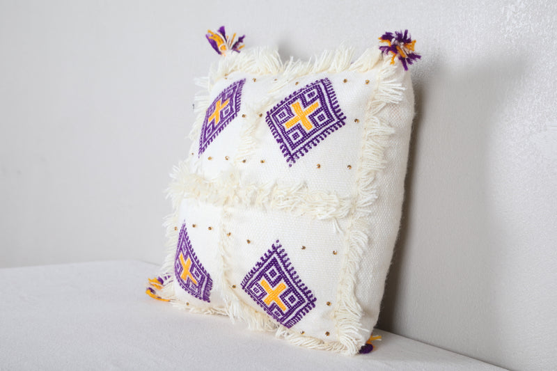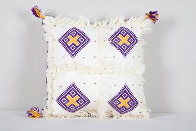 Add a touch of timeless elegance to your home with this handwoven Vintage Moroccan Pillow, sized at 14.9 x 14.9 inches (38 CM x 38 CM). Featuring a soft ivory base with vibrant purple and gold diamond embroidery, this pillow blends authentic Moroccan craftsmanship with refined charm. Perfect for enhancing your sofa, bed, or favorite armchair, it brings a pop of color and global artistry to any space.