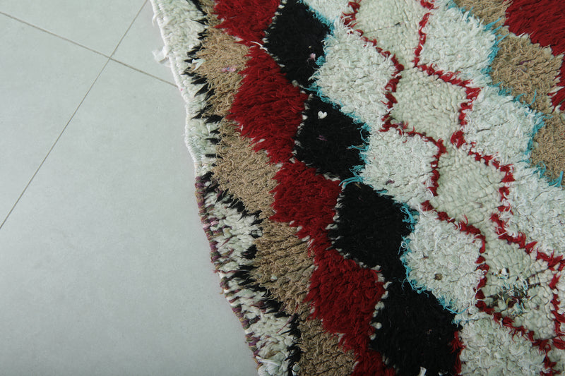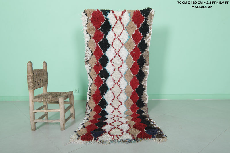 Bring a touch of Moroccan heritage to your home with this vibrant Berber rug, measuring 2.2 x 5.9 feet. Featuring a striking diamond pattern in bold shades of red, black, beige, and white, this handmade rug adds depth and texture to any room. Perfect for narrow spaces like hallways or as a unique accent in your living area. The meticulous craftsmanship ensures durability, while the rich colors and geometric design make it a standout piece.