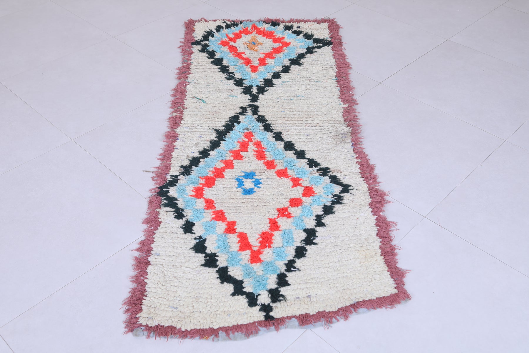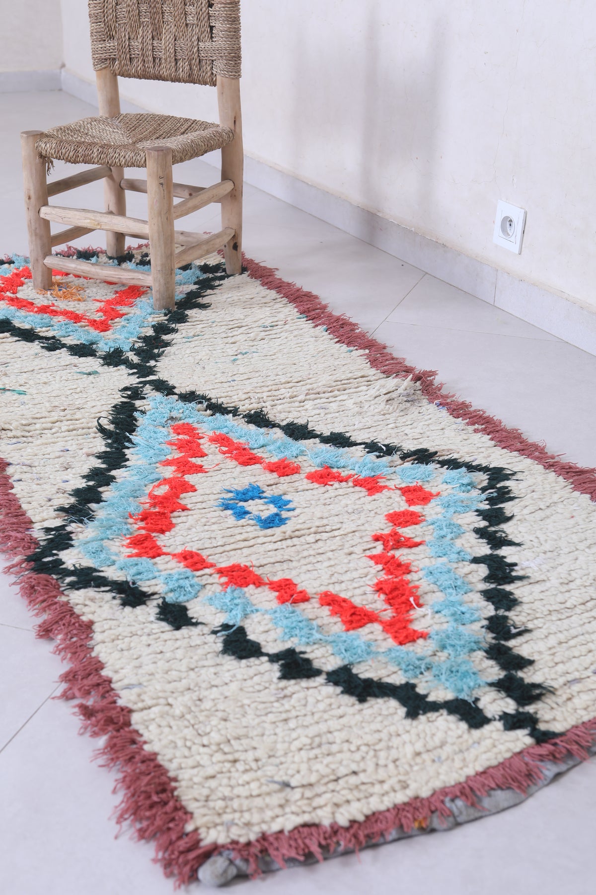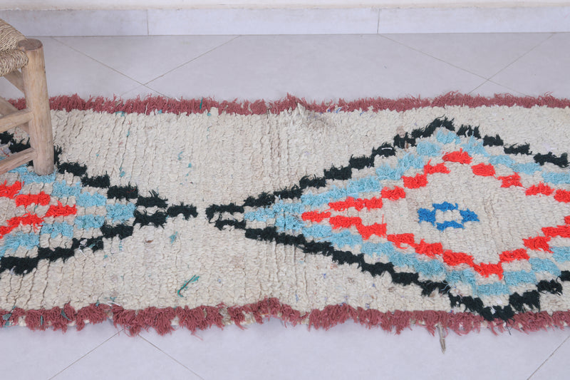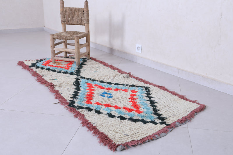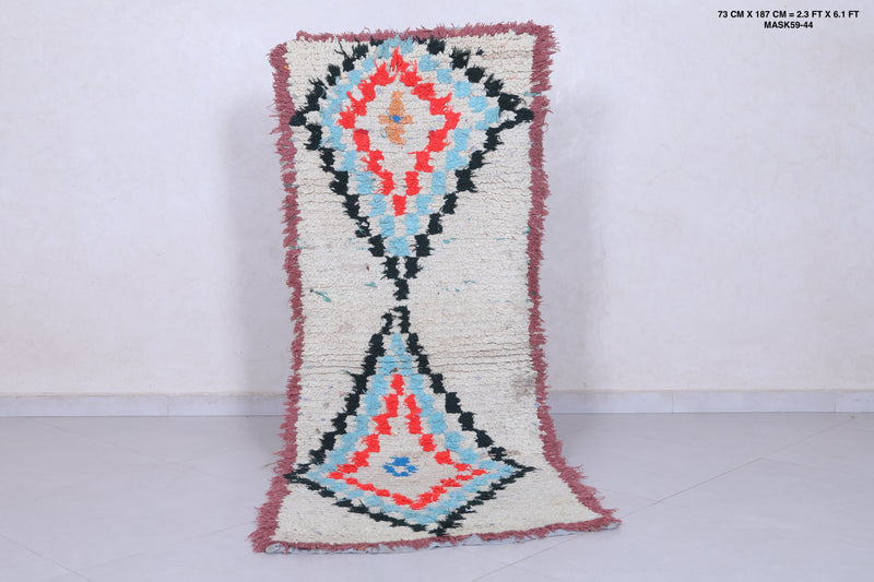 Elevate your décor with this 2.3 x 6.1 feet Moroccan Berber rug, showcasing vibrant geometric motifs. This handcrafted piece features a bold design with diamond-shaped medallions in striking shades of red, blue, and orange, bordered by a soft cream background. Its fringed edges and high-quality wool texture bring an authentic, artisanal touch to any space. Perfect for hallways, bedrooms, or living rooms, this rug seamlessly blends tradition with modern style. Add warmth and character to your home with this unique Berber creation.
