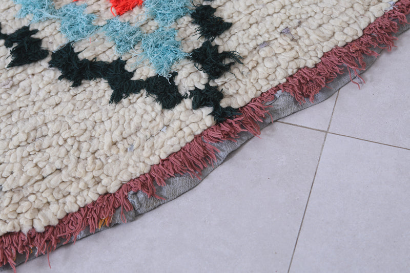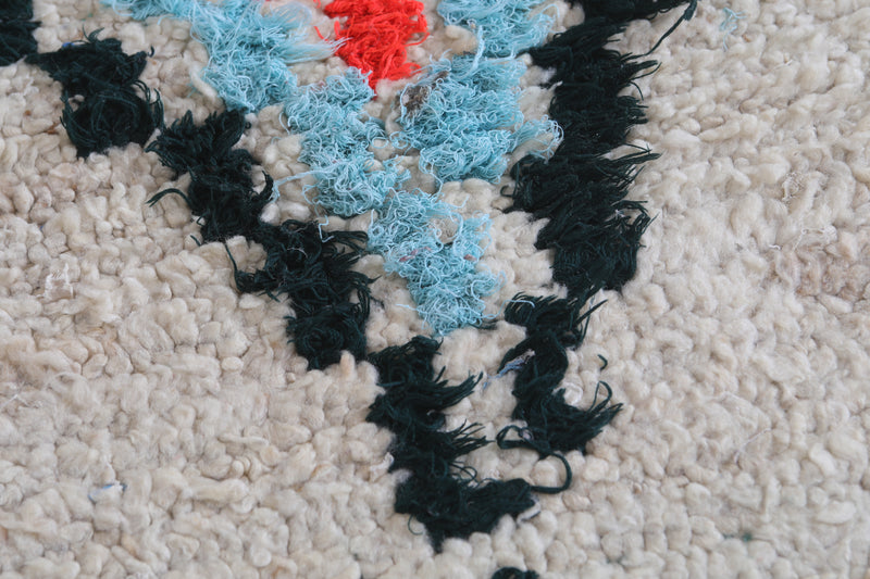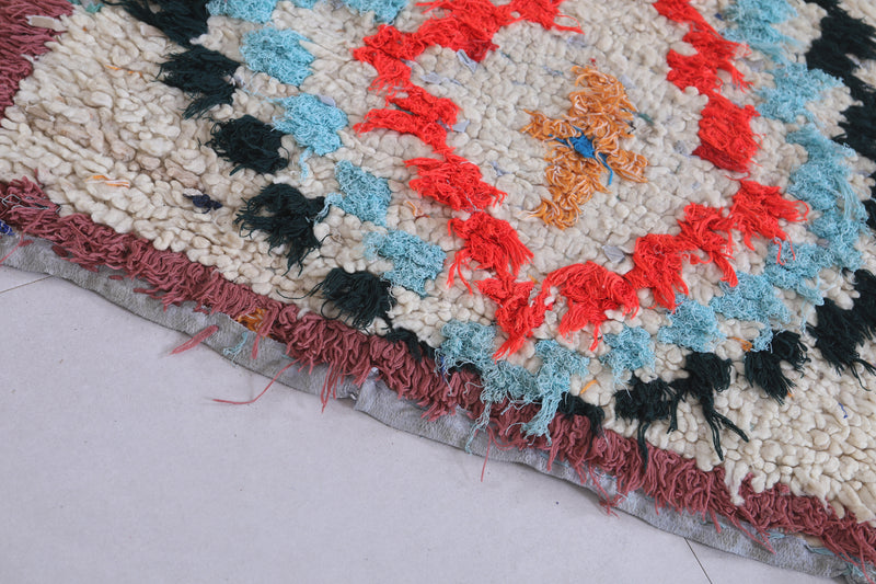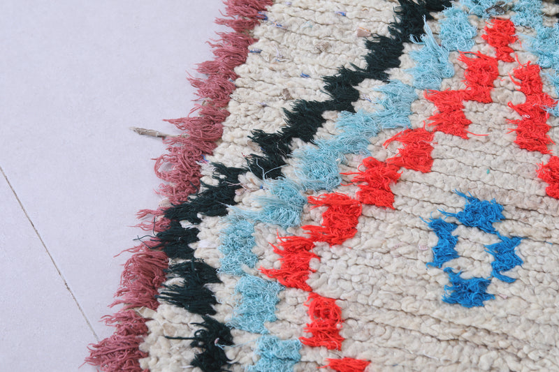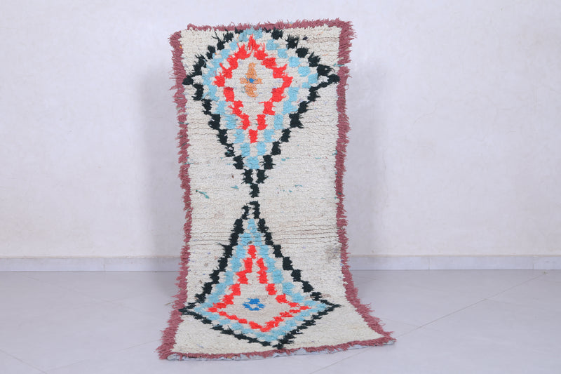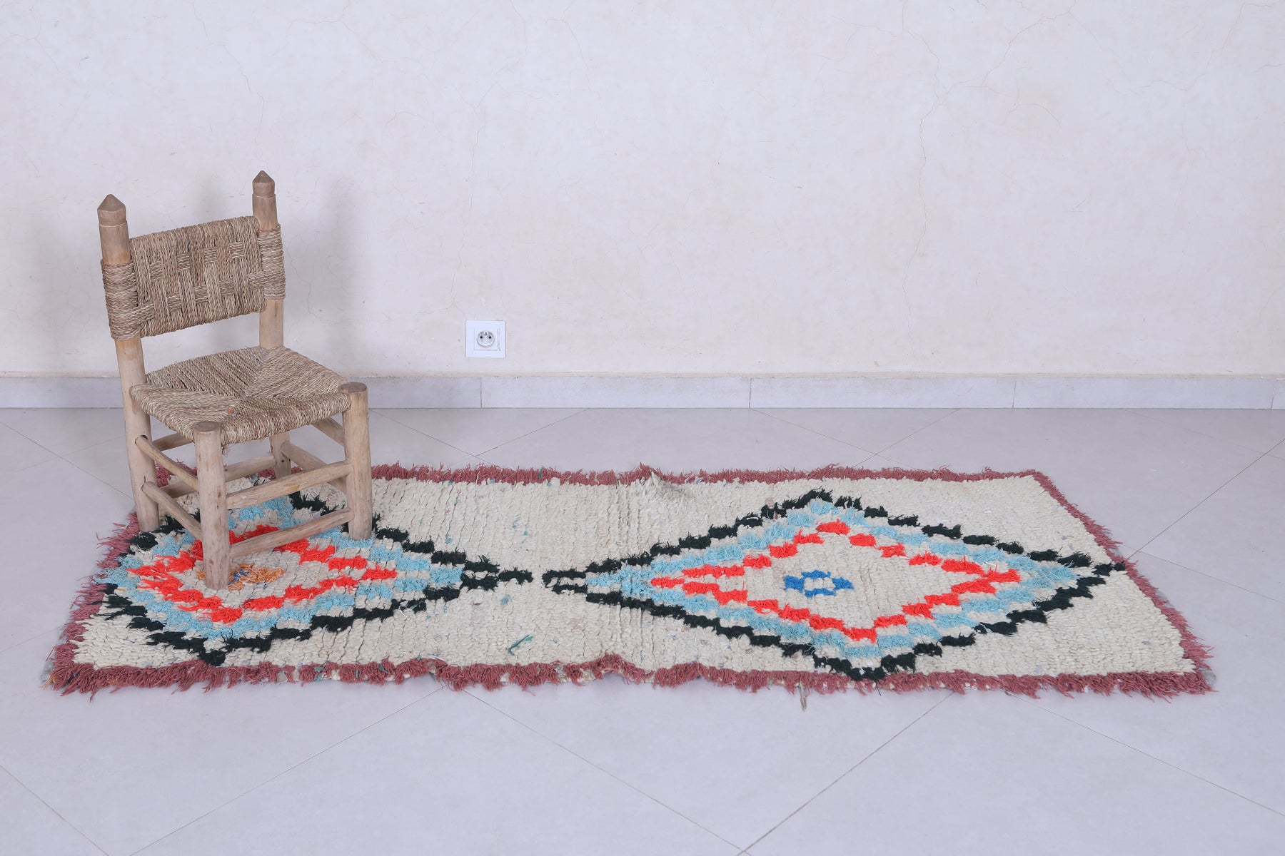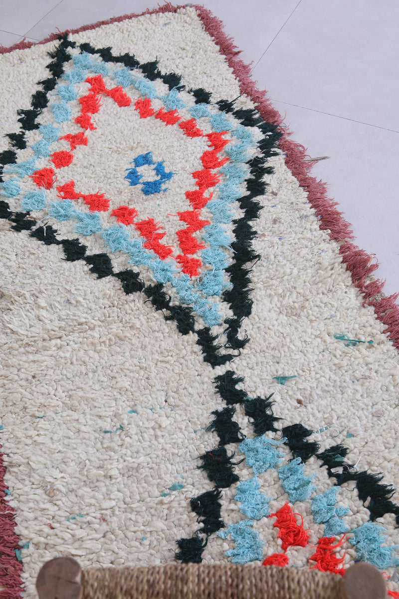 Elevate your décor with this 2.3 x 6.1 feet Moroccan Berber rug, showcasing vibrant geometric motifs. This handcrafted piece features a bold design with diamond-shaped medallions in striking shades of red, blue, and orange, bordered by a soft cream background. Its fringed edges and high-quality wool texture bring an authentic, artisanal touch to any space. Perfect for hallways, bedrooms, or living rooms, this rug seamlessly blends tradition with modern style. Add warmth and character to your home with this unique Berber creation.