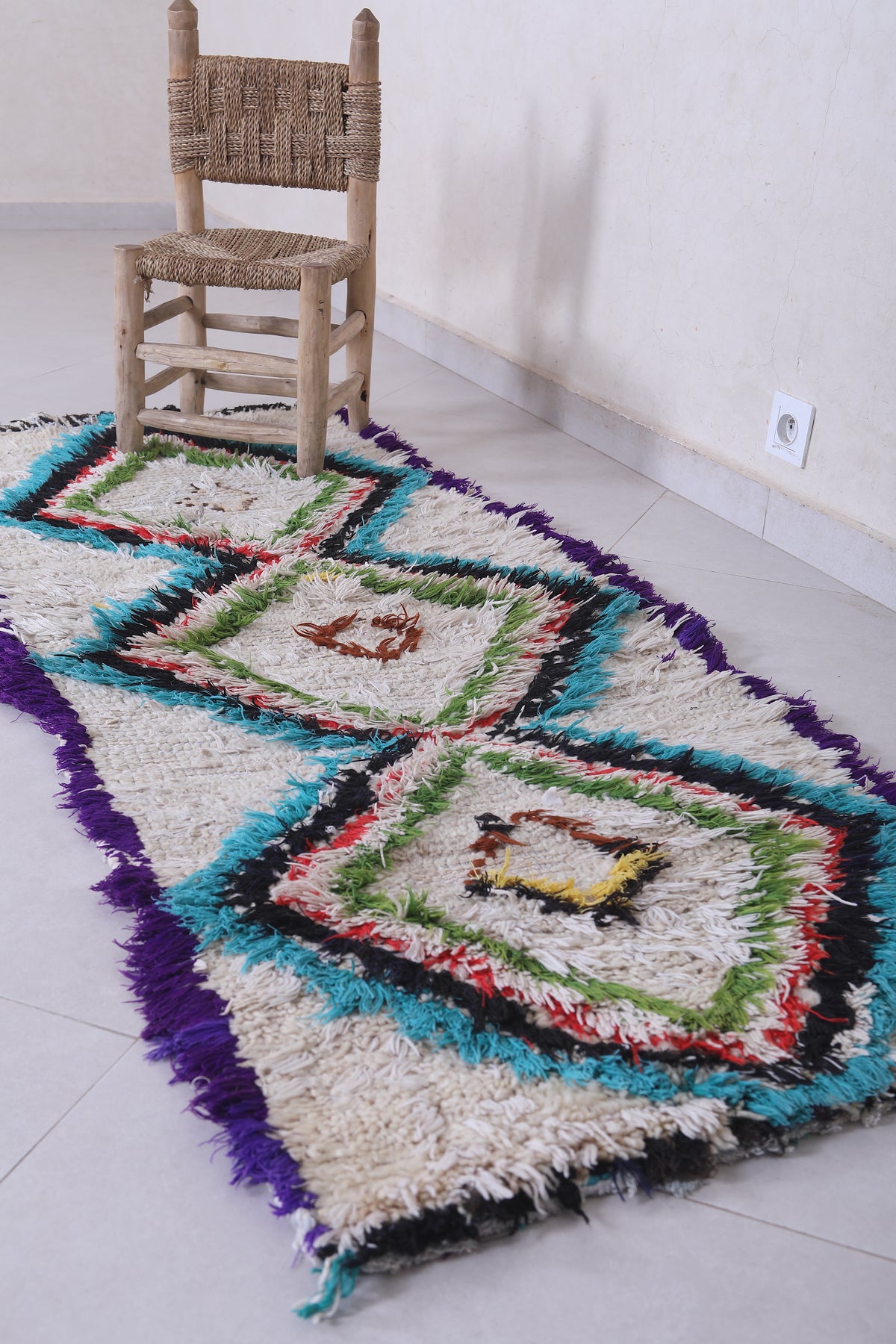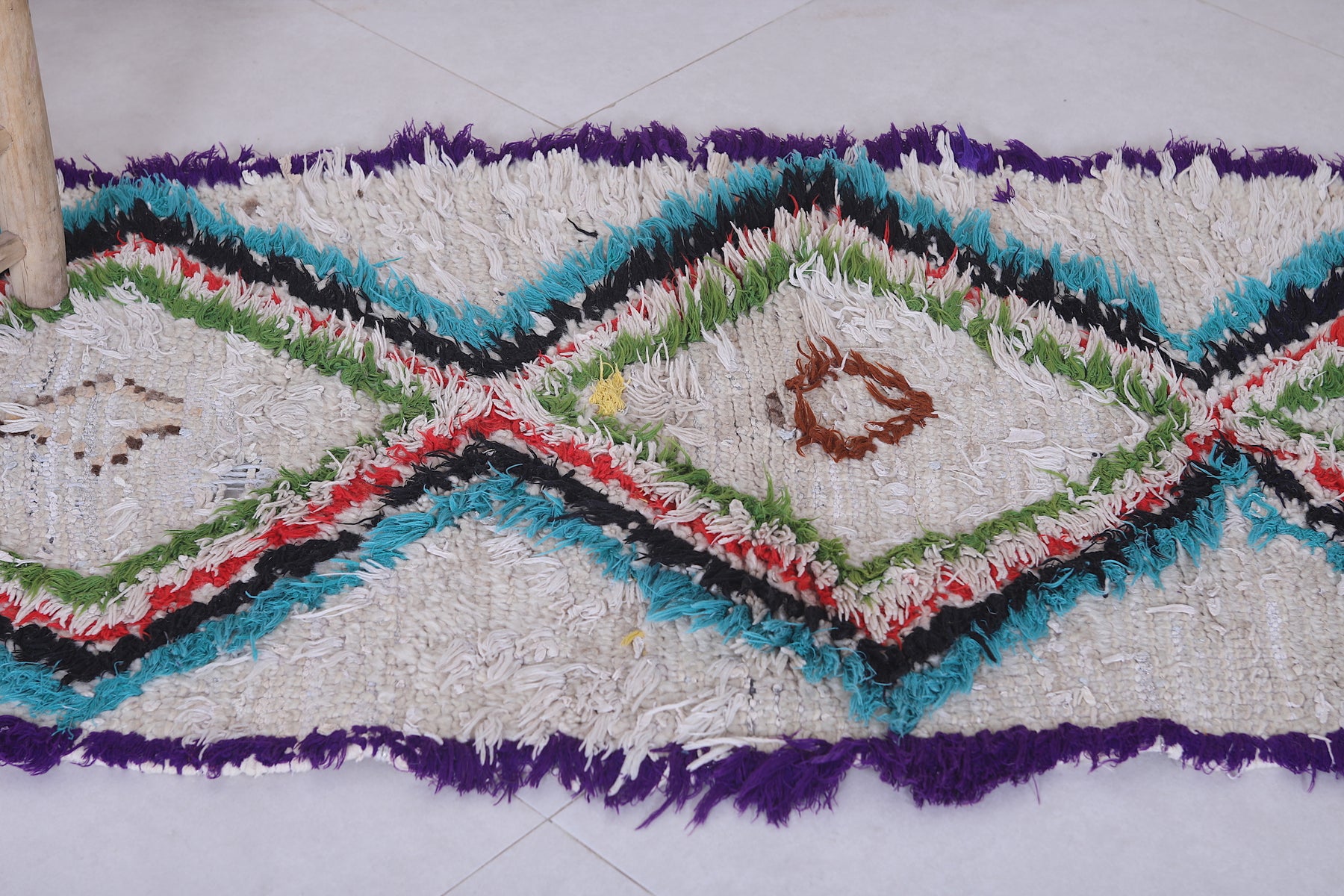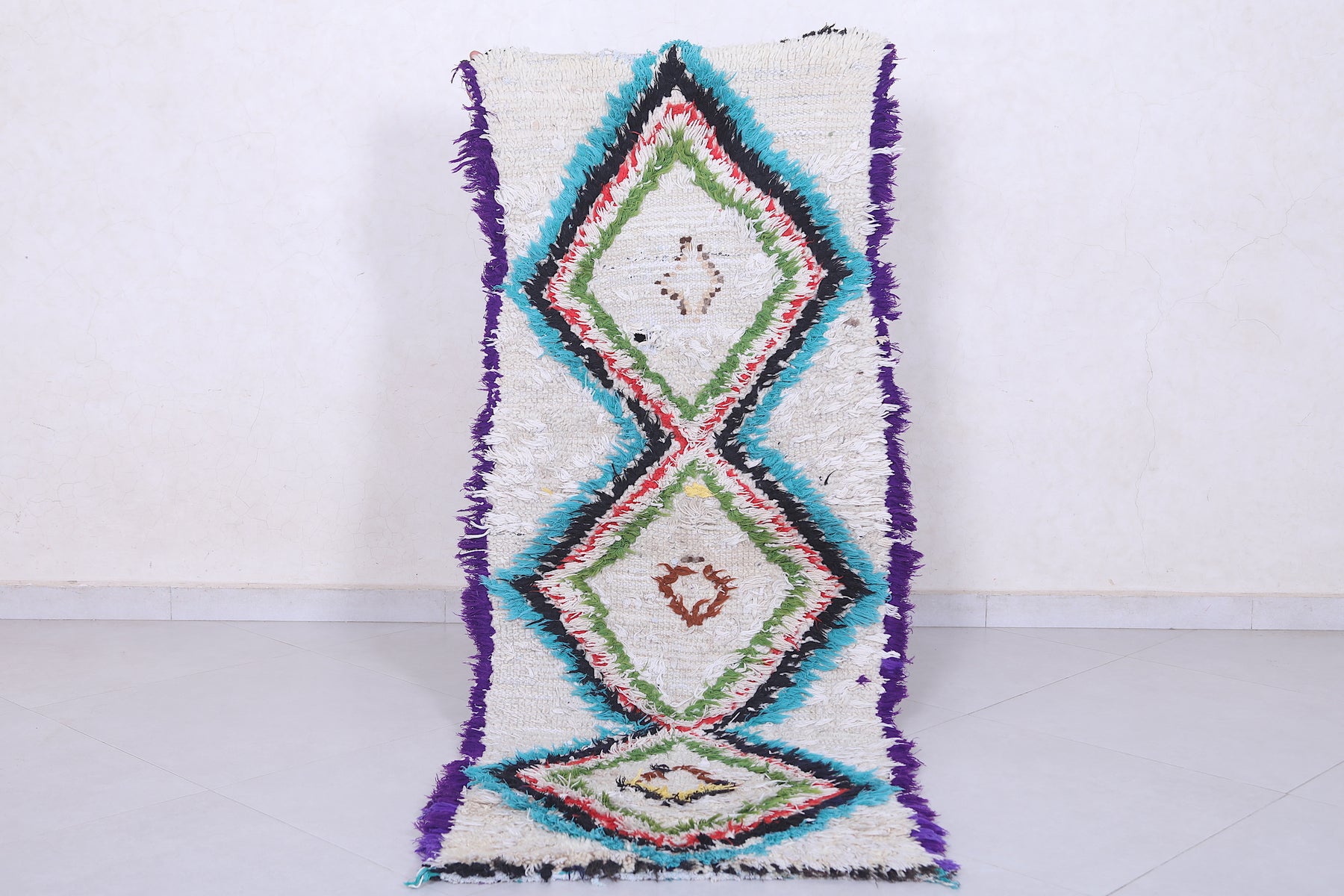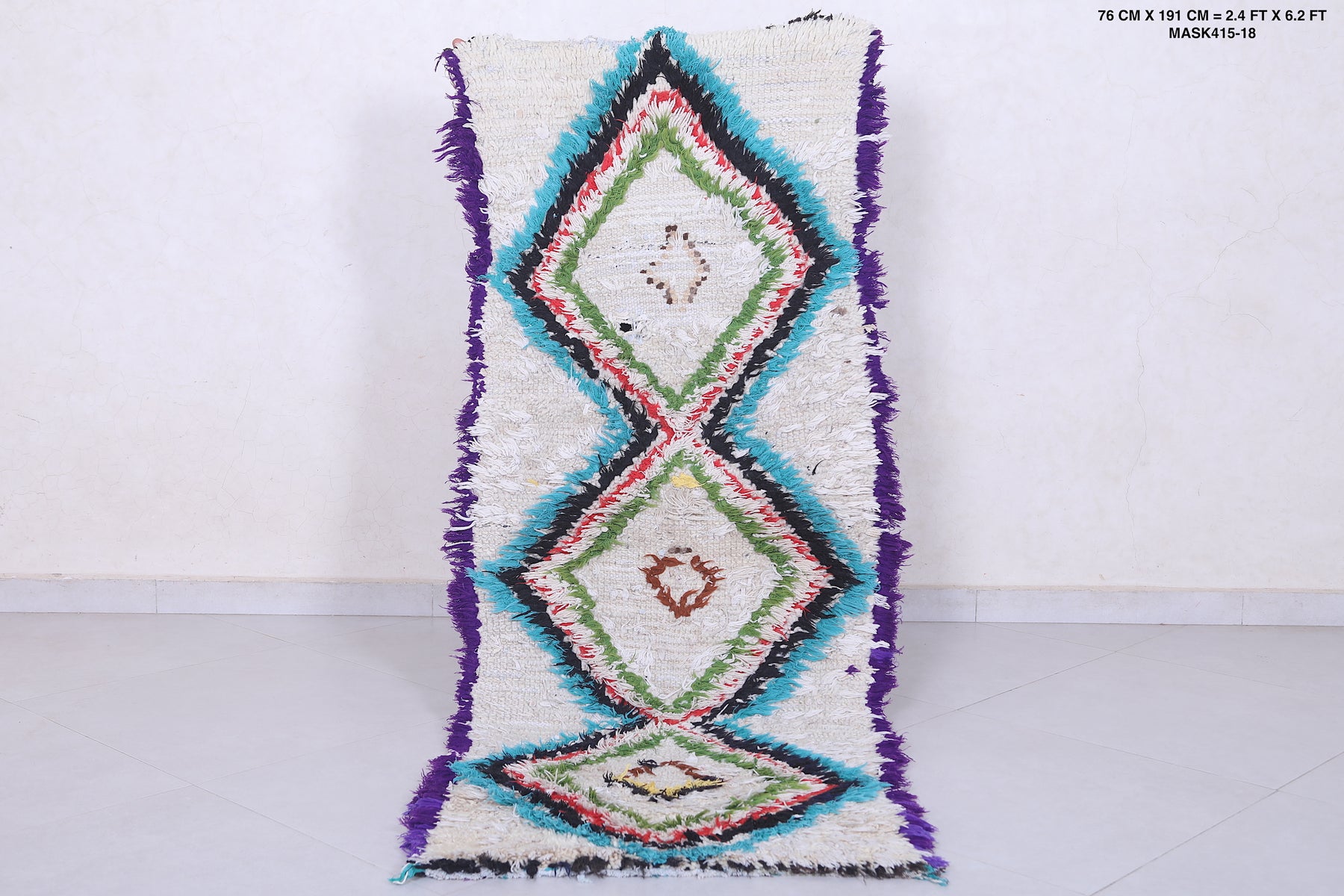 Add vibrancy to your home with this 2.4 x 6.2 feet Moroccan Berber rug. Featuring bold diamond patterns in striking hues of green, turquoise, red, and purple on a creamy white backdrop, this handwoven piece is a true statement of artistry. The intricate details, enhanced by a unique mix of colors, create an eye-catching focal point for any room. Perfect for hallways, living spaces, or bedrooms, this authentic rug combines traditional craftsmanship with modern charm.