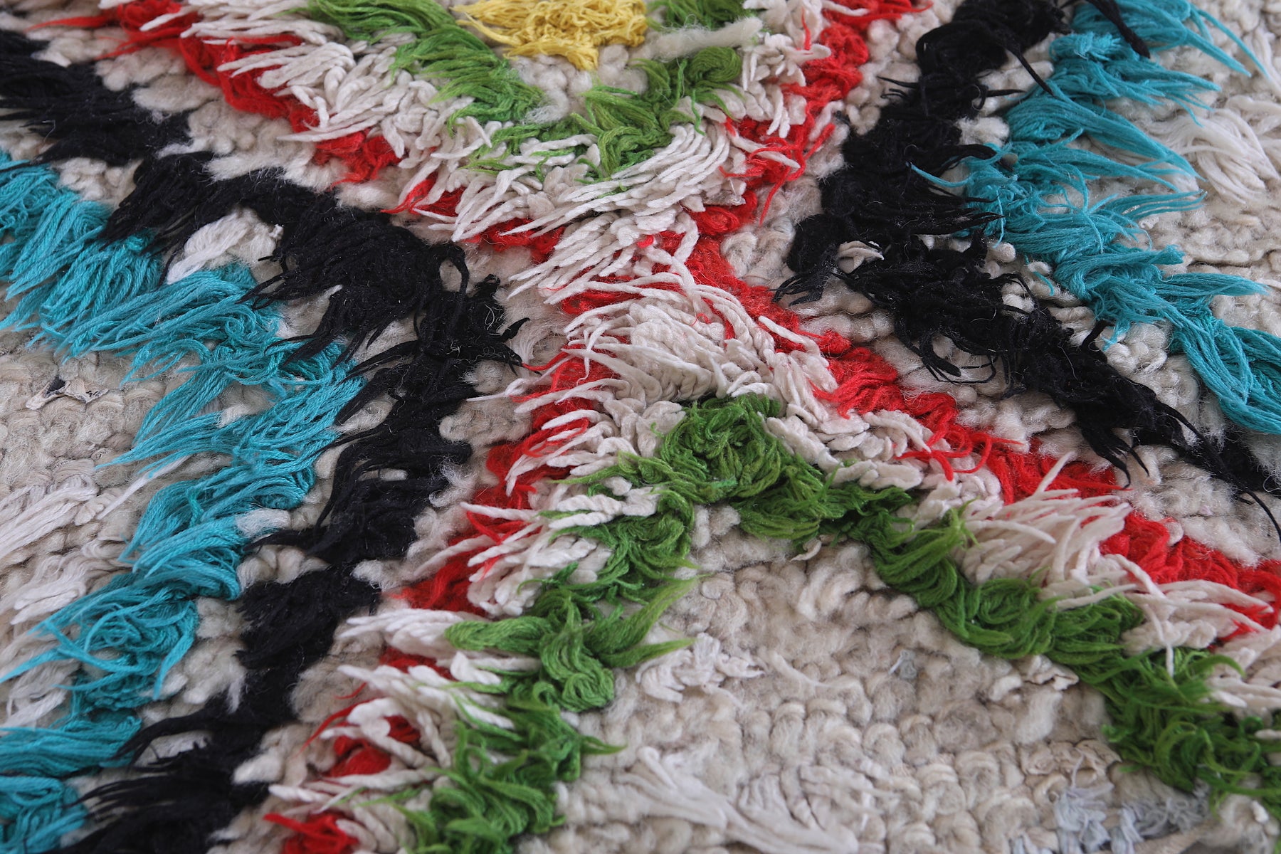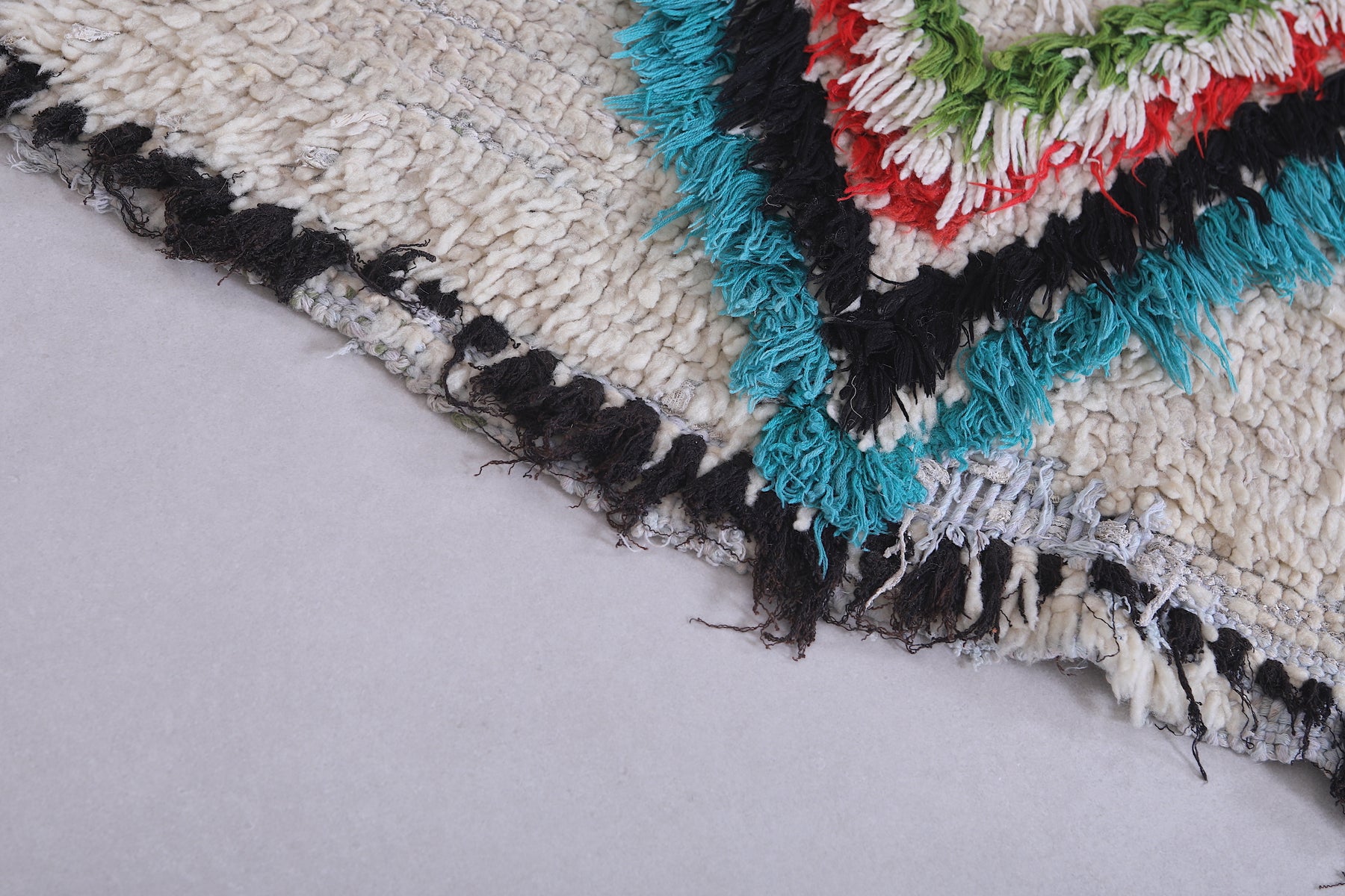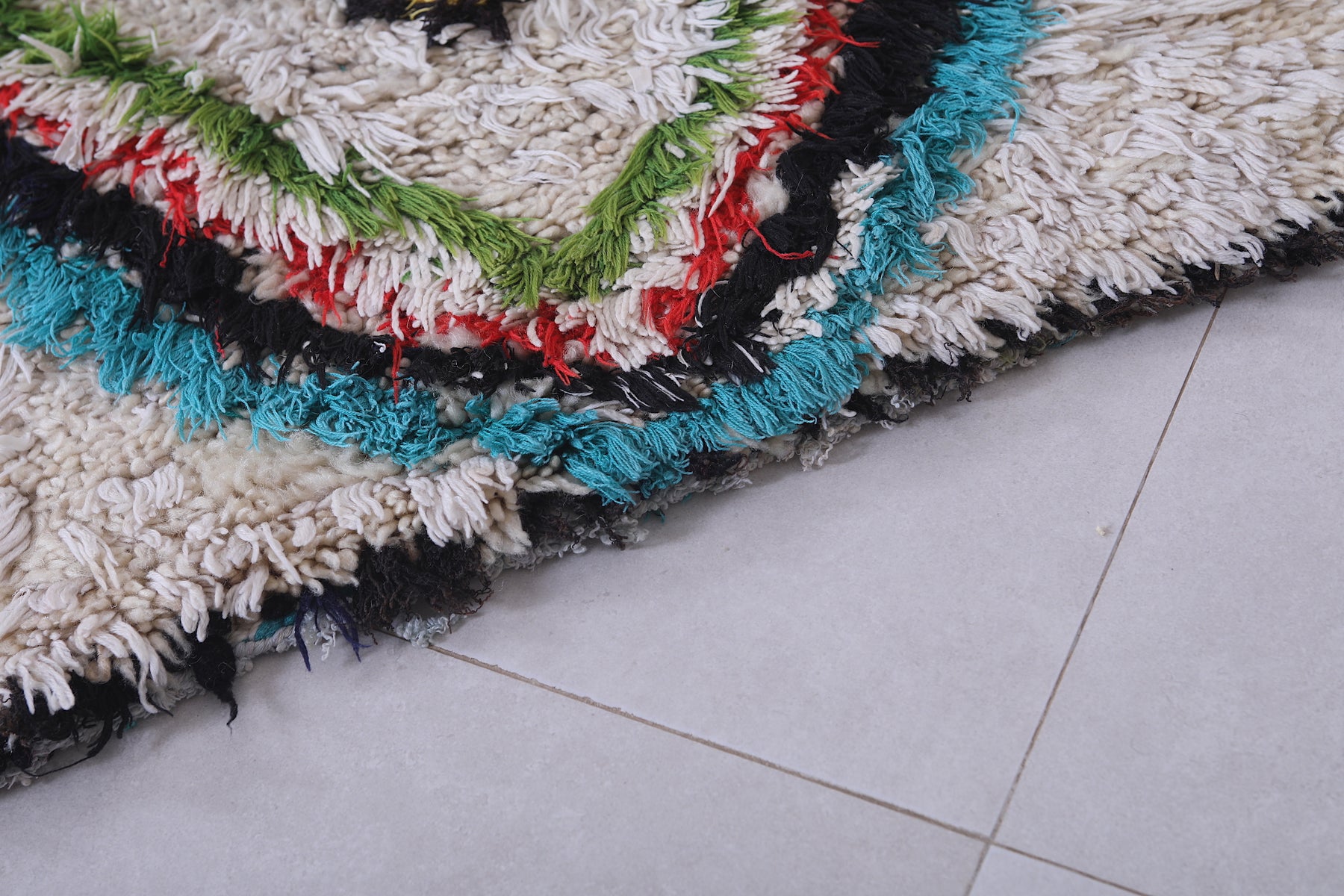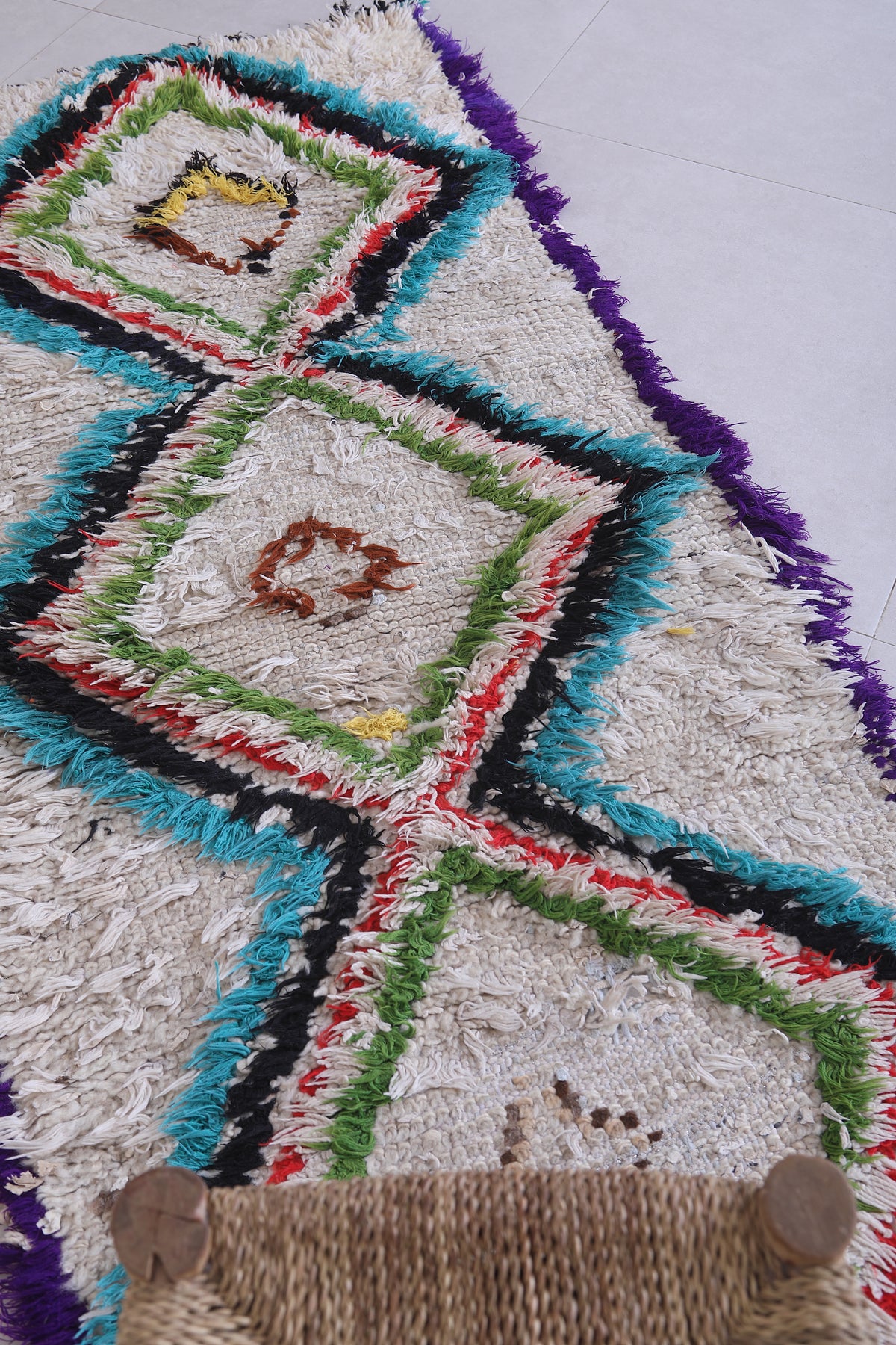 Add vibrancy to your home with this 2.4 x 6.2 feet Moroccan Berber rug. Featuring bold diamond patterns in striking hues of green, turquoise, red, and purple on a creamy white backdrop, this handwoven piece is a true statement of artistry. The intricate details, enhanced by a unique mix of colors, create an eye-catching focal point for any room. Perfect for hallways, living spaces, or bedrooms, this authentic rug combines traditional craftsmanship with modern charm.