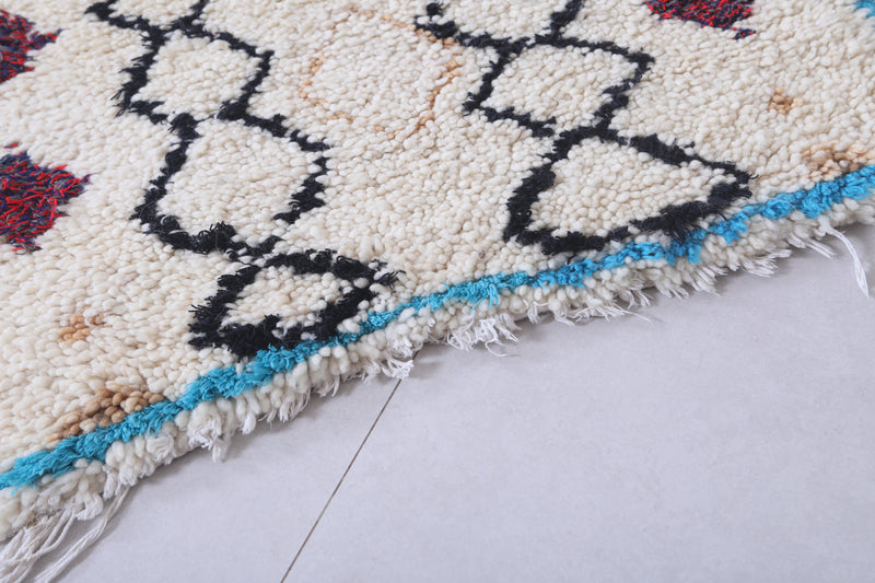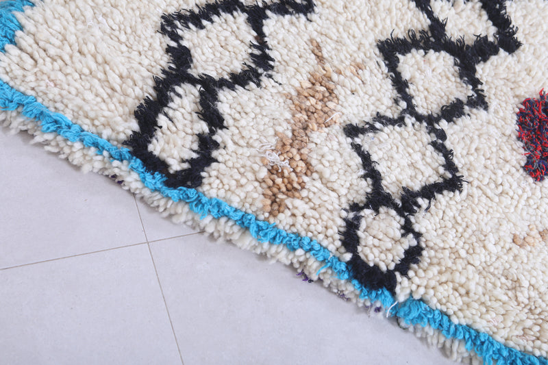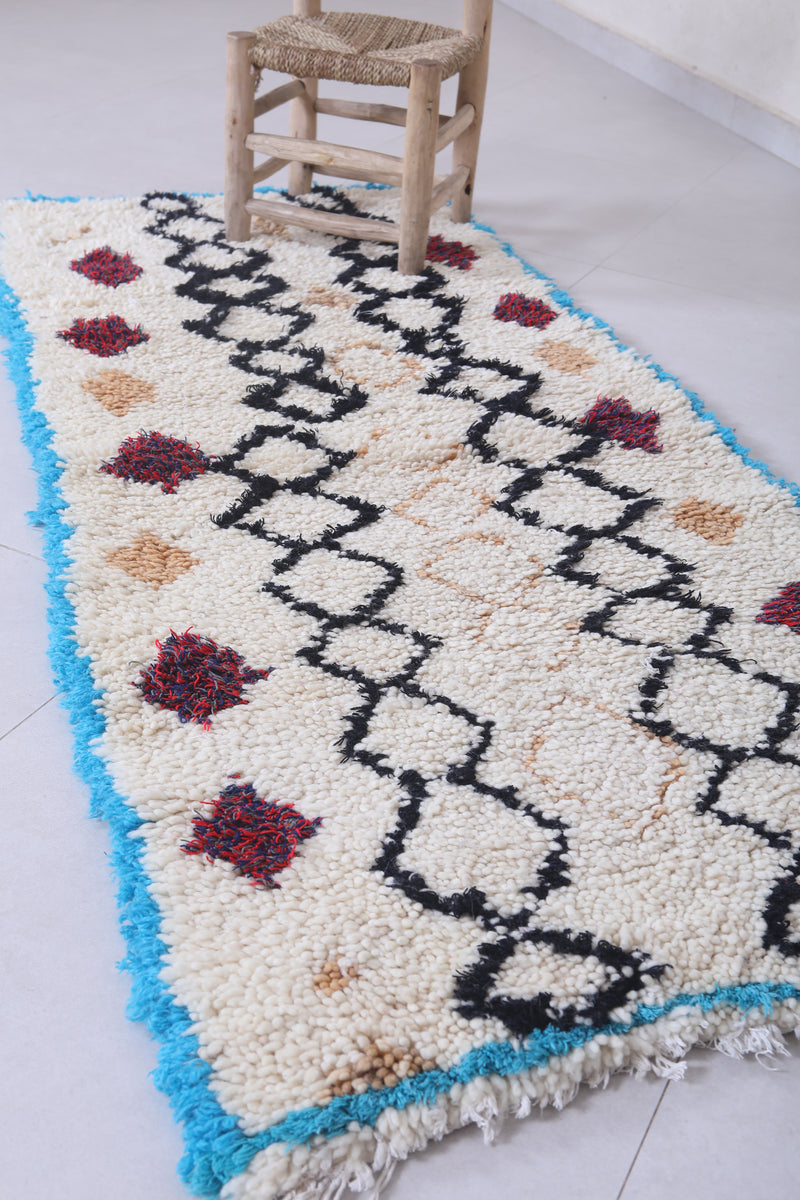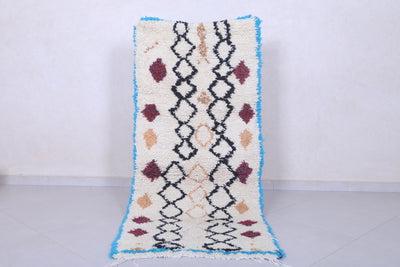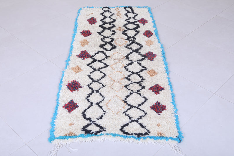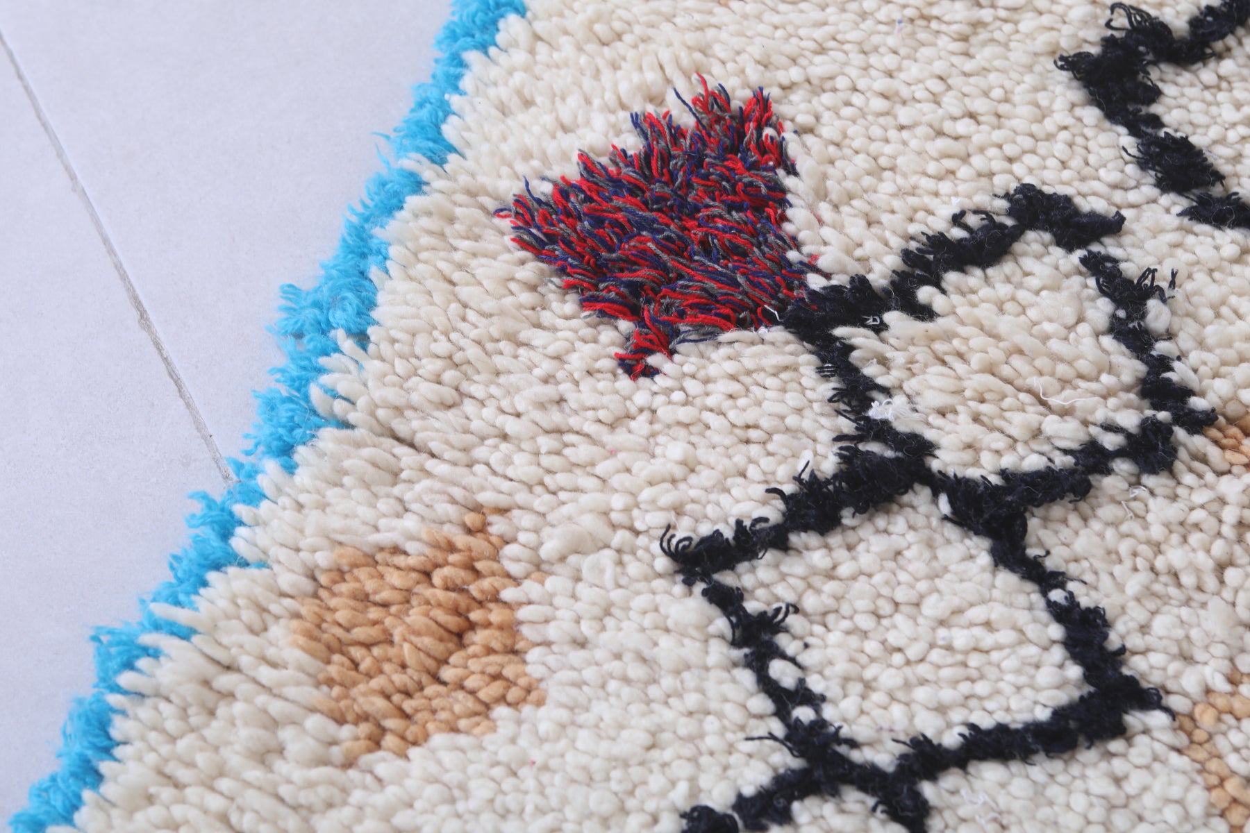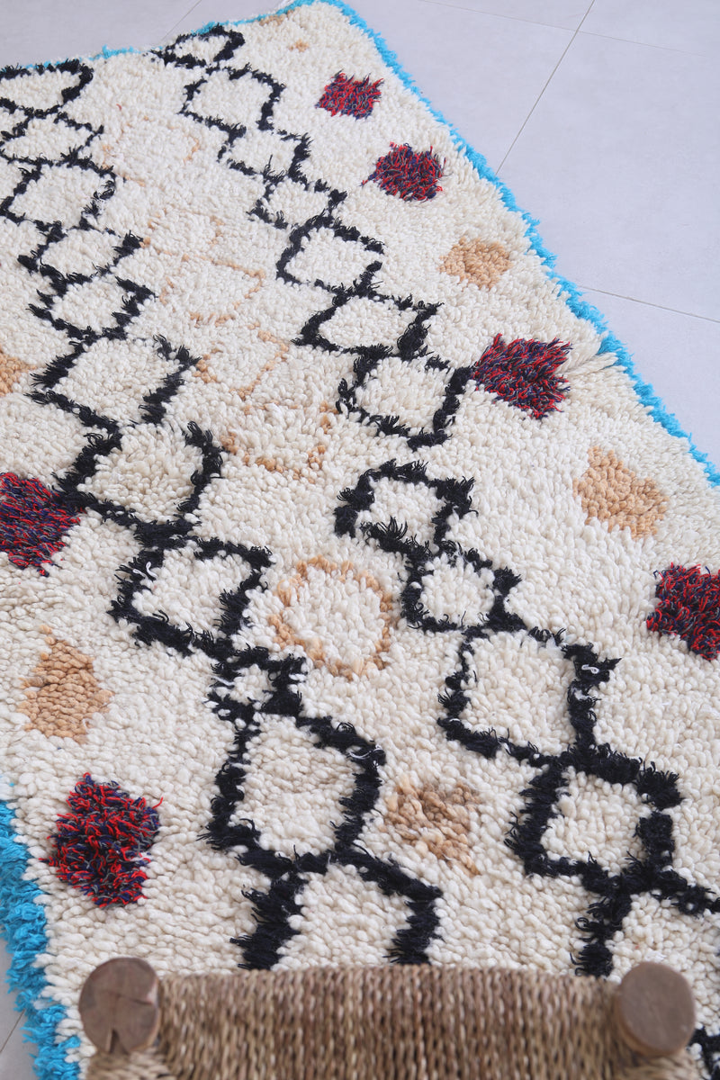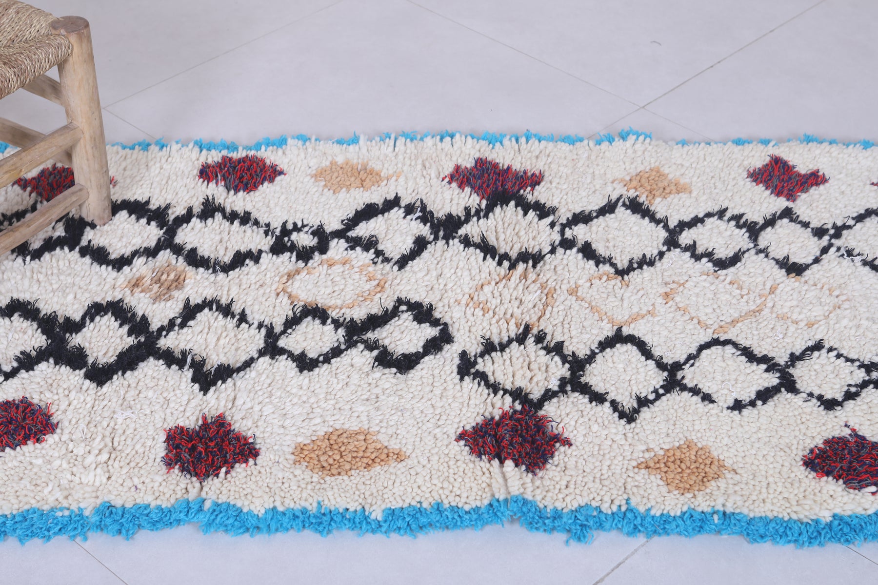 Enhance your space with this Moroccan Berber rug, sized 2.5 x 5.9 feet. Featuring an abstract arrangement of black diamond patterns, interwoven with earthy beige and vibrant red accents, this rug brings a harmonious balance of tradition and modernity. A pop of bright blue edging frames the design, creating a striking visual contrast. Handwoven by skilled artisans, its textured surface offers both comfort and depth. Perfect for living areas, hallways, or creative spaces, this rug effortlessly blends cultural heritage with contemporary aesthetics.