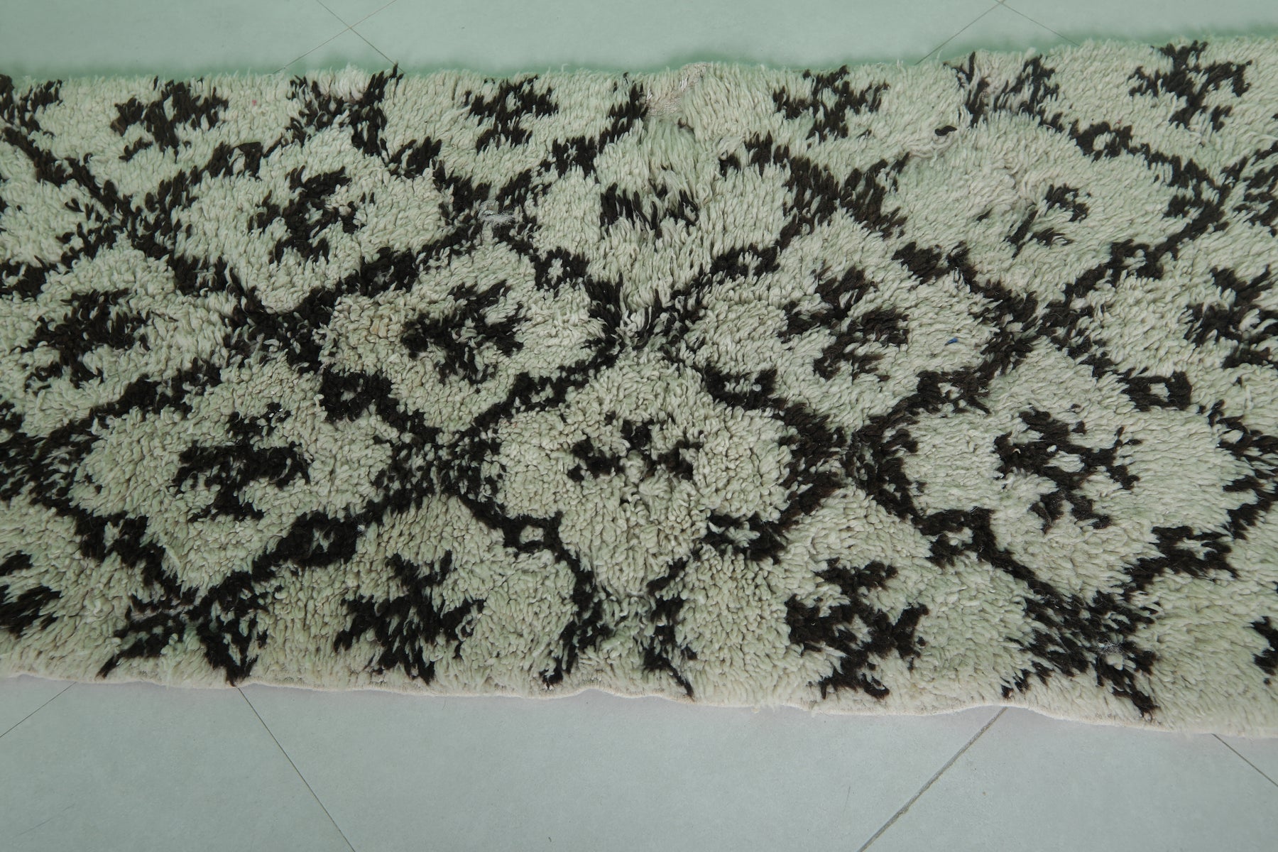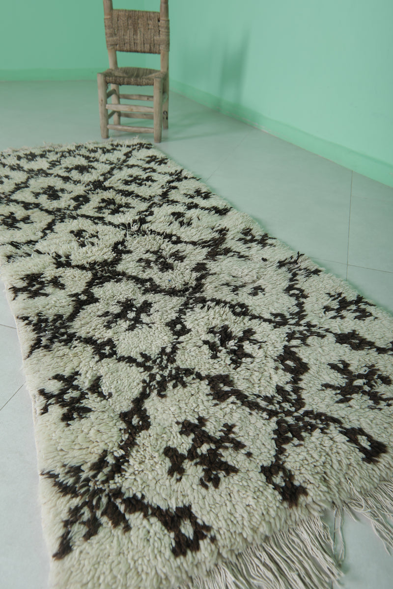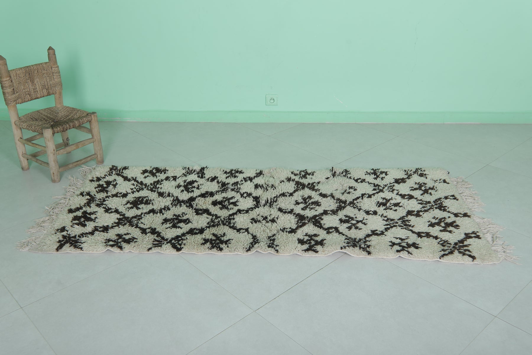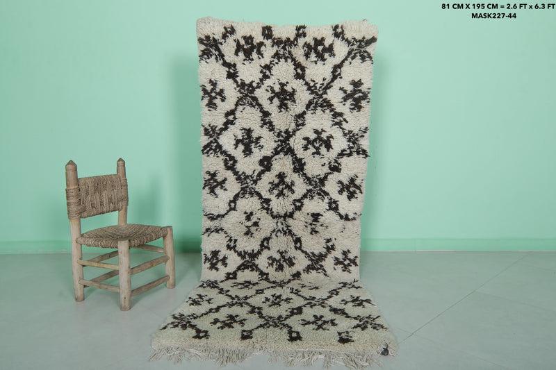 Elevate your space with this handwoven Moroccan Berber rug, measuring 2.6 x 6.3 feet. Featuring a delicate black floral motif set against a soft beige background, this rug seamlessly blends traditional Moroccan craftsmanship with a modern aesthetic. The intricate patterns add visual depth, while the neutral tones ensure versatility for any interior. Handwoven with durable materials, this rug is perfect for living rooms, bedrooms, or hallways, offering both elegance and comfort.
