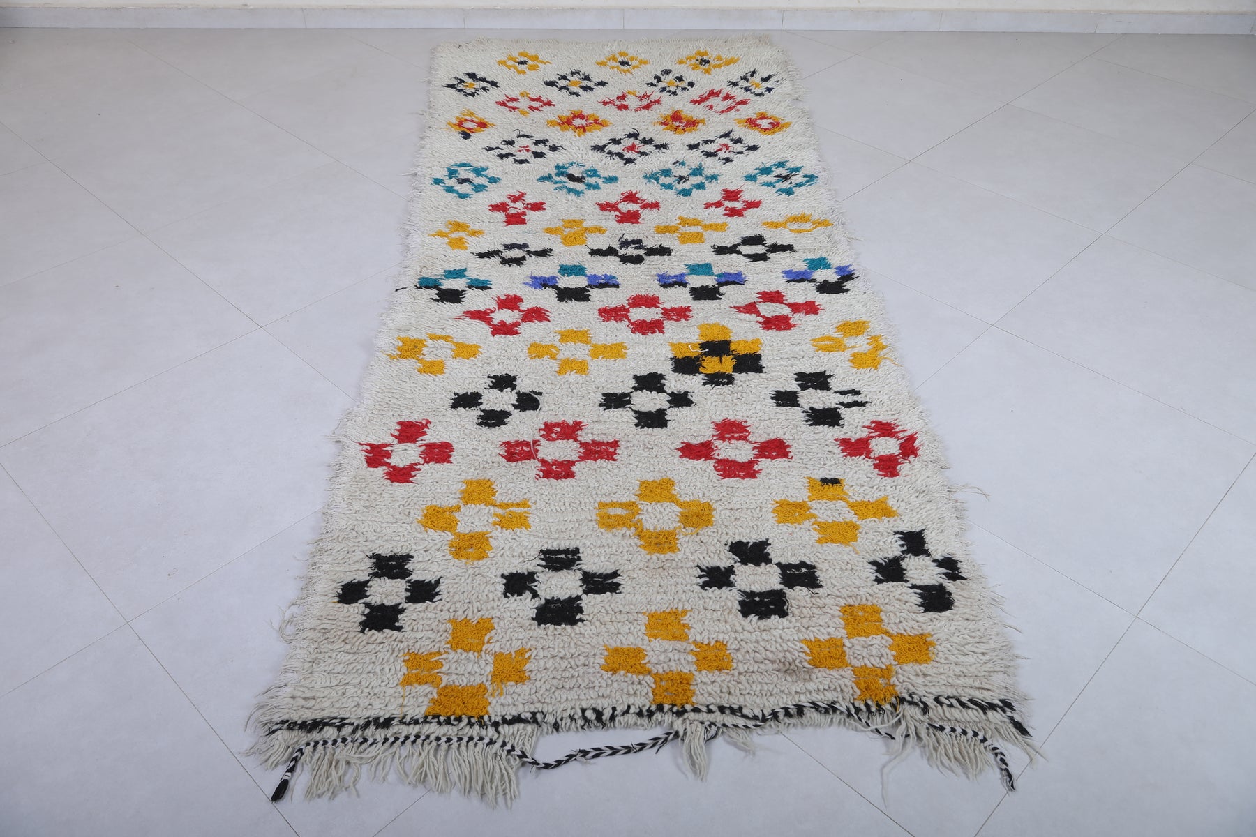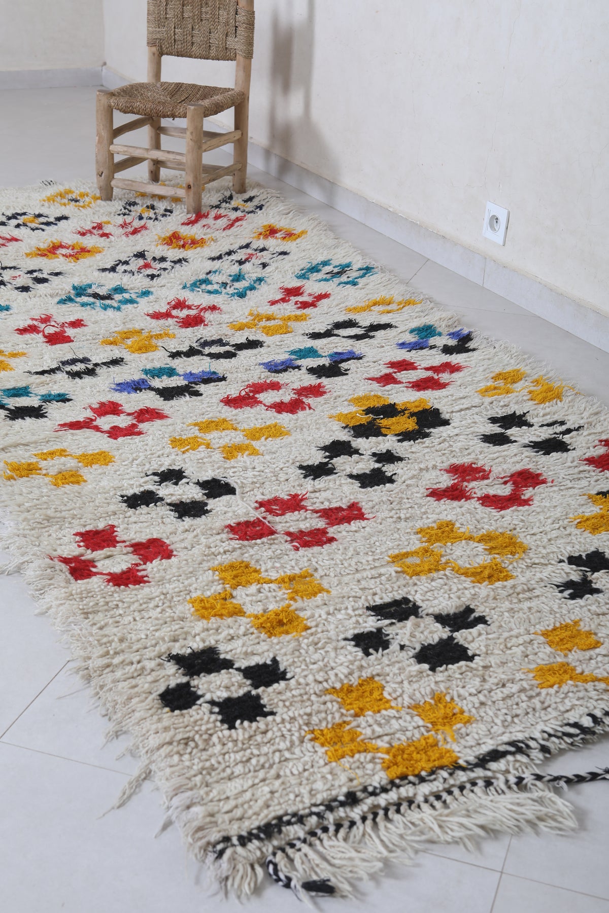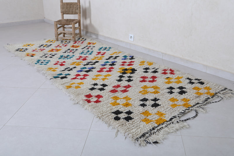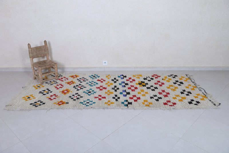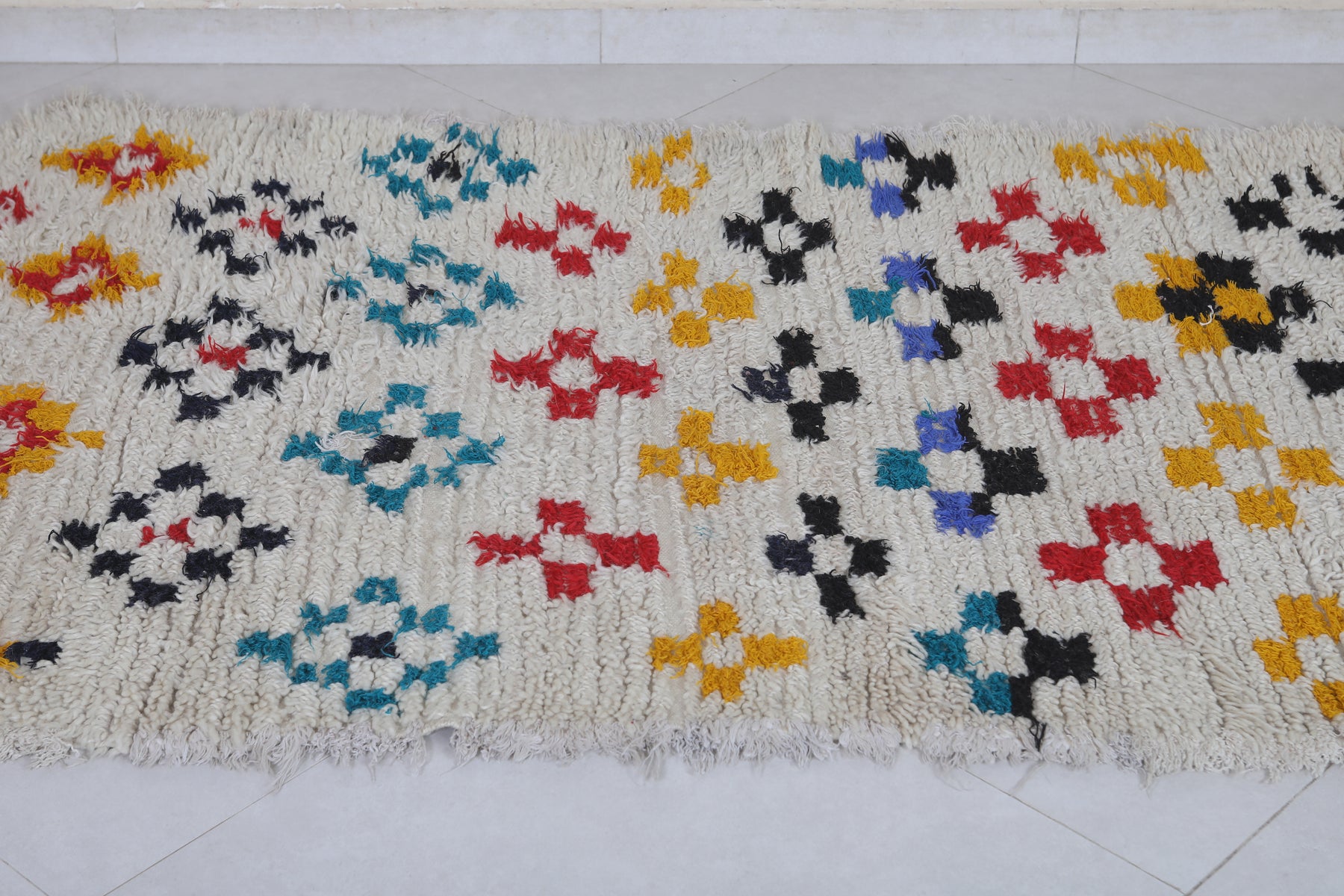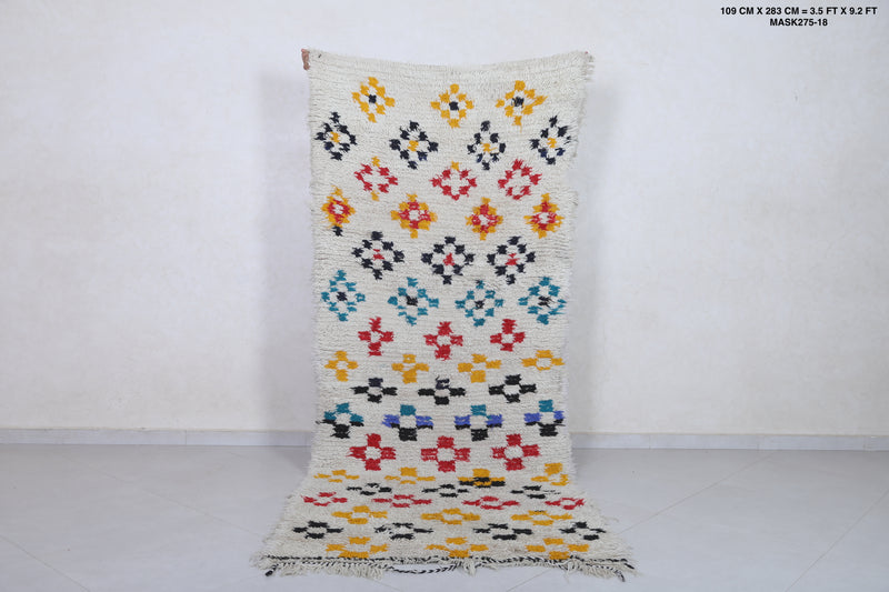 Add warmth and tradition to your space with this exquisite Handwoven Moroccan Berber Rug, measuring 3.5 x 9.2 feet. Showcasing a mesmerizing array of colorful geometric motifs in vibrant hues of yellow, red, blue, and black, this rug blends cultural artistry with modern elegance. The intricate diamond and cross-like patterns stand out against a soft ivory background, creating a lively yet balanced aesthetic. Perfect for hallways, living spaces, or bedrooms, this handcrafted piece embodies authenticity, durability, and timeless style.
