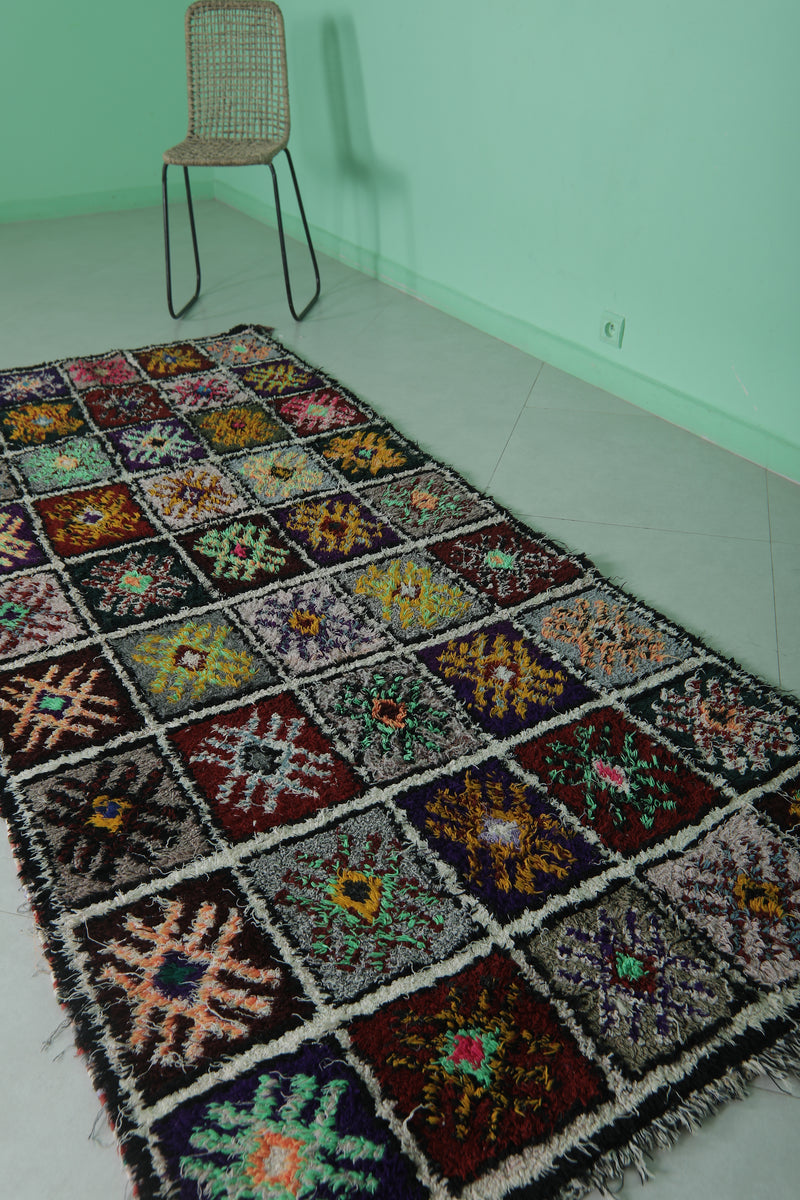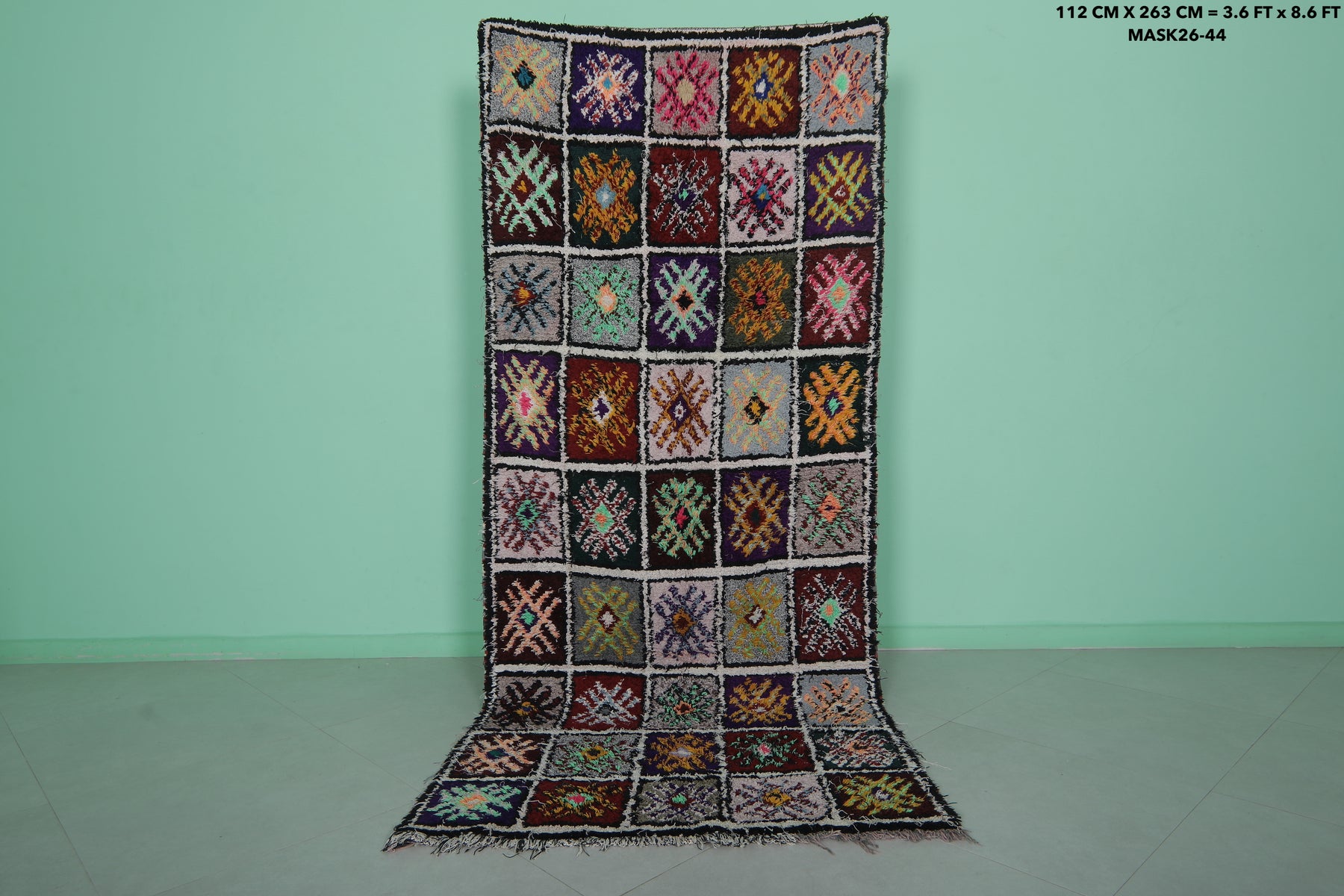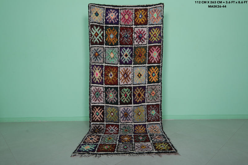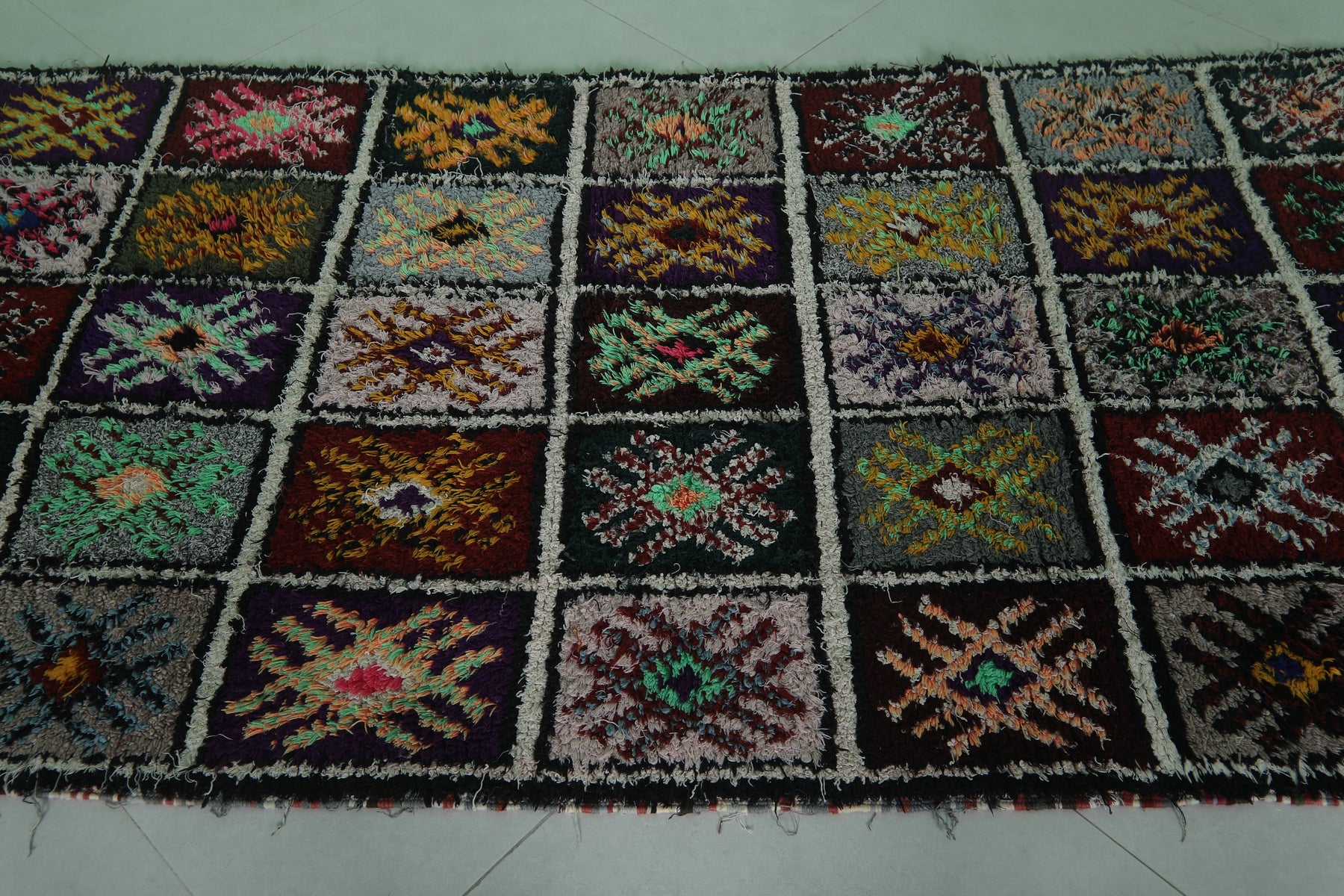 Make a bold statement with this Moroccan Berber Rug, measuring 3.6 x 8.6 feet. This handwoven masterpiece showcases a stunning patchwork of vibrant square patterns, each adorned with intricate diamond-shaped motifs in red, orange, purple, green, and blue. The bold contrast between the colorful patterns and the dark background enhances its artistic appeal. Perfect for large living spaces, hallways, or eclectic interiors, this rug embodies traditional craftsmanship with a modern aesthetic, offering both functionality and style.