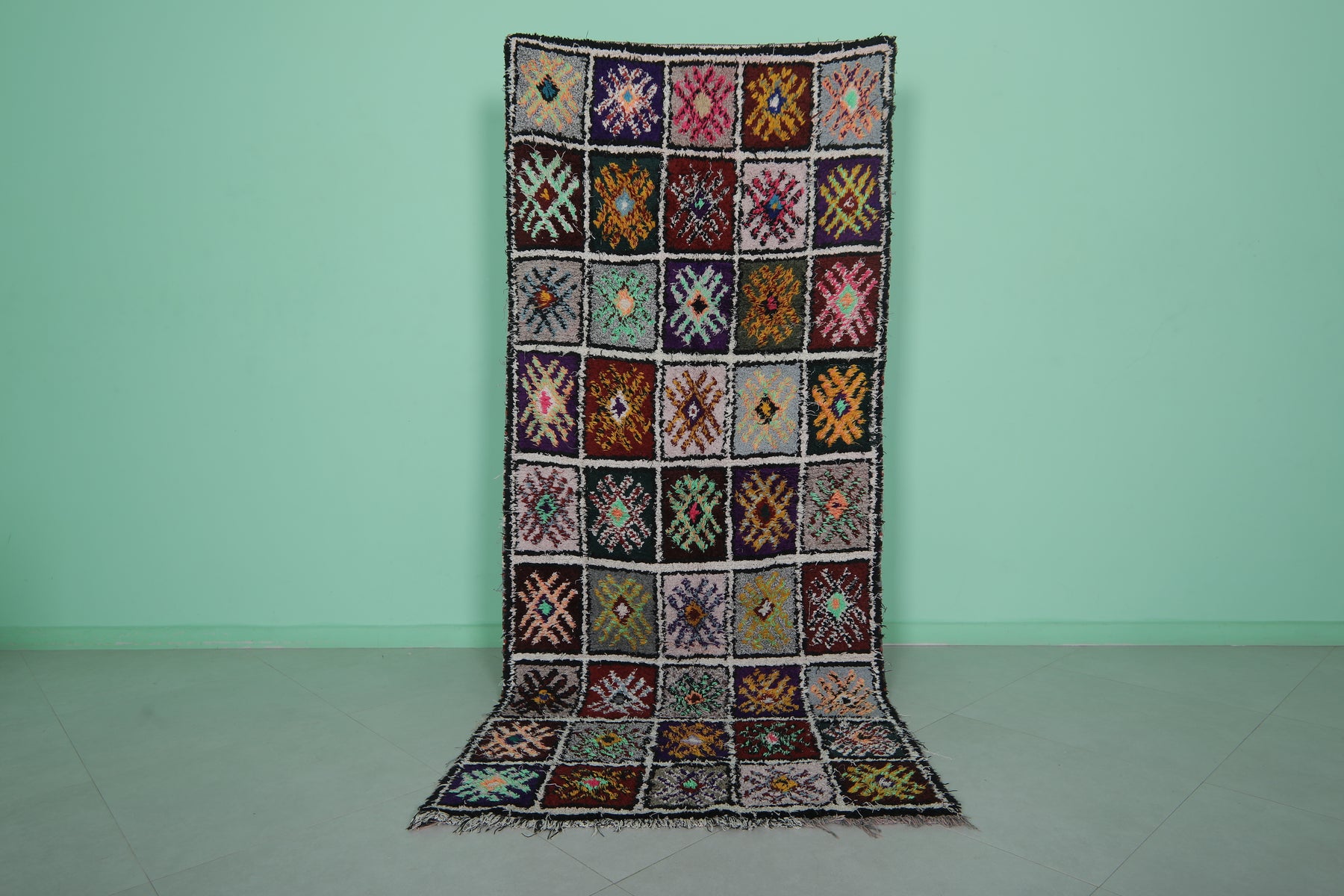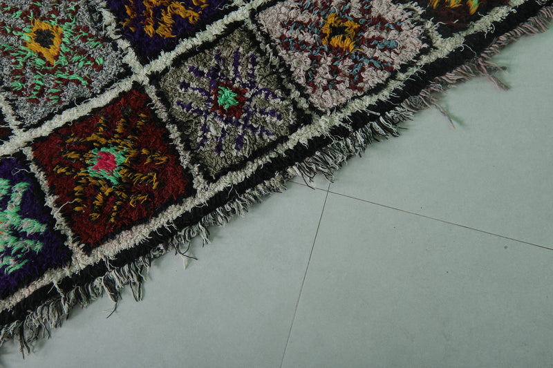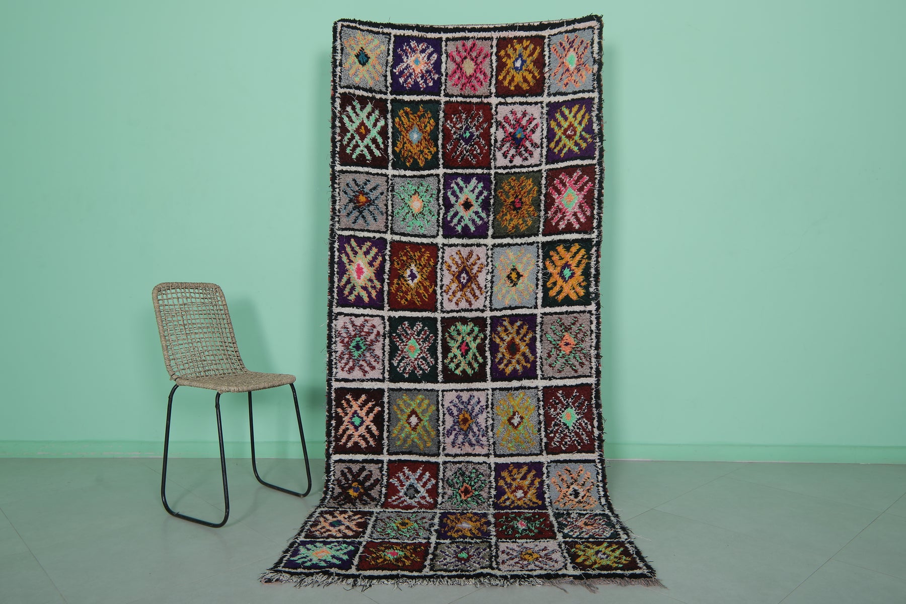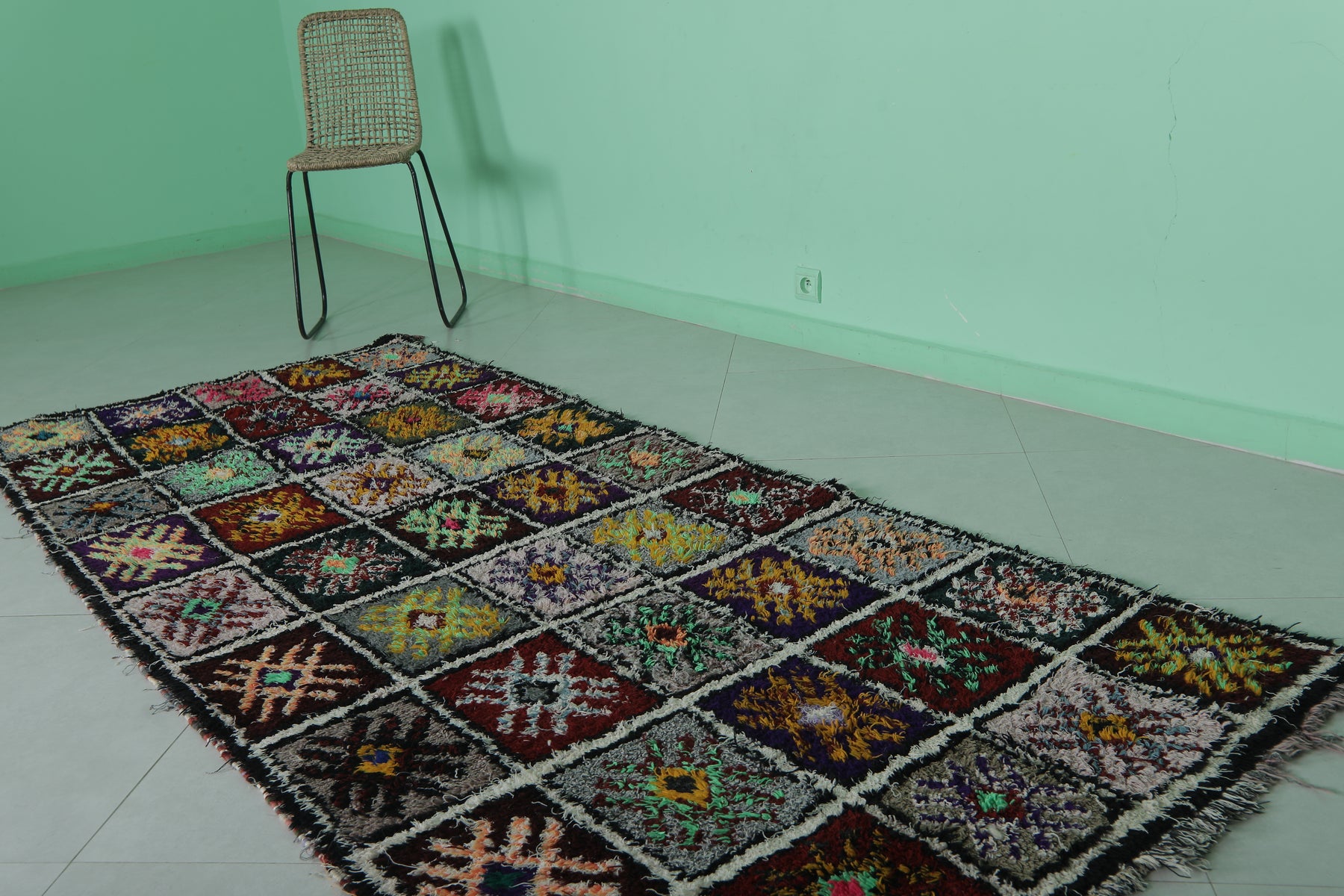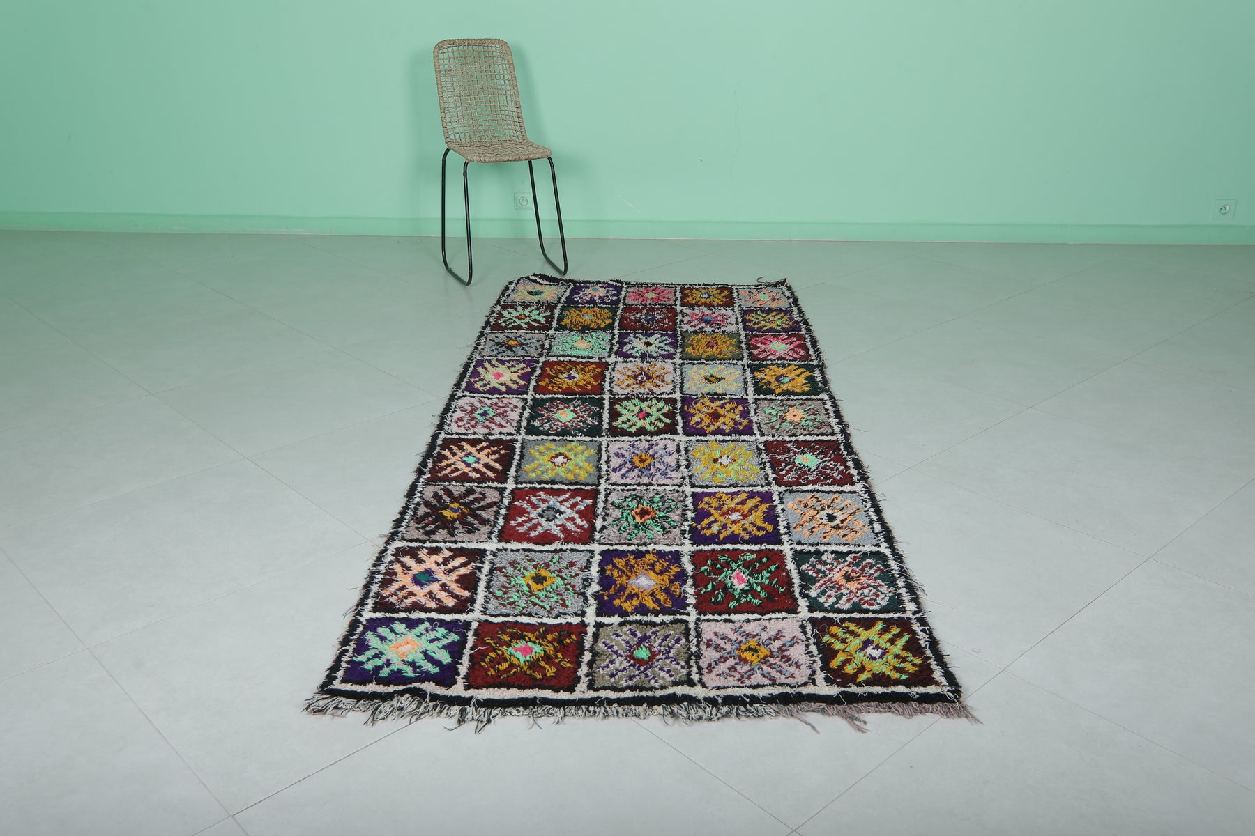 Make a bold statement with this Moroccan Berber Rug, measuring 3.6 x 8.6 feet. This handwoven masterpiece showcases a stunning patchwork of vibrant square patterns, each adorned with intricate diamond-shaped motifs in red, orange, purple, green, and blue. The bold contrast between the colorful patterns and the dark background enhances its artistic appeal. Perfect for large living spaces, hallways, or eclectic interiors, this rug embodies traditional craftsmanship with a modern aesthetic, offering both functionality and style.