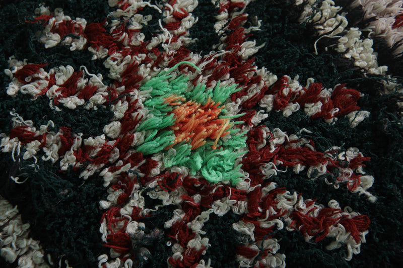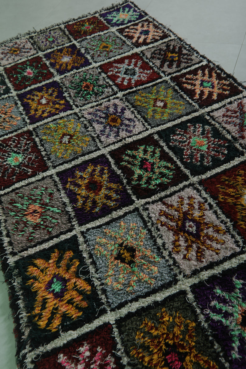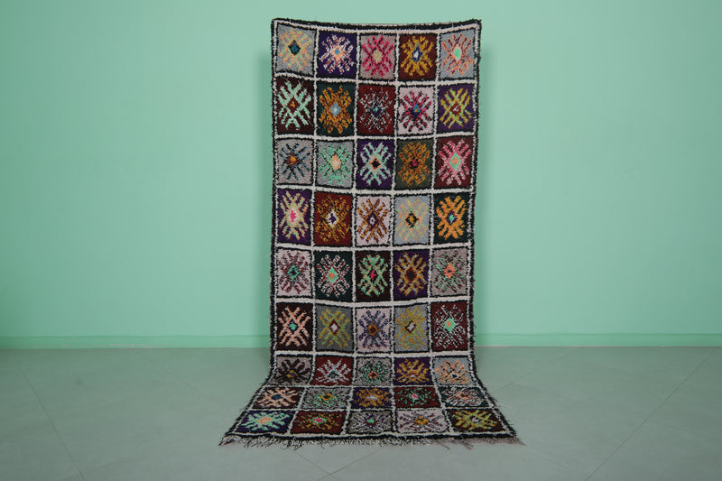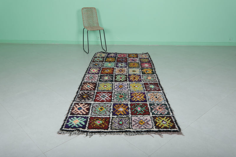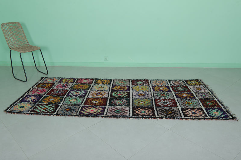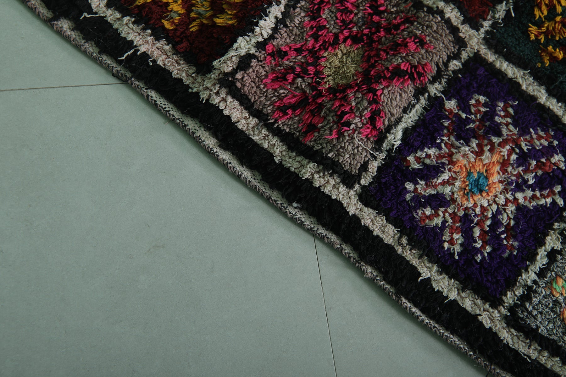 Make a bold statement with this Moroccan Berber Rug, measuring 3.6 x 8.6 feet. This handwoven masterpiece showcases a stunning patchwork of vibrant square patterns, each adorned with intricate diamond-shaped motifs in red, orange, purple, green, and blue. The bold contrast between the colorful patterns and the dark background enhances its artistic appeal. Perfect for large living spaces, hallways, or eclectic interiors, this rug embodies traditional craftsmanship with a modern aesthetic, offering both functionality and style.
