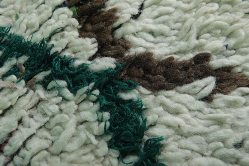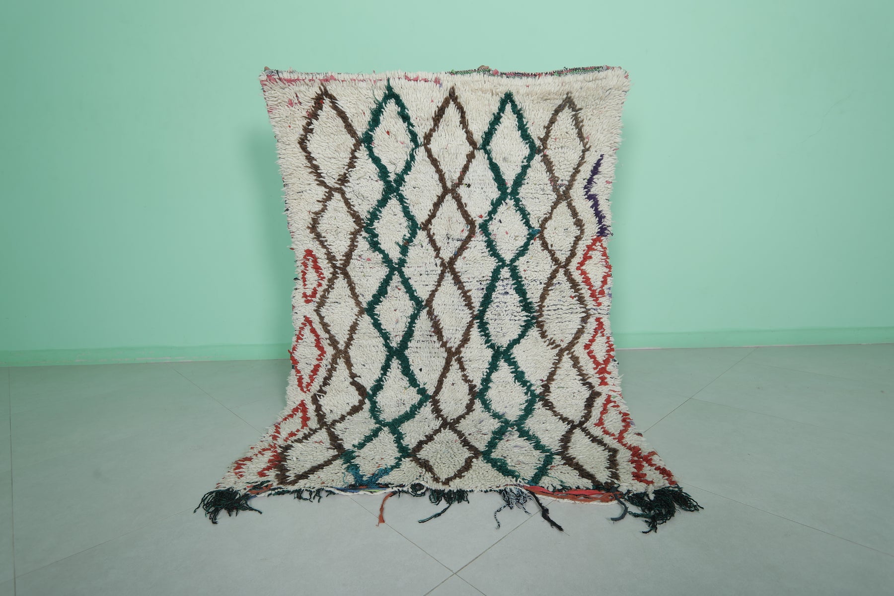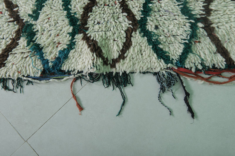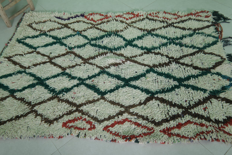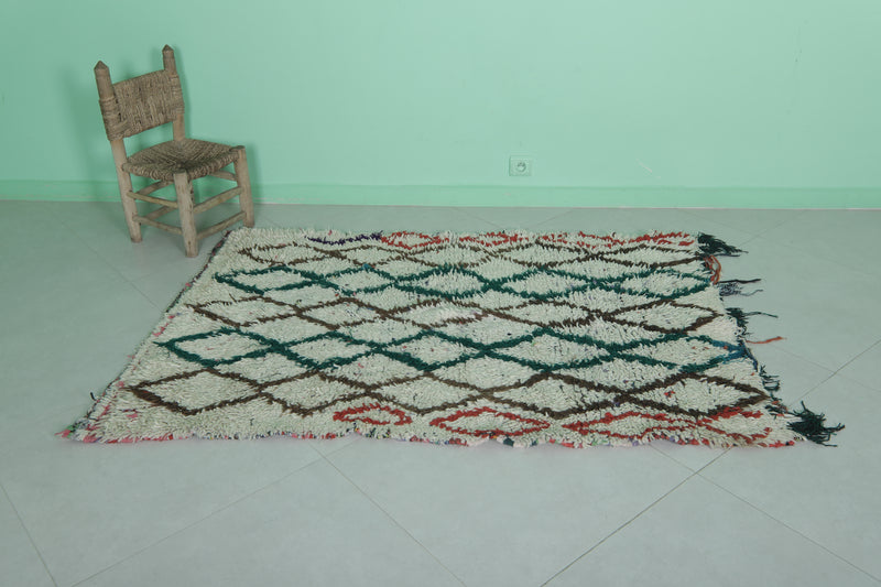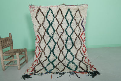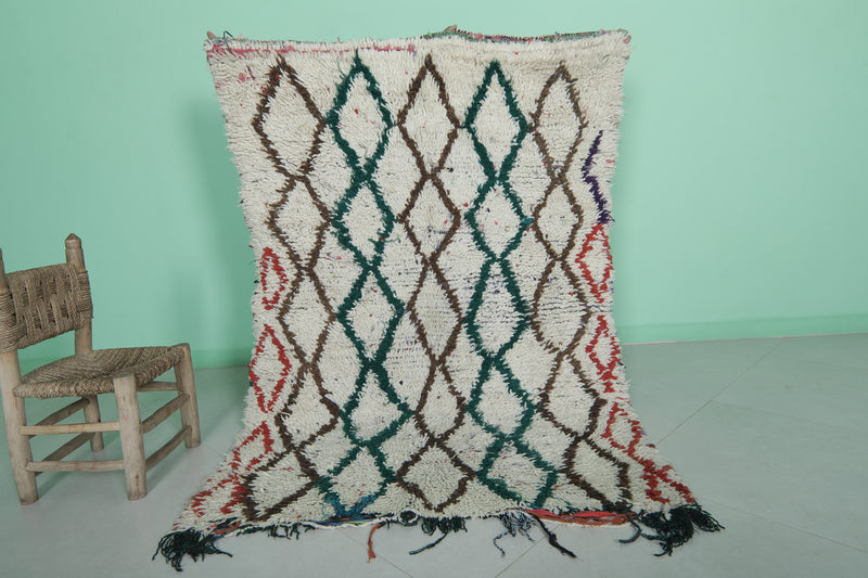 Elevate your home with this Moroccan Berber Rug, featuring a 3.8 x 5.5 feet design. Its intricate geometric diamond pattern is highlighted in earthy tones of green, brown, and red on a soft ivory background. Handwoven by skilled artisans, this piece offers warmth and timeless style for living rooms, bedrooms, or entryways. Durable and unique, it showcases the beauty of traditional Moroccan craftsmanship.