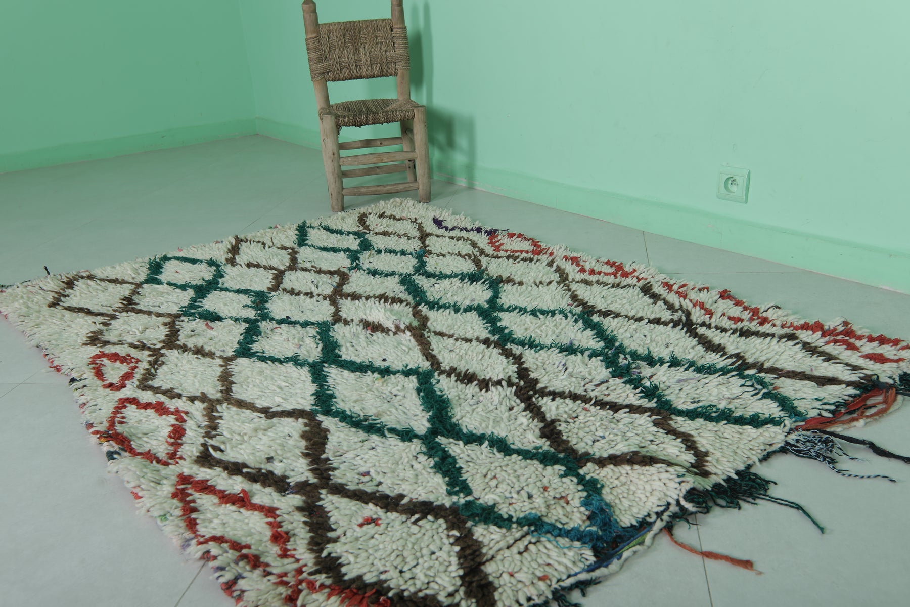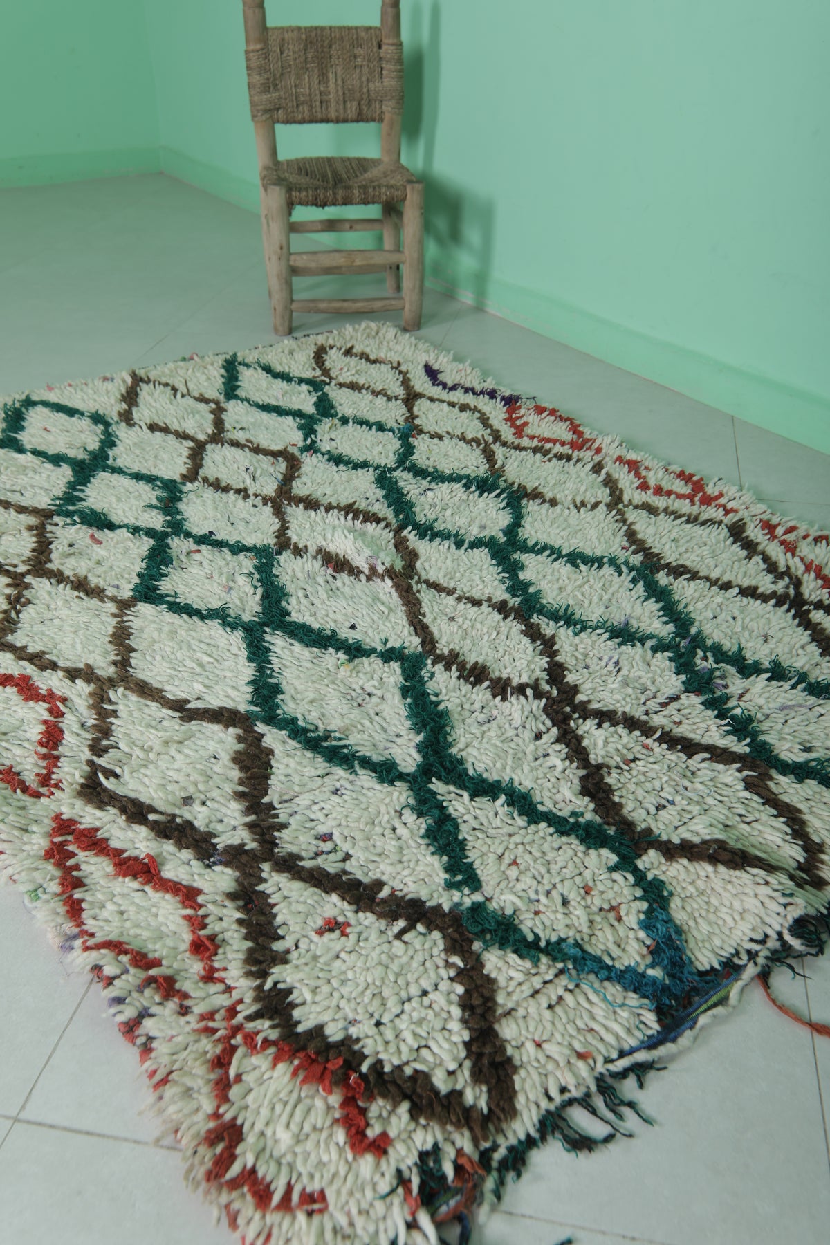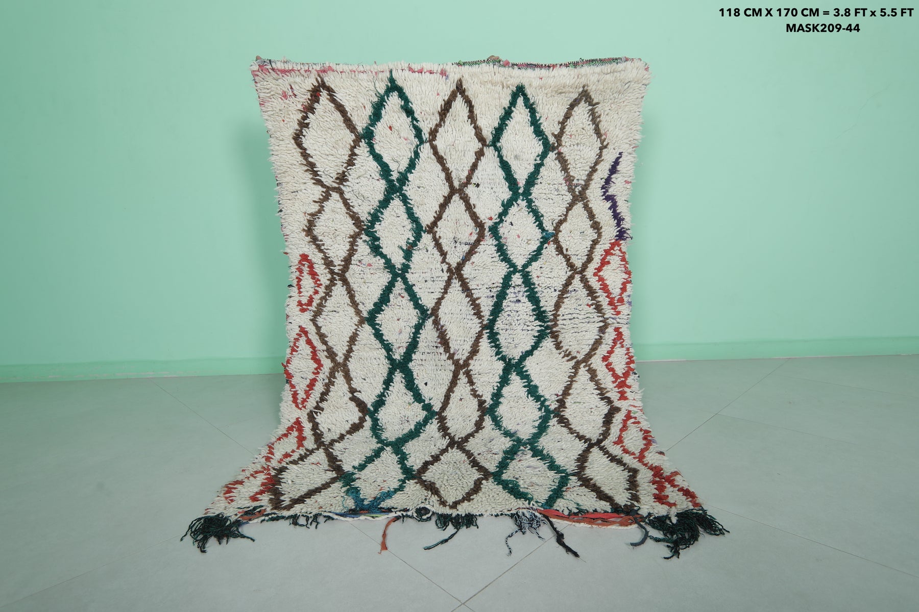 Elevate your home with this Moroccan Berber Rug, featuring a 3.8 x 5.5 feet design. Its intricate geometric diamond pattern is highlighted in earthy tones of green, brown, and red on a soft ivory background. Handwoven by skilled artisans, this piece offers warmth and timeless style for living rooms, bedrooms, or entryways. Durable and unique, it showcases the beauty of traditional Moroccan craftsmanship.