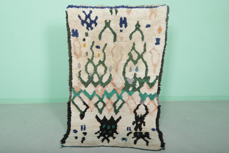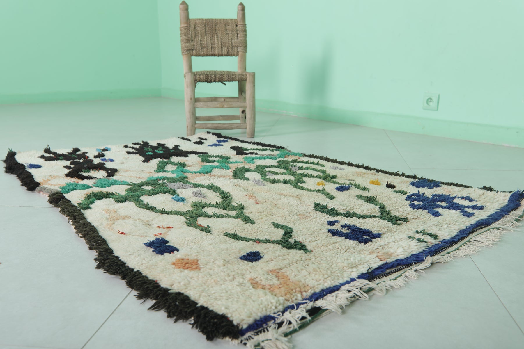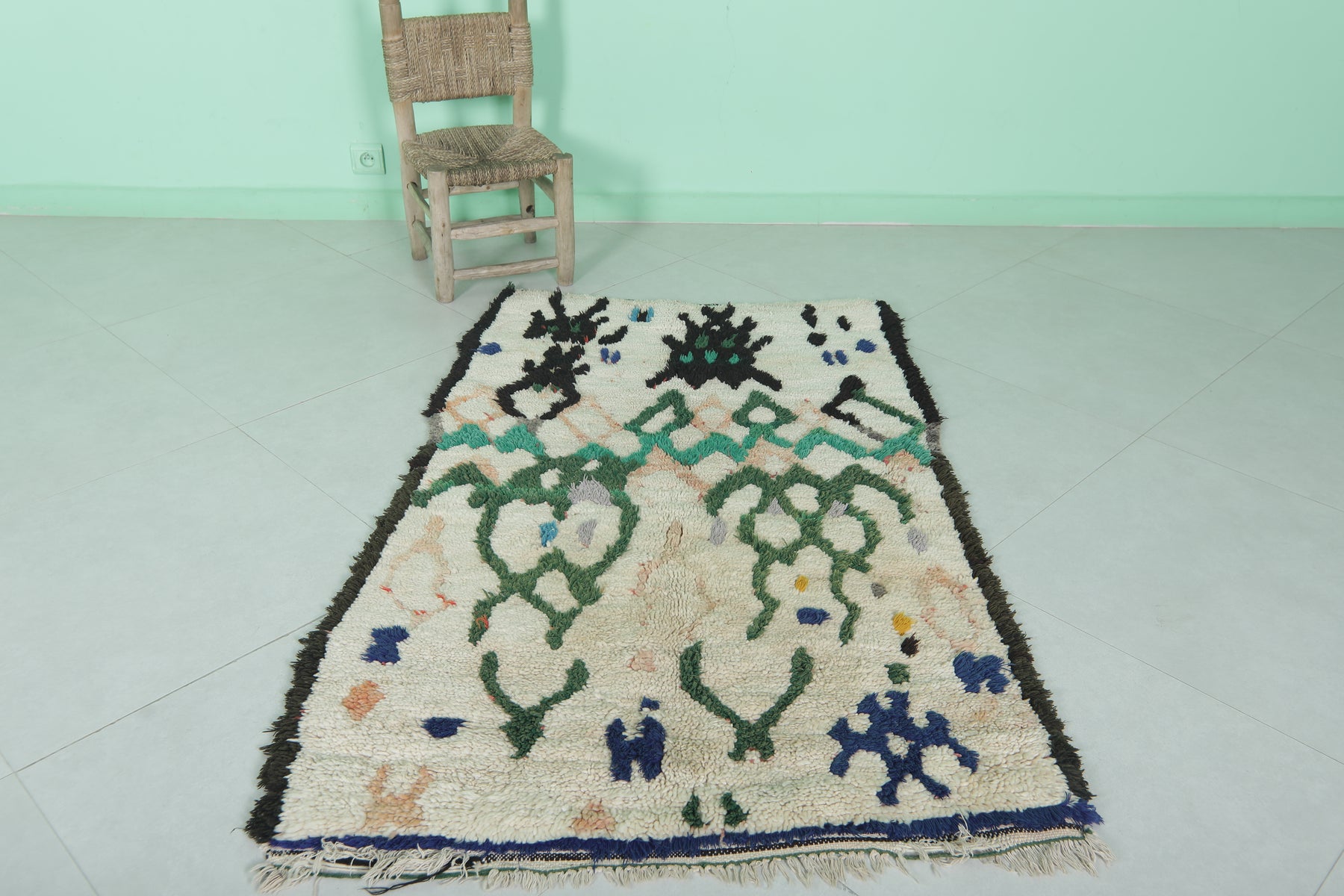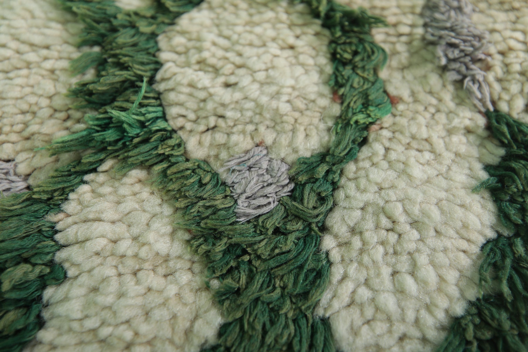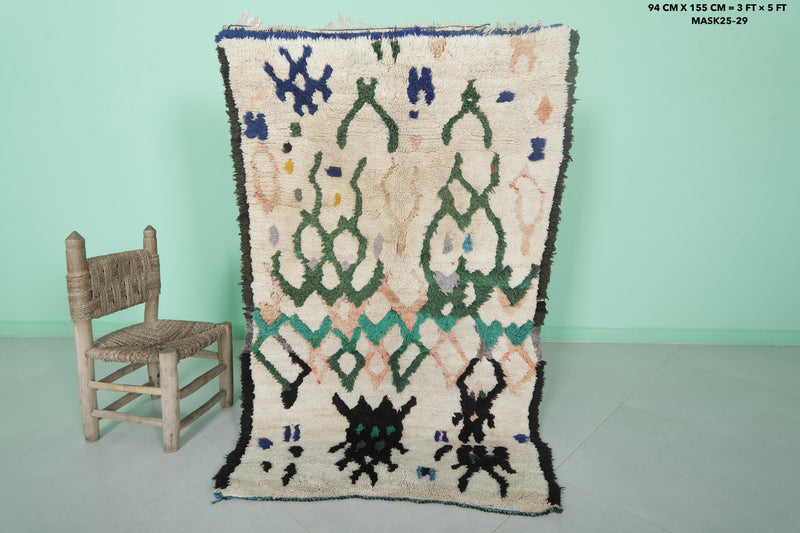Elevate your space with this Moroccan Berber rug, measuring 3 x 5 feet. Handwoven by skilled artisans, this exquisite piece showcases a blend of traditional and contemporary patterns in green, black, and blue on a neutral background. Crafted from premium wool, it offers warmth, durability, and a timeless aesthetic, making it a unique addition to living rooms, bedrooms, or as an eye-catching accent piece.
