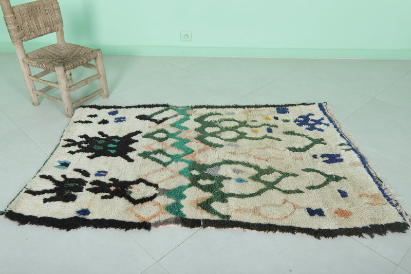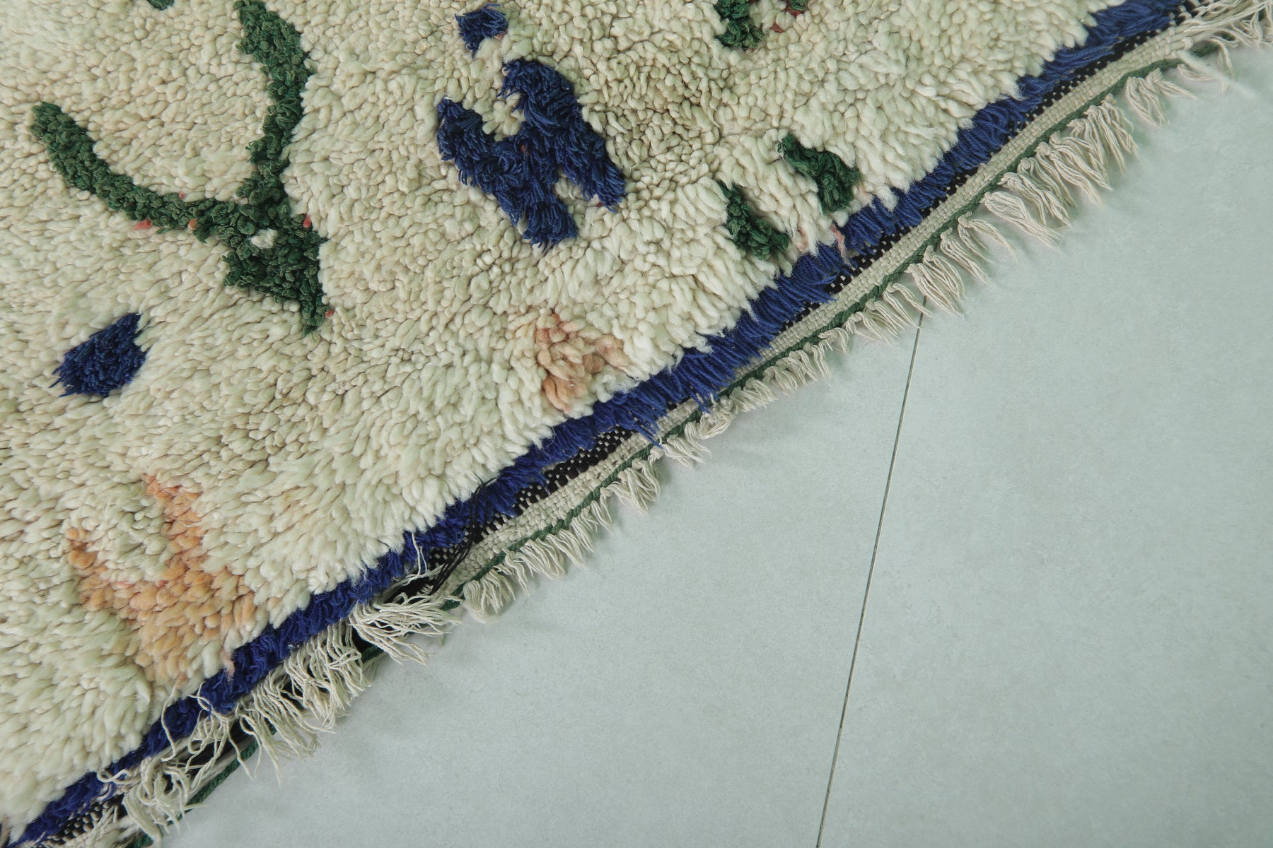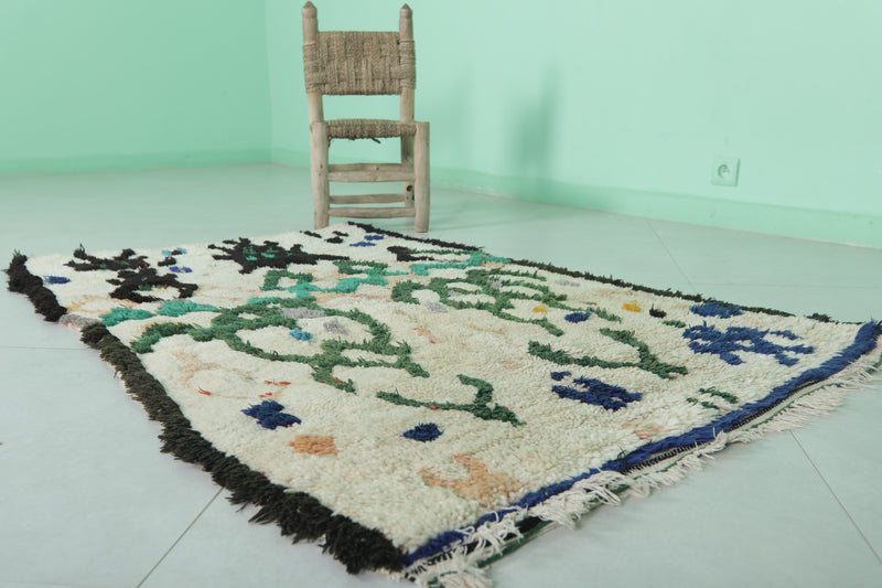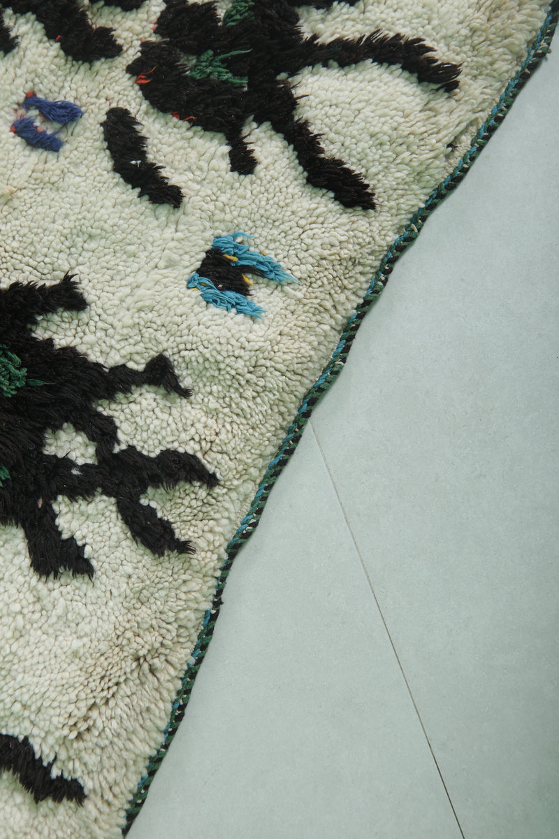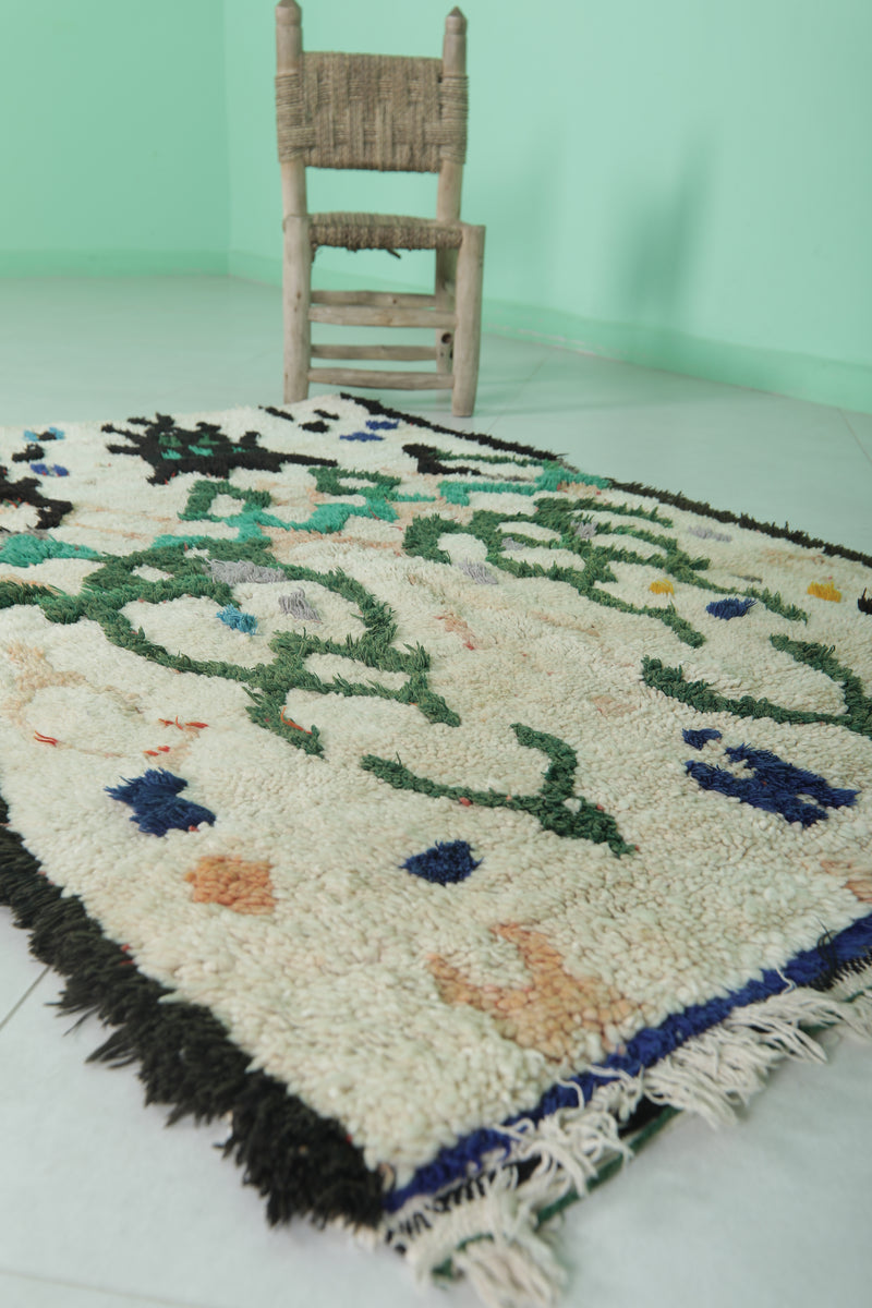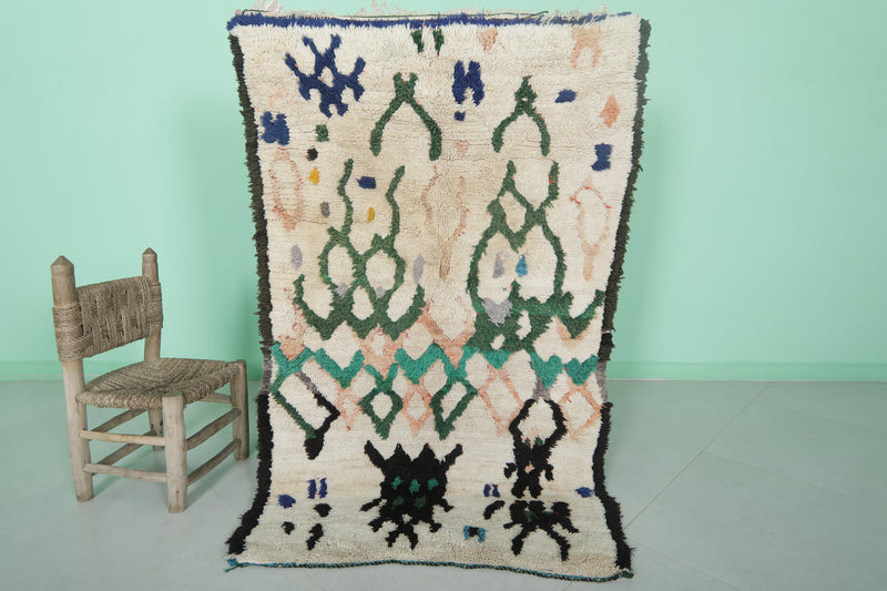 Elevate your space with this Moroccan Berber rug, measuring 3 x 5 feet. Handwoven by skilled artisans, this exquisite piece showcases a blend of traditional and contemporary patterns in green, black, and blue on a neutral background. Crafted from premium wool, it offers warmth, durability, and a timeless aesthetic, making it a unique addition to living rooms, bedrooms, or as an eye-catching accent piece.