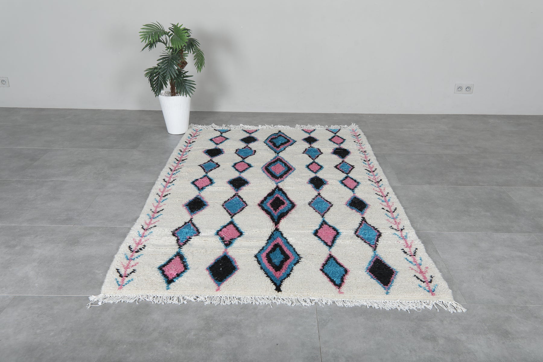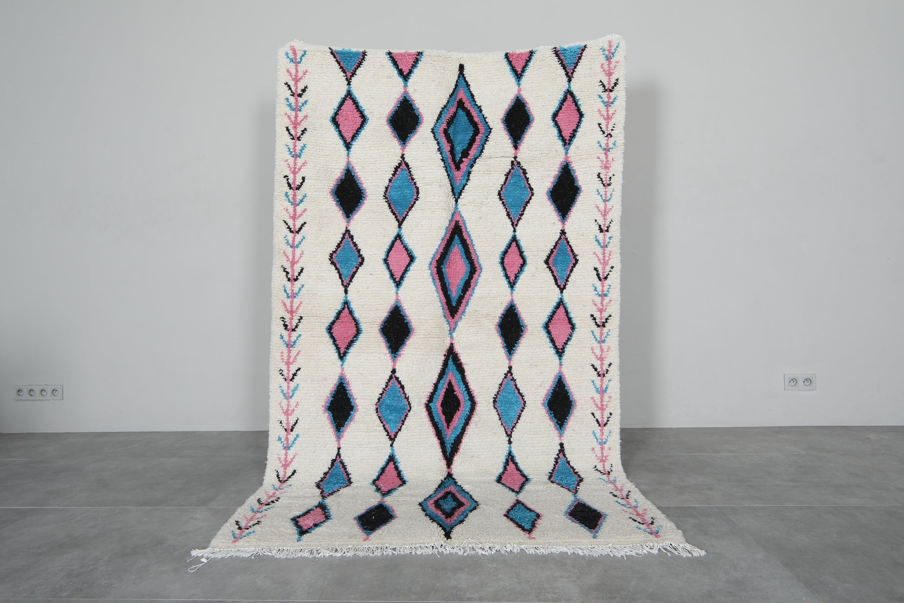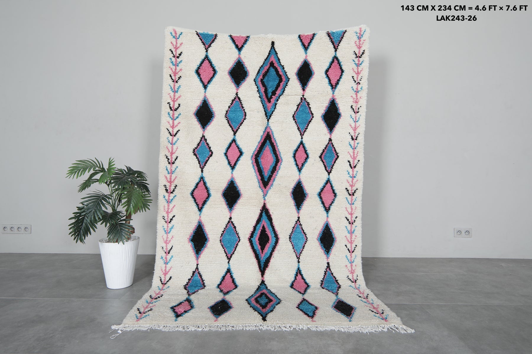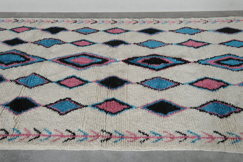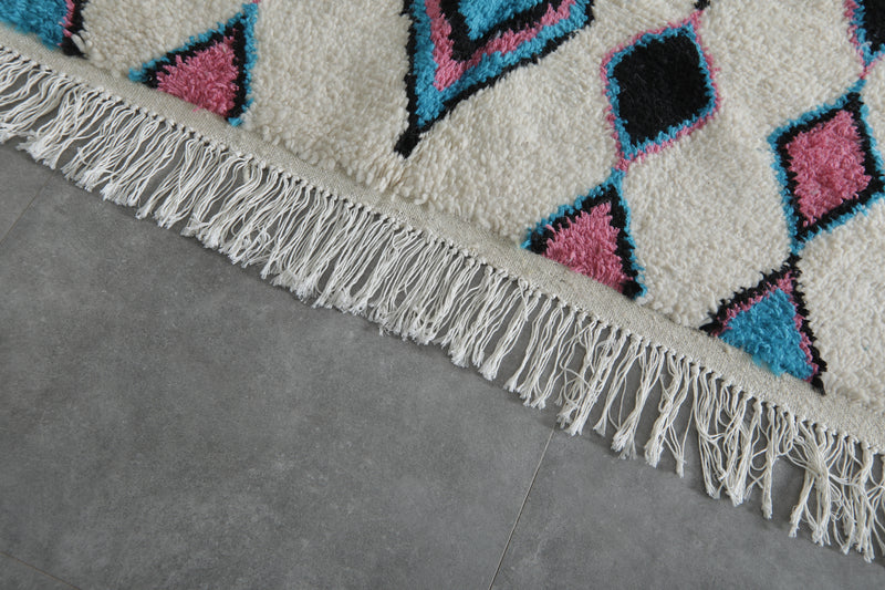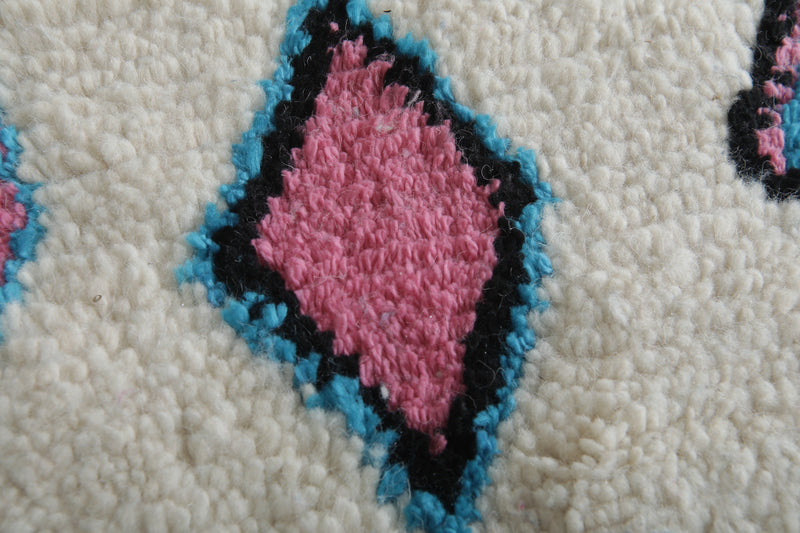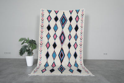 Enhance your interior with this Moroccan Berber Rug, sized at 4.6 x 7.6 feet (143 CM x 234 CM). Featuring a captivating tribal-inspired diamond pattern in soft pink, blue, and black hues, this handcrafted rug blends tradition with modern elegance.