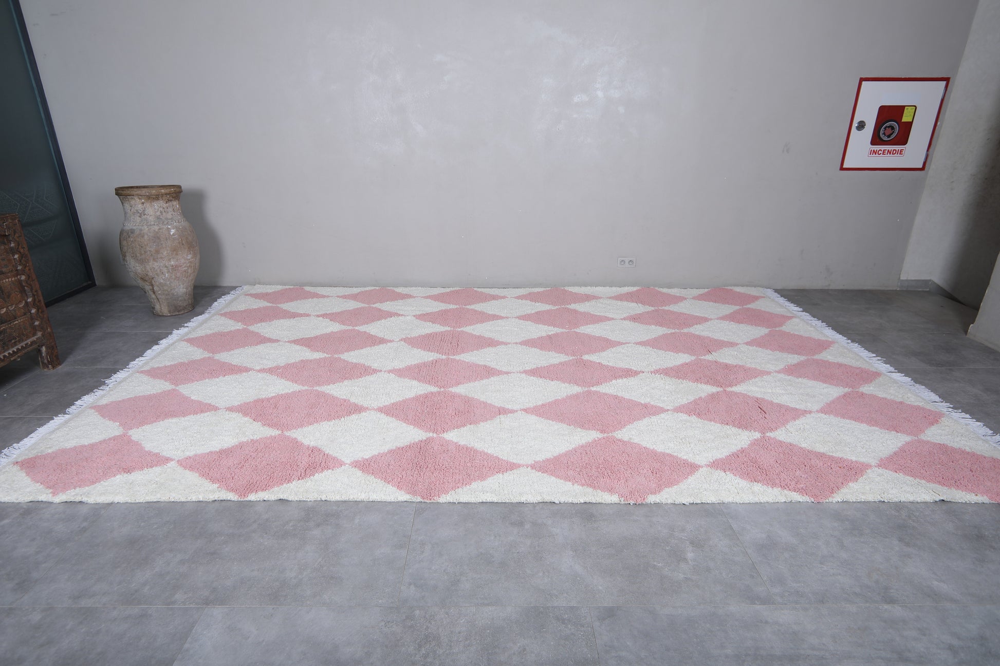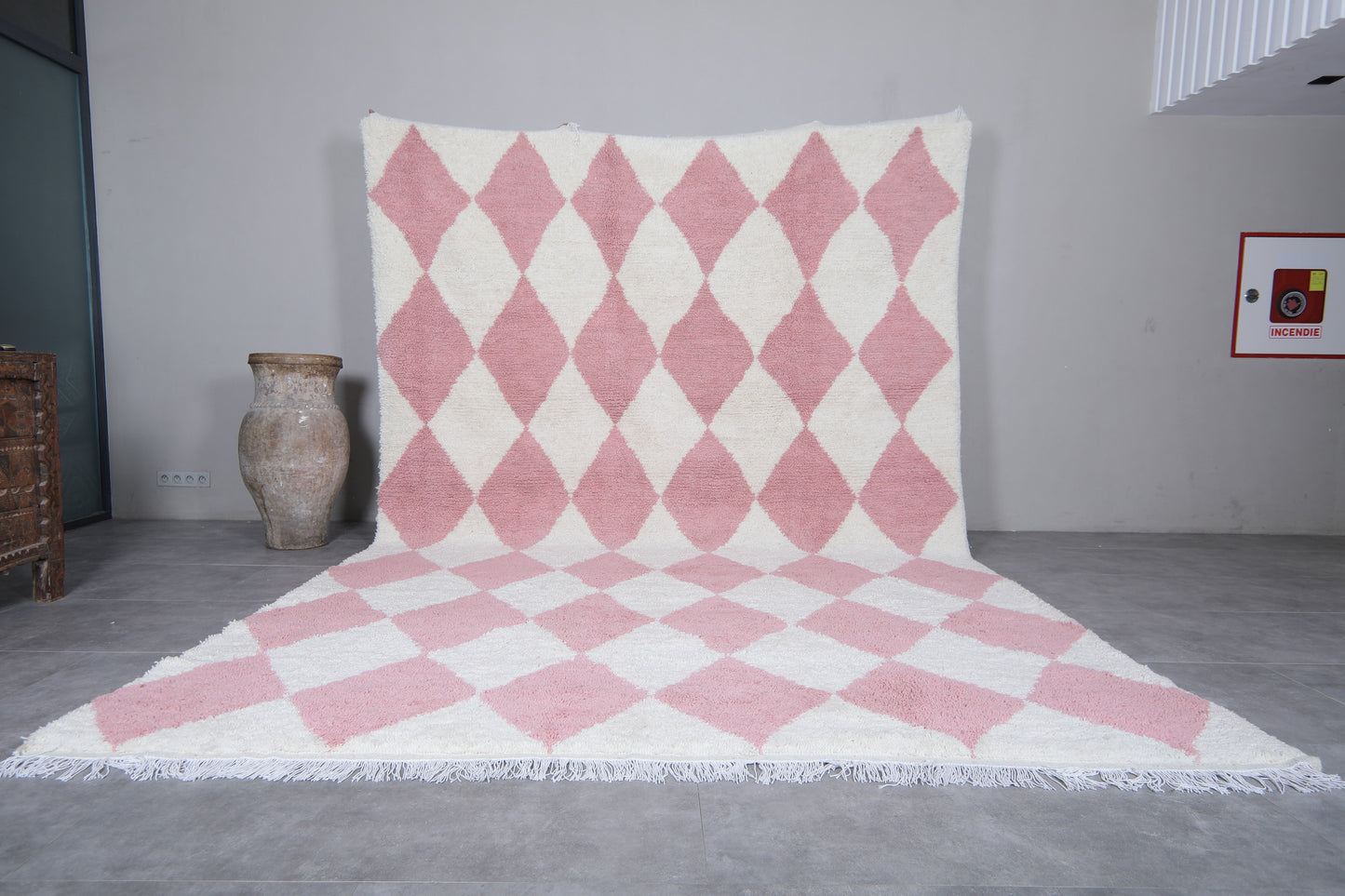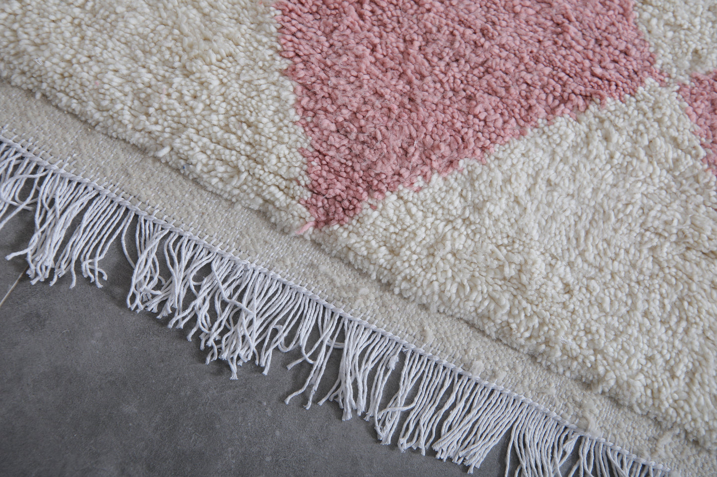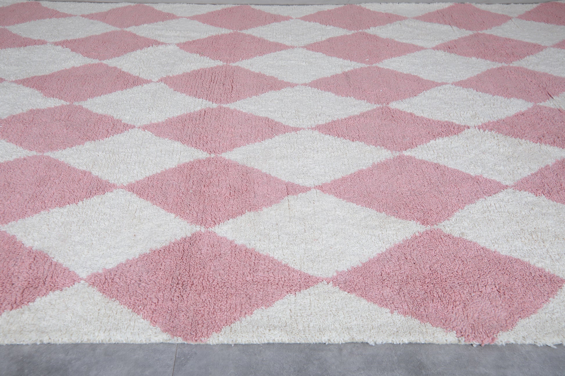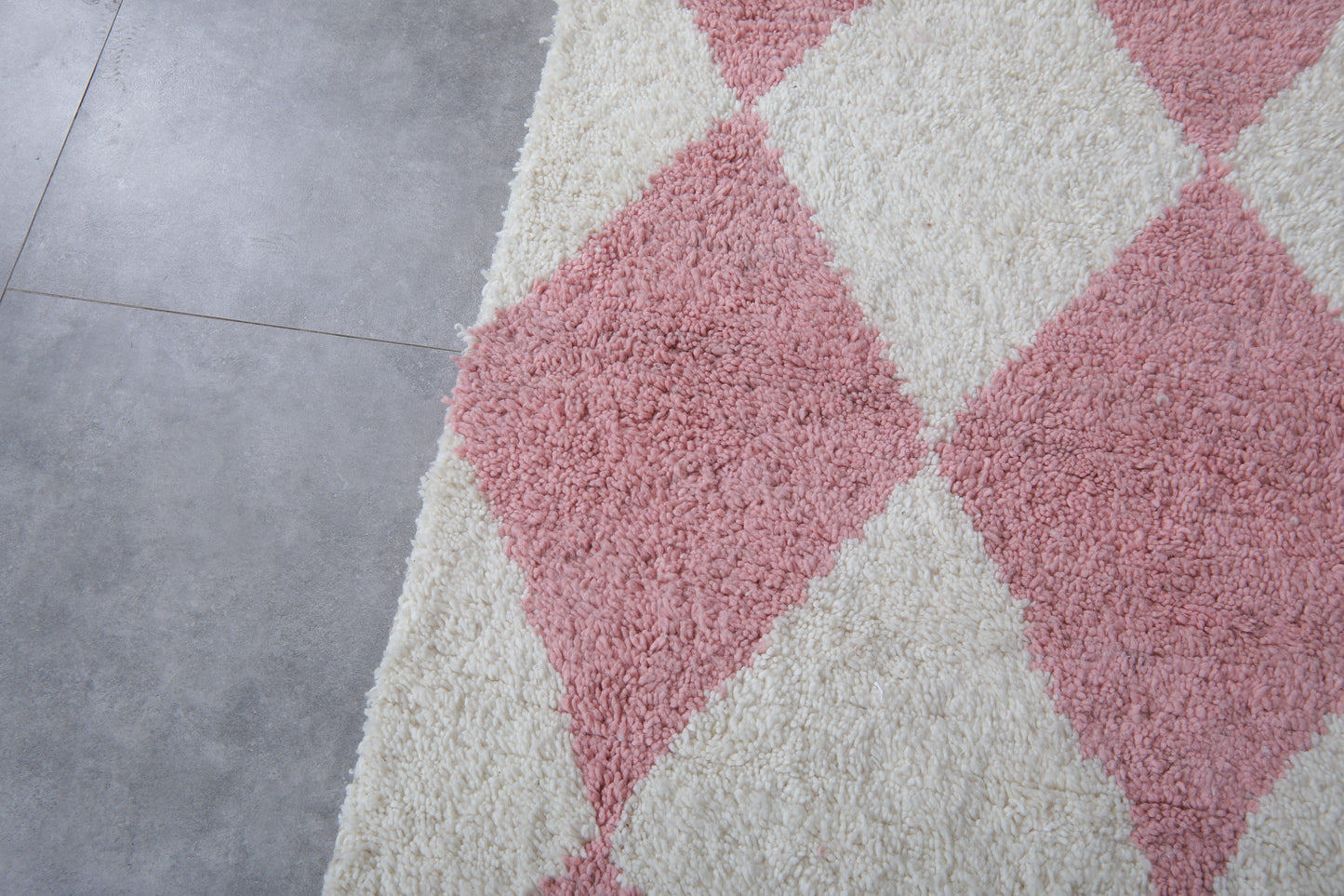 Custom size white and soft pink diamond Moroccan rug