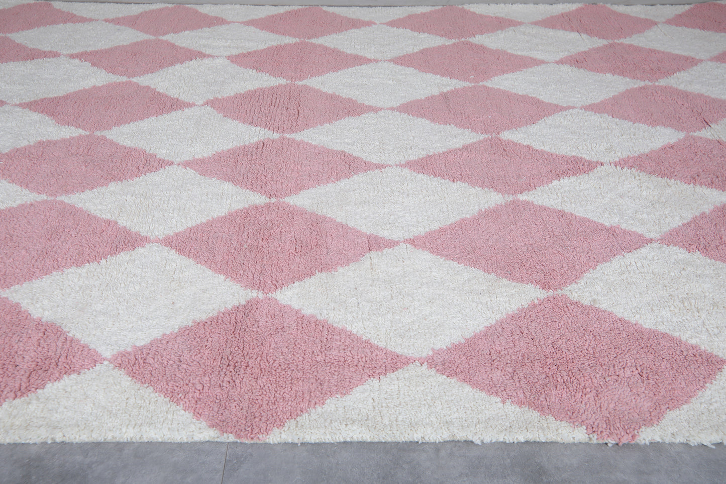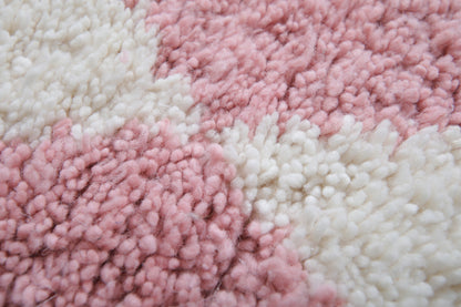 This white and soft pink diamond Moroccan rug adds a playful yet elegant touch to any space. Featuring a classic harlequin pattern, this handwoven wool rug is perfect for nurseries, living rooms, or bedrooms looking for a gentle pop of color. Crafted by skilled artisans, the rug combines traditional Berber techniques with a modern pastel palette. Its plush texture and geometric design make it both cozy and visually striking. Ideal for Scandinavian, boho, or contemporary interiors, this rug is available in custom sizes to perfectly fit your home.