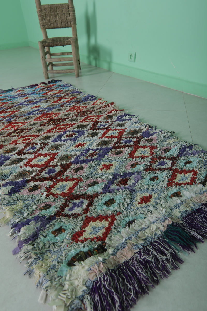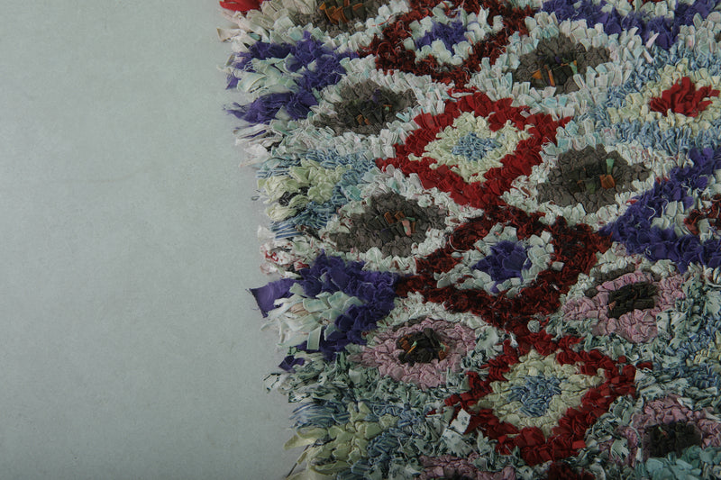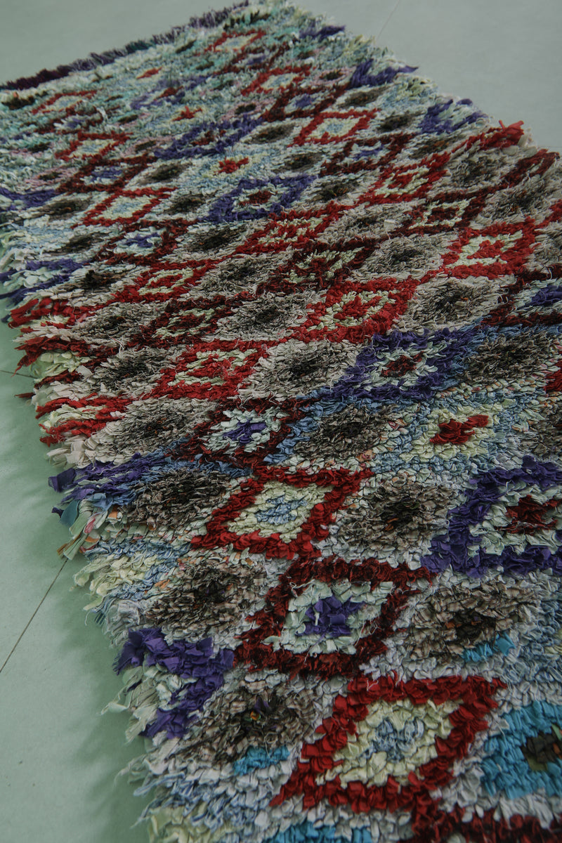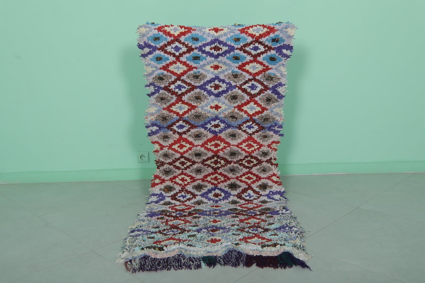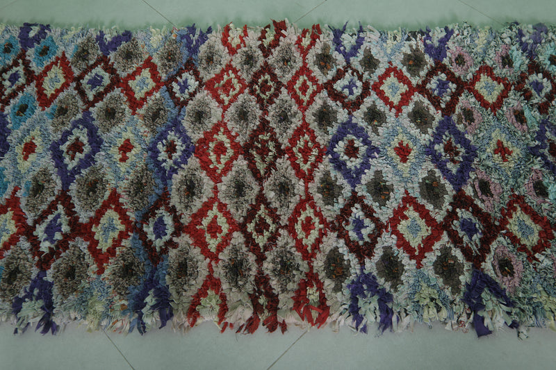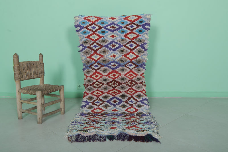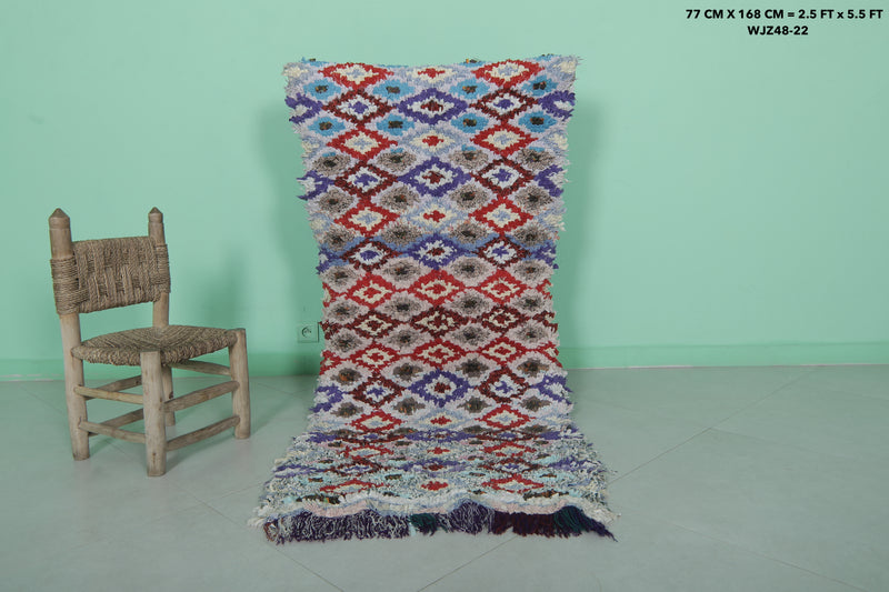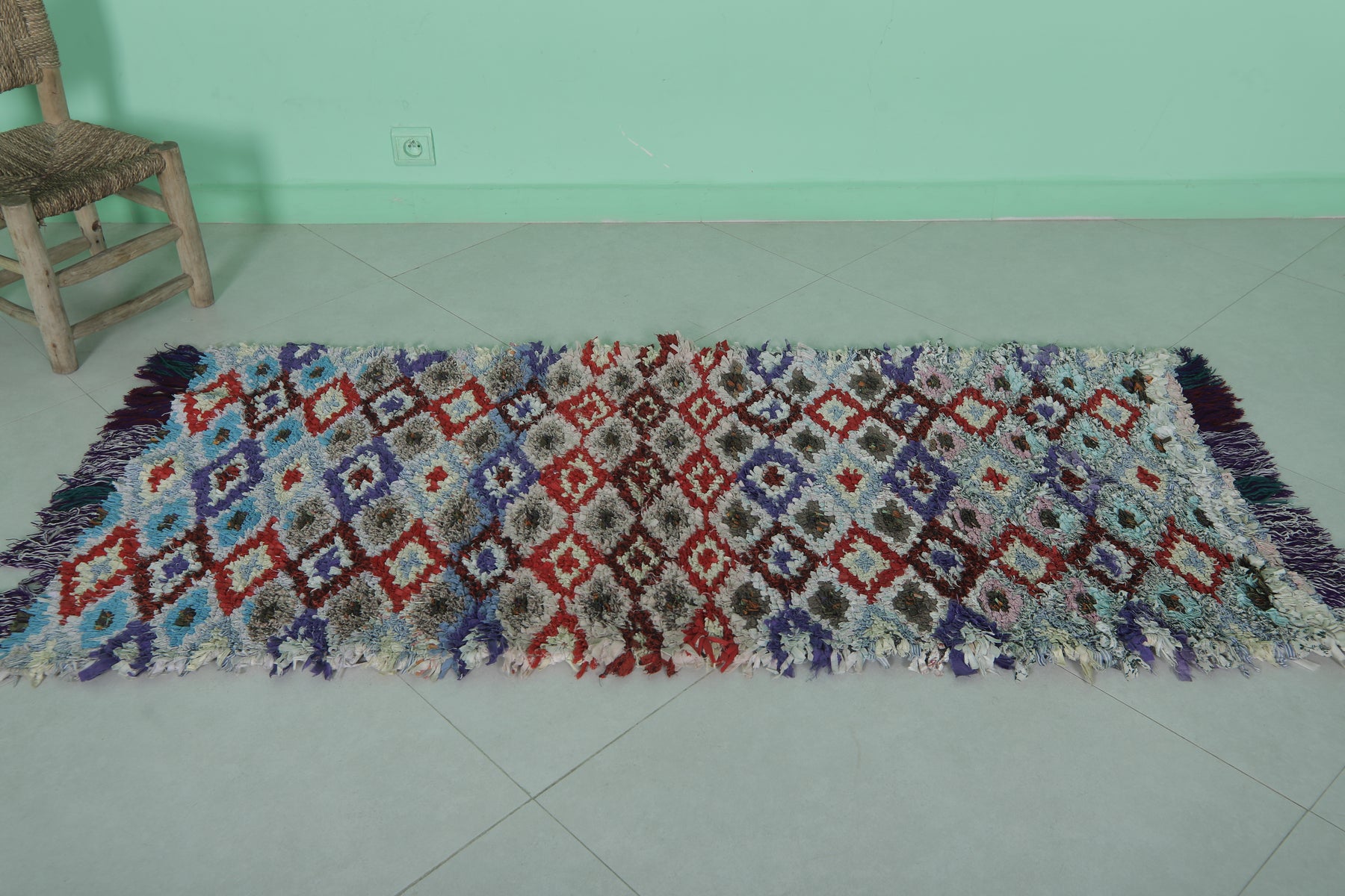 Add texture, color, and vintage flair to your space with this Handmade Moroccan Berber Runner Rug, sized at 2.5 x 5.5 feet. Crafted in the heart of Morocco, this unique piece features a repeating diamond pattern filled with rich tones of red, white, blue, and lavender. The shaggy texture offers warmth and comfort, while the intricate detailing celebrates traditional Berber weaving. It's the perfect runner for hallways, entries, or cozy corners that deserve a touch of authentic Moroccan style.