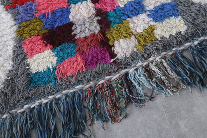 Add vibrant Moroccan charm to your space with this 2.5 FT x 5.9 FT Boucherouite runner rug. Featuring a colorful checkered pattern framed by bold geometric shapes on a neutral gray background, this handmade piece combines traditional Berber craftsmanship with sustainable design. Perfect for hallways, bedrooms, or narrow spaces, it’s crafted from recycled materials, making it eco-friendly and stylish. This rug brings warmth, texture, and a unique touch of artistry to any decor.