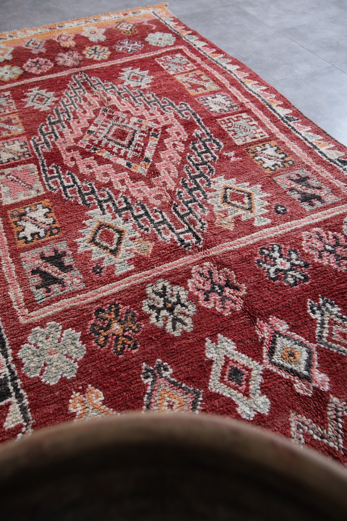 Add charm to your home with this Boujaad Moroccan rug, measuring 5.8 FT x 10.8 FT. This handcrafted wool rug features intricate Berber motifs, including a stunning central diamond pattern framed by smaller geometric designs and tribal symbols. The vibrant palette of red, orange, pink, black, and white adds energy and warmth to any space, while the fine weaving showcases Moroccan craftsmanship. Perfect as a living room centerpiece, bedroom rug, or decorative accent, this unique vintage rug combines cultural heritage with timeless beauty and artisanal quality.