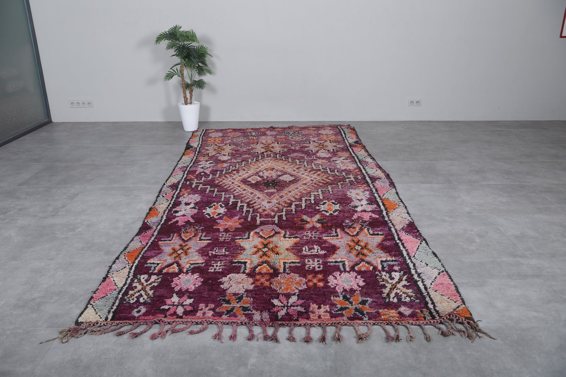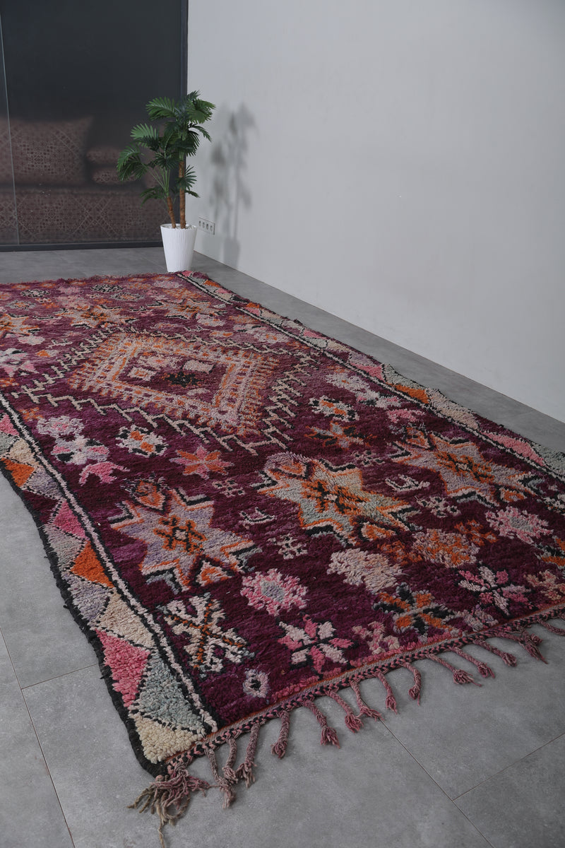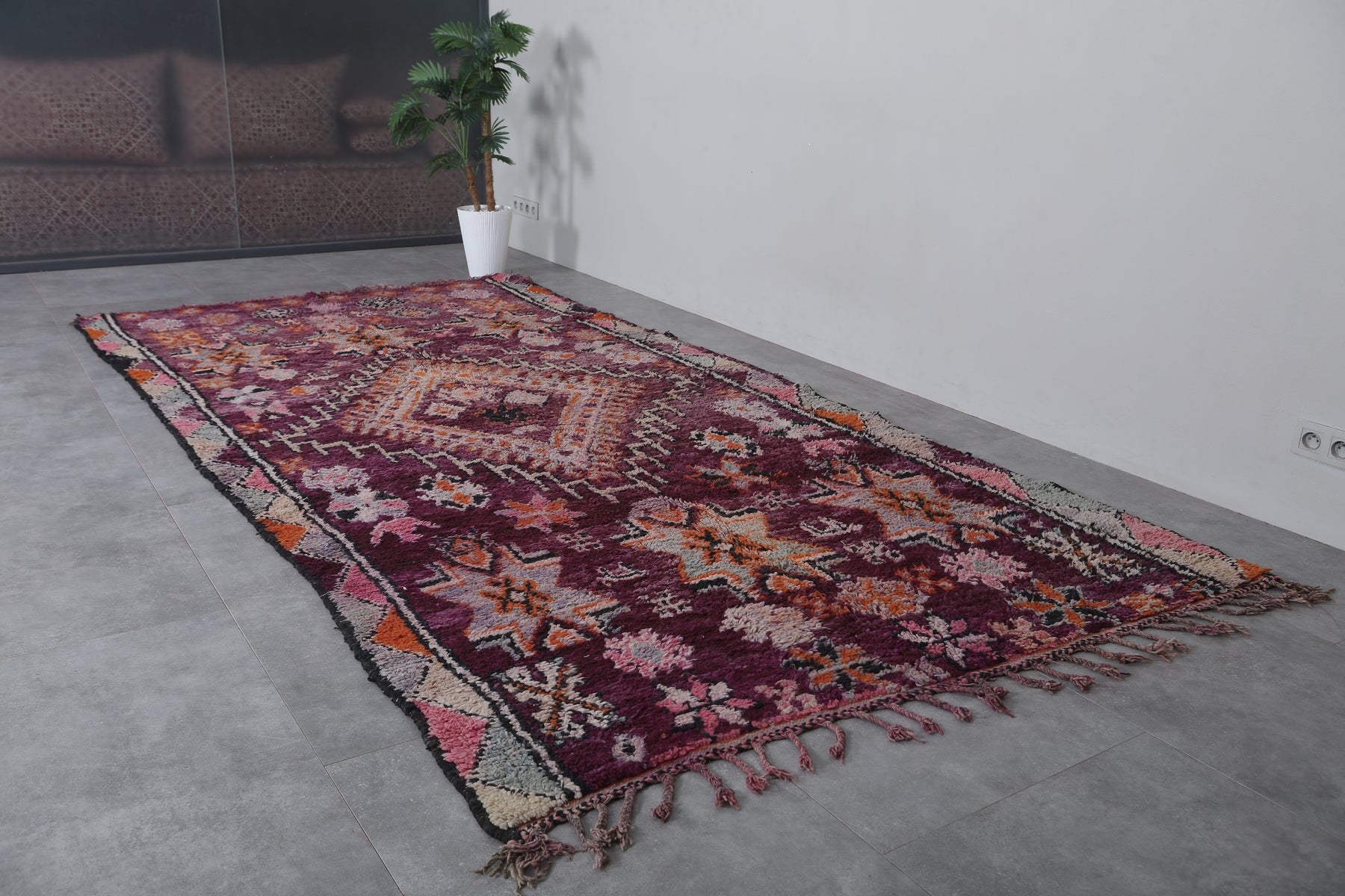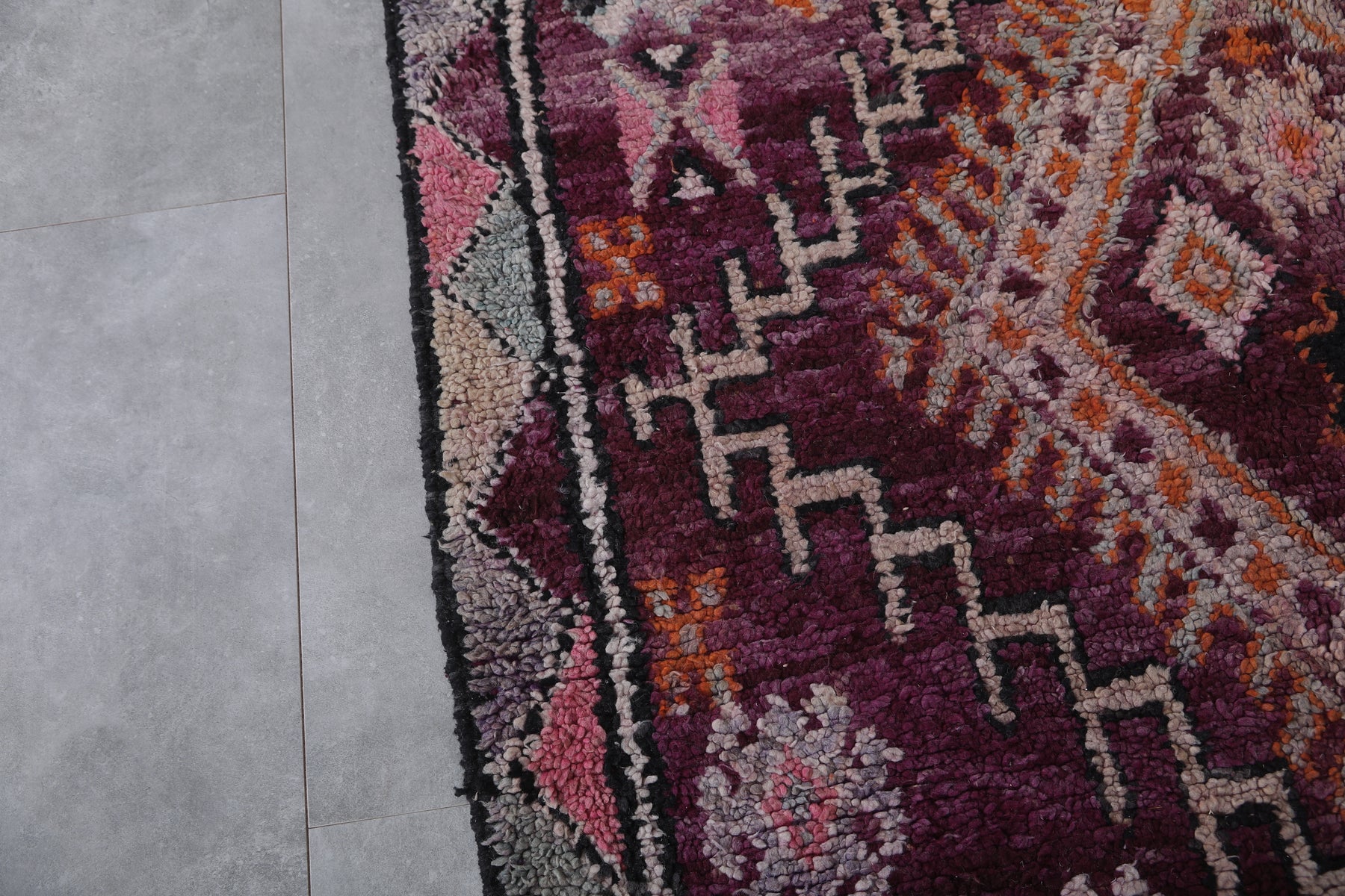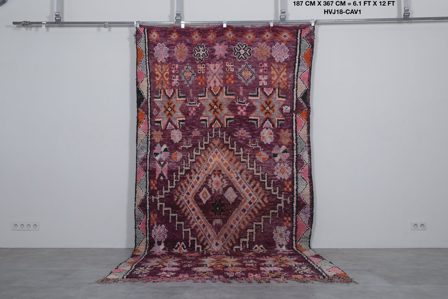 Elevate your living space with this stunning Moroccan Boujaad rug, measuring 6.1 FT x 12 FT. This vintage masterpiece features an intricate central diamond motif surrounded by traditional Berber symbols of prosperity and protection.