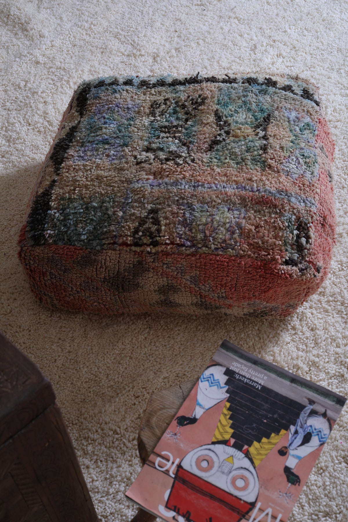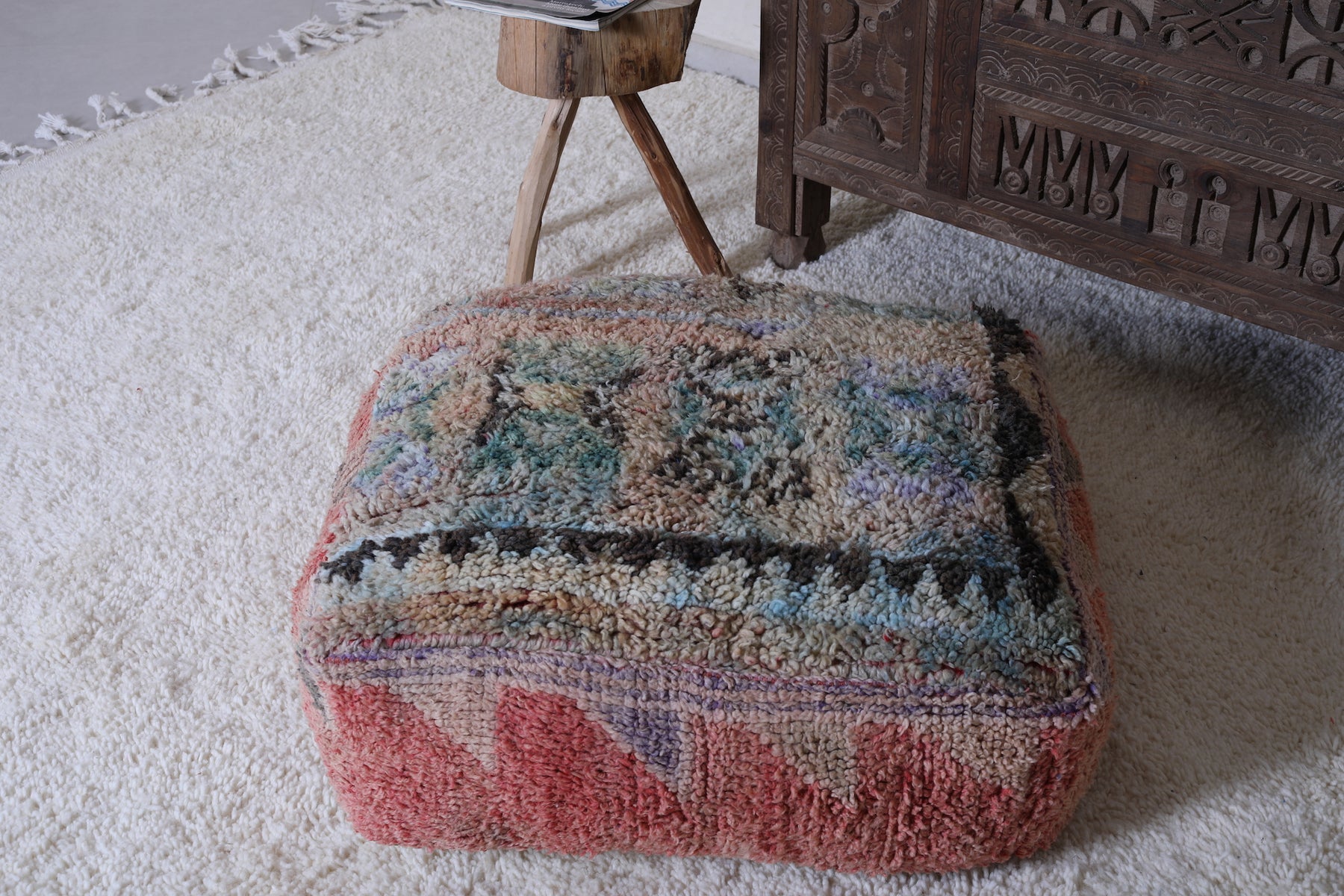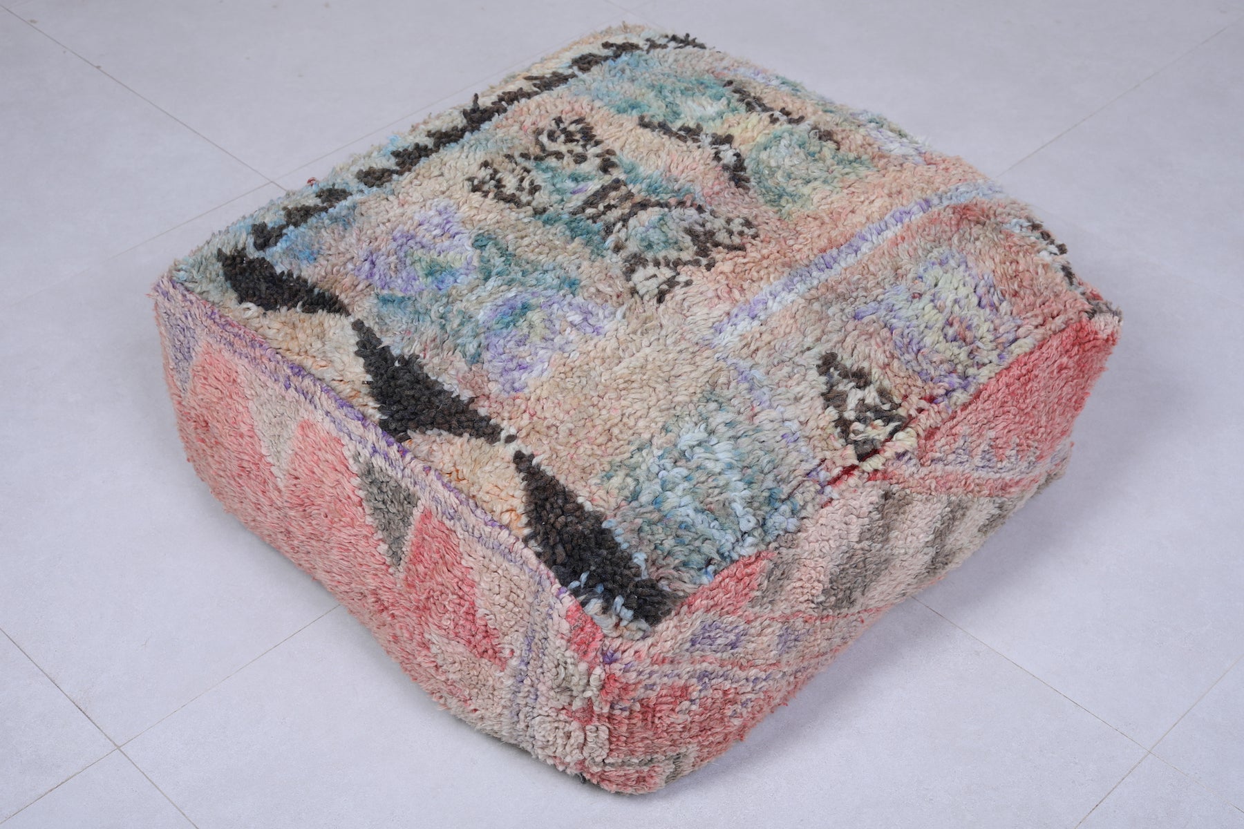 Add this colorful Moroccan pouf to your space and enjoy the perfect blend of cultural artistry and functional style.