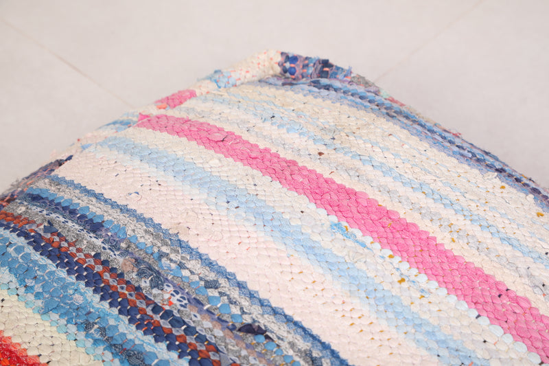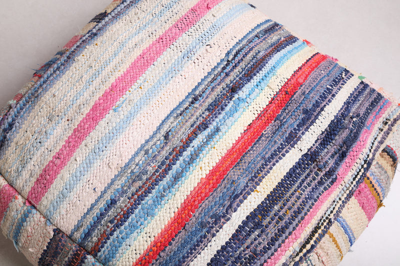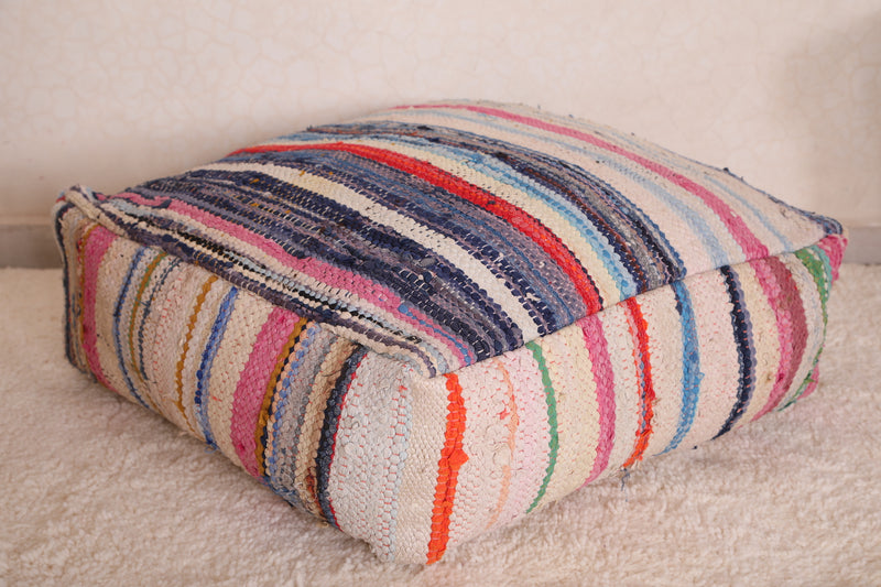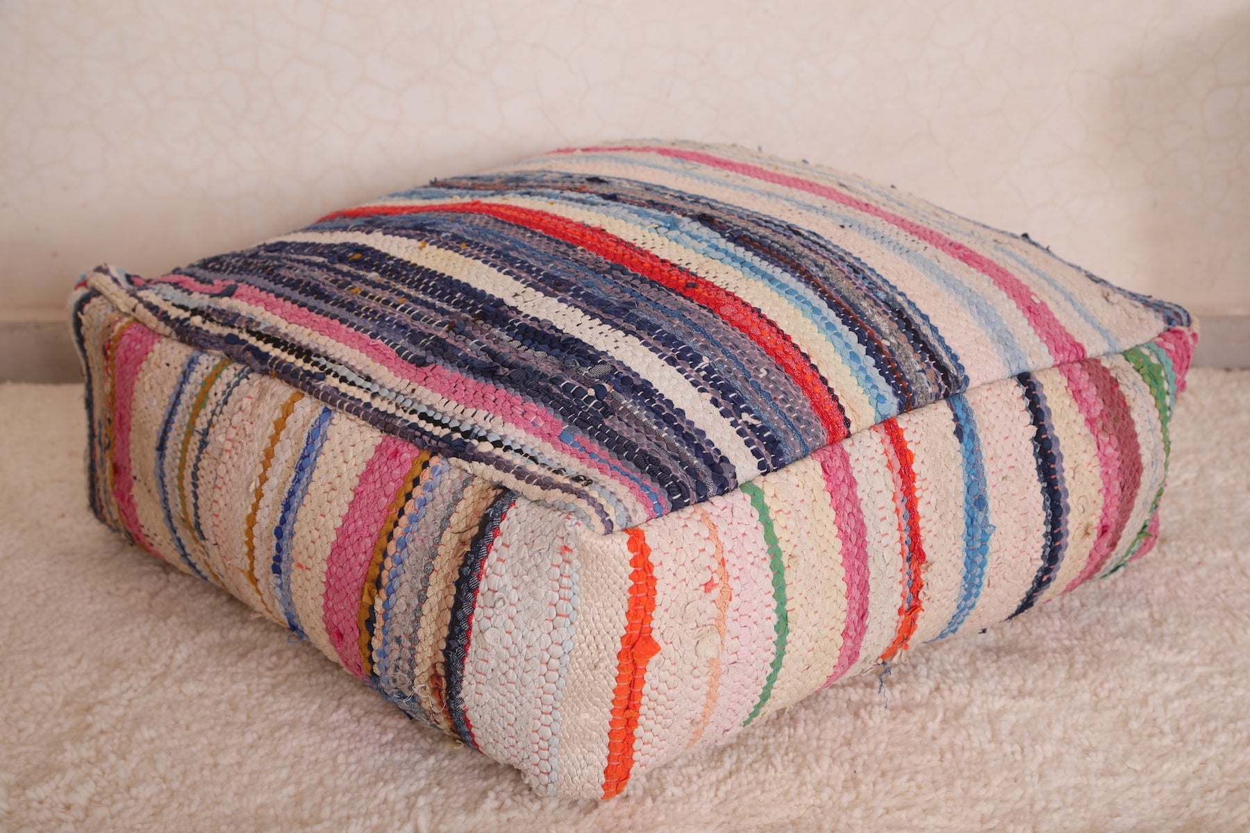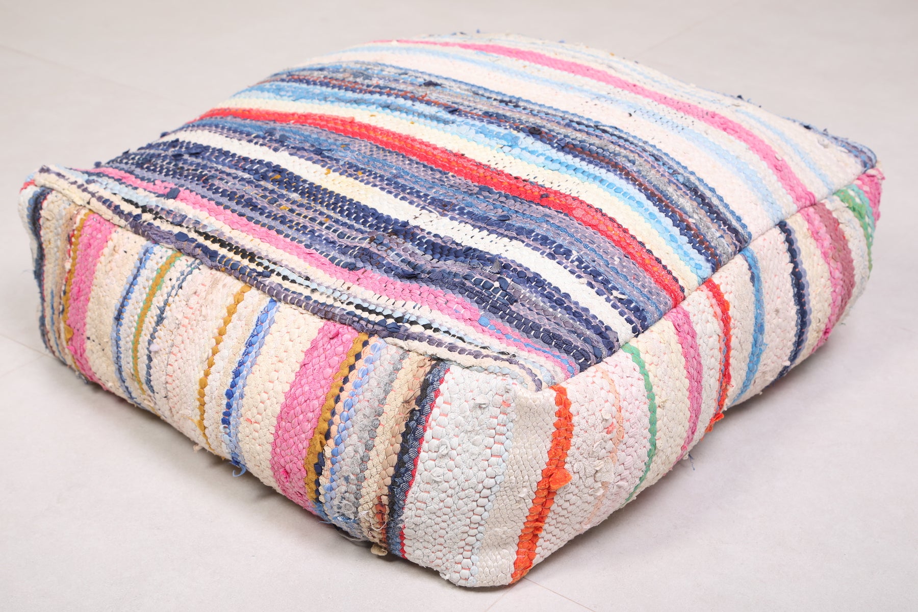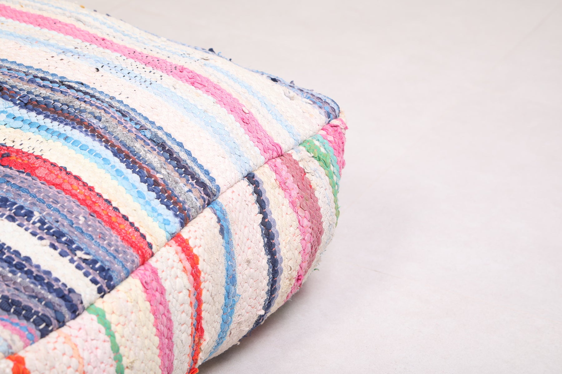 Add texture and color to your space with this handmade Moroccan striped pouf, crafted from recycled Berber rugs. Featuring vibrant stripes in navy, orange, pink, green, and cream, this floor pillow brings energy and cultural richness to modern or boho interiors. Its robust construction and soft surface make it ideal as a casual seat or footrest in any cozy corner.