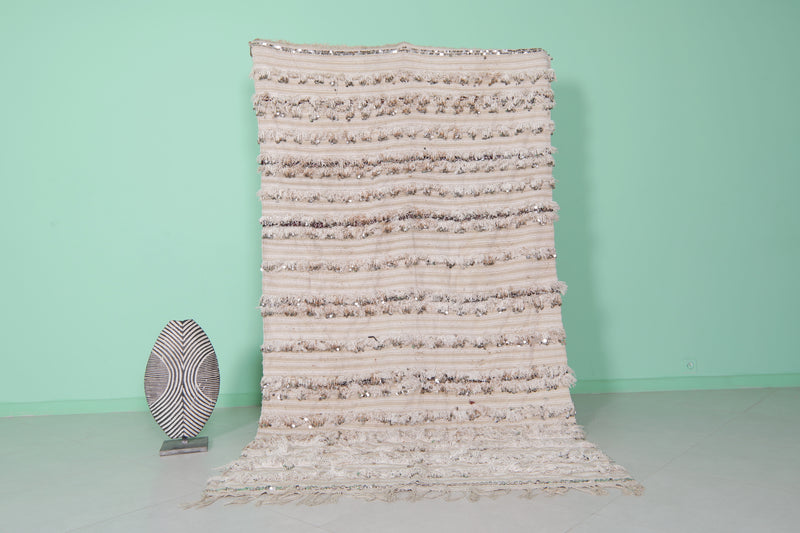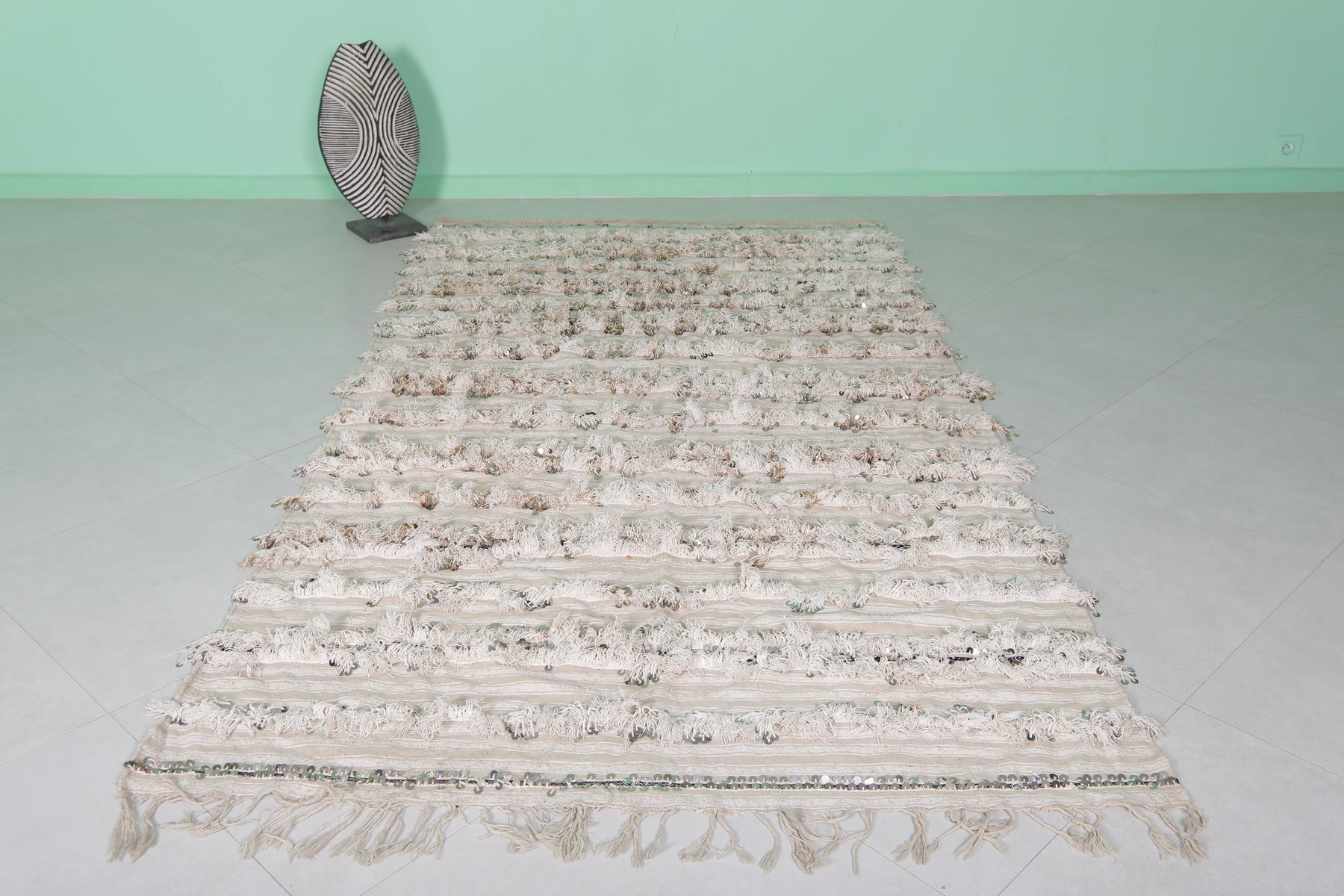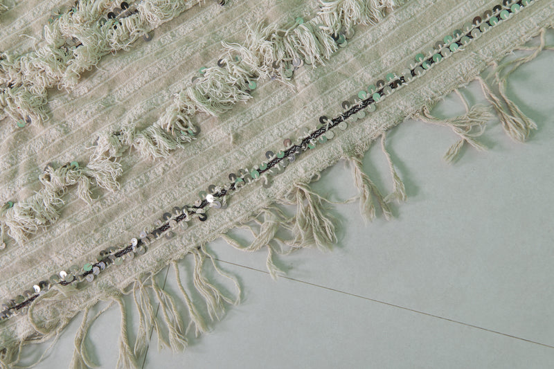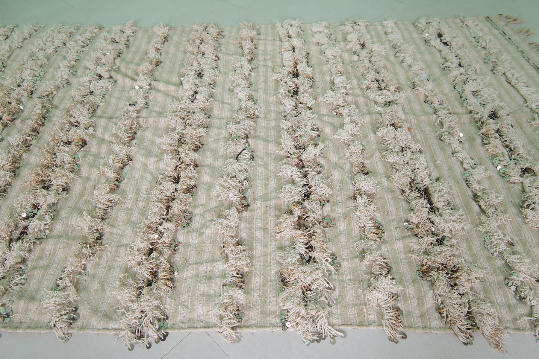 Add grandeur and cultural richness with this Handmade Moroccan Berber Wedding Blanket. Lovingly handwoven by skilled artisans, this stunning 5 FT x 8.9 FT piece showcases traditional Berber designs embellished with shimmering sequins and soft fringe. Whether styled as a luxurious throw, wall hanging, or unique area rug, it brings warmth, elegance, and artisanal charm to any space.