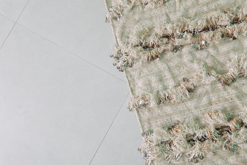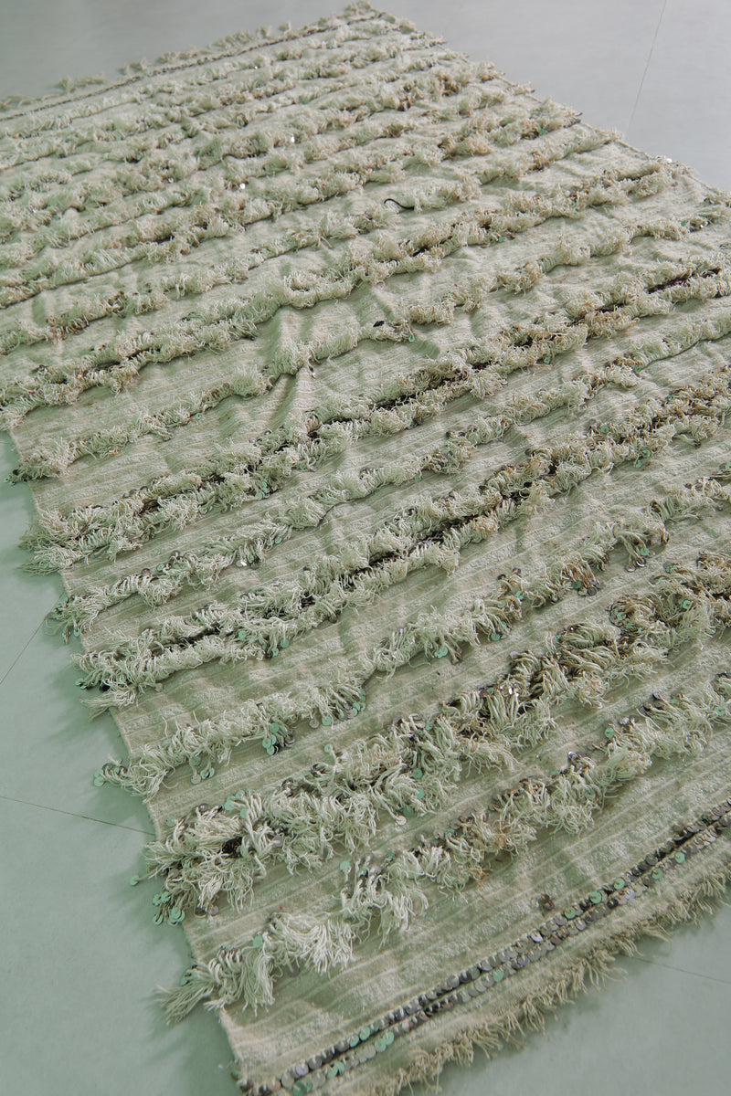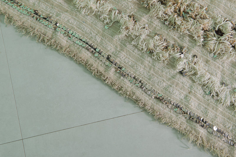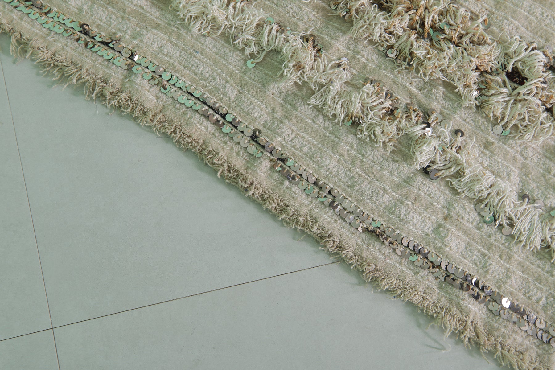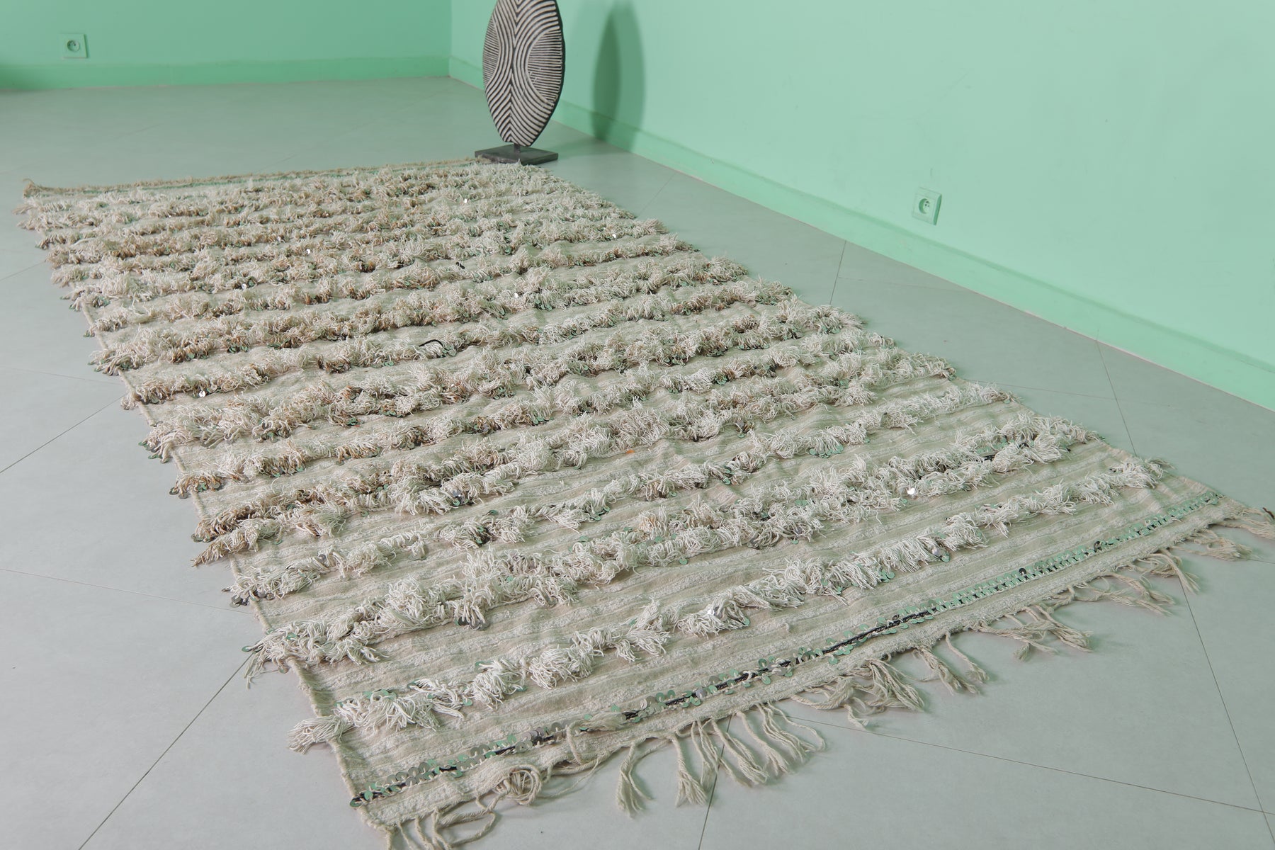 Add grandeur and cultural richness with this Handmade Moroccan Berber Wedding Blanket. Lovingly handwoven by skilled artisans, this stunning 5 FT x 8.9 FT piece showcases traditional Berber designs embellished with shimmering sequins and soft fringe. Whether styled as a luxurious throw, wall hanging, or unique area rug, it brings warmth, elegance, and artisanal charm to any space.