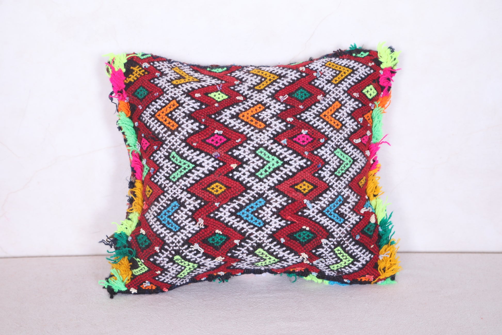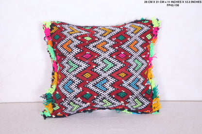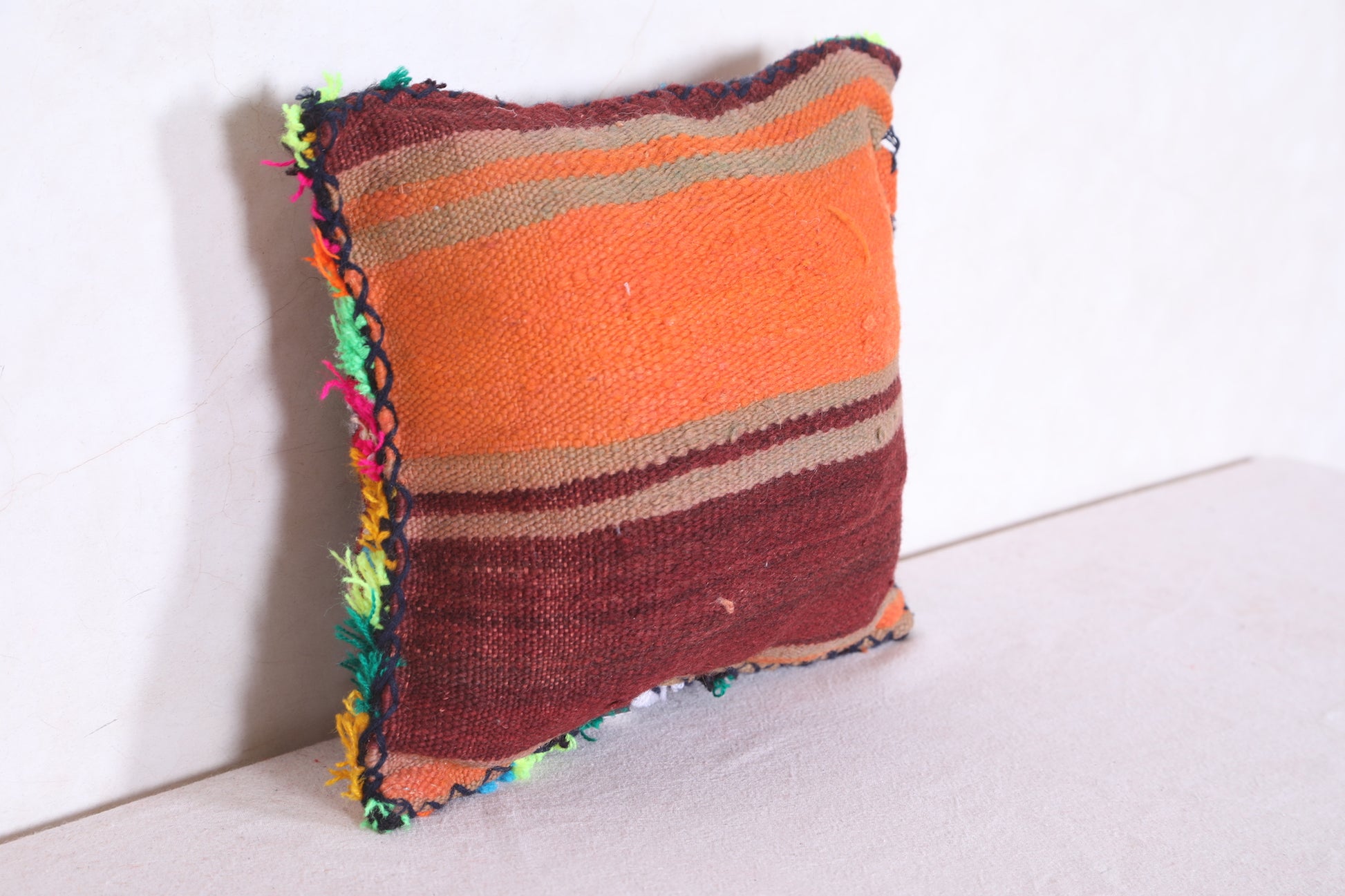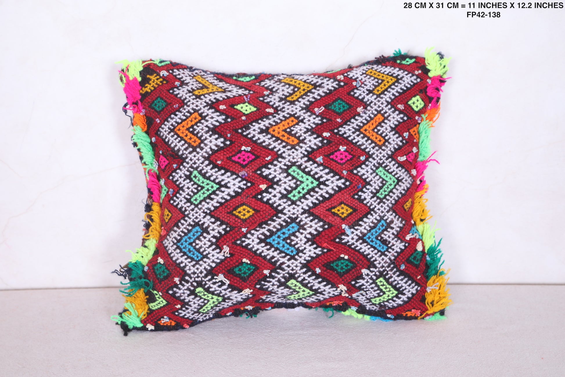 A Moroccan handmade kilim pillow with dimensions of 11 inches X 12.2 inches refers to a small decorative pillow made from a kilim, which is a traditional flat-woven textile. Kilim pillows are known for their intricate patterns, vibrant colors, and cultural significance.
