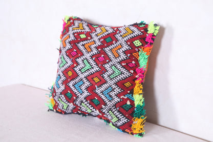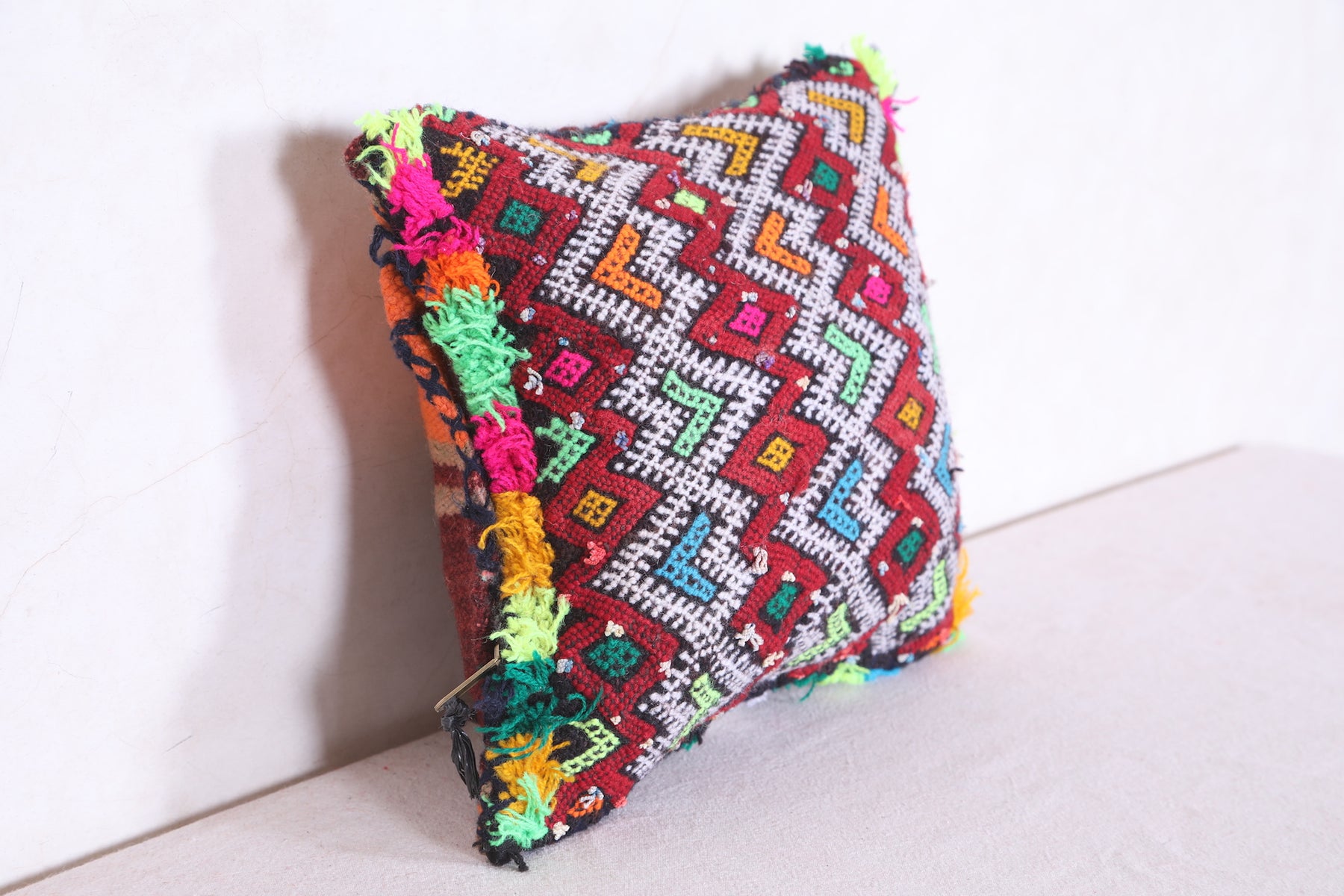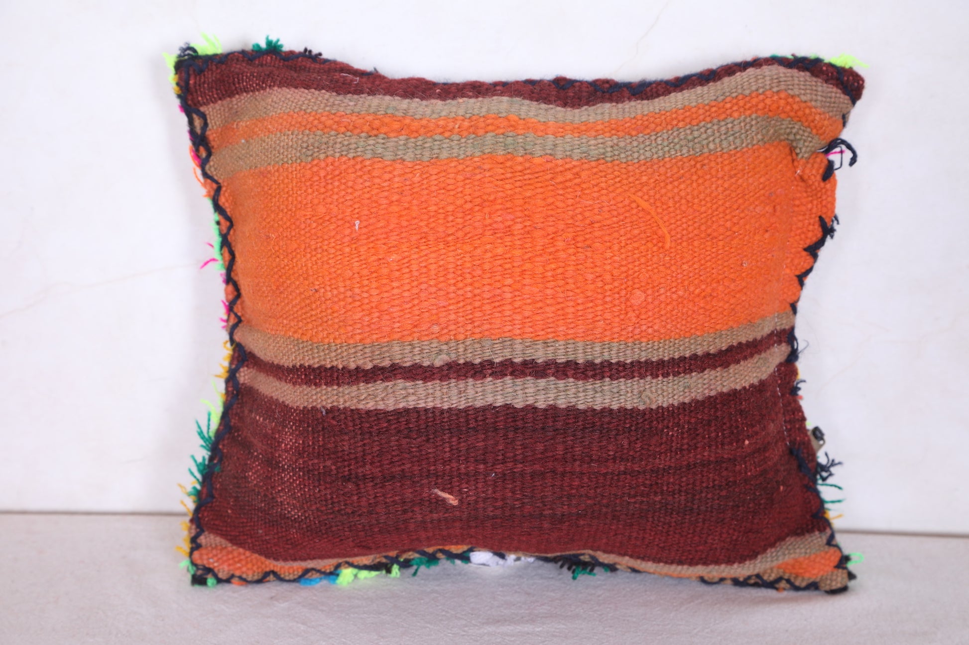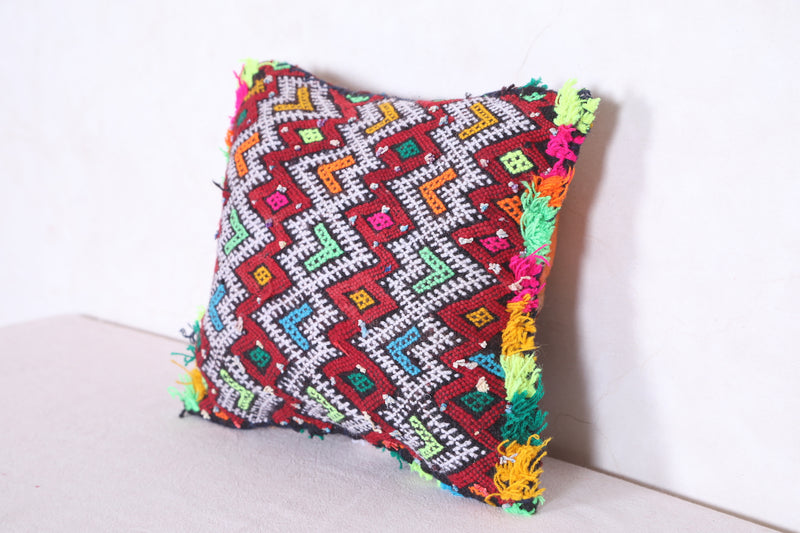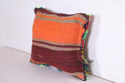 A Moroccan handmade kilim pillow with dimensions of 11 inches X 12.2 inches refers to a small decorative pillow made from a kilim, which is a traditional flat-woven textile. Kilim pillows are known for their intricate patterns, vibrant colors, and cultural significance.