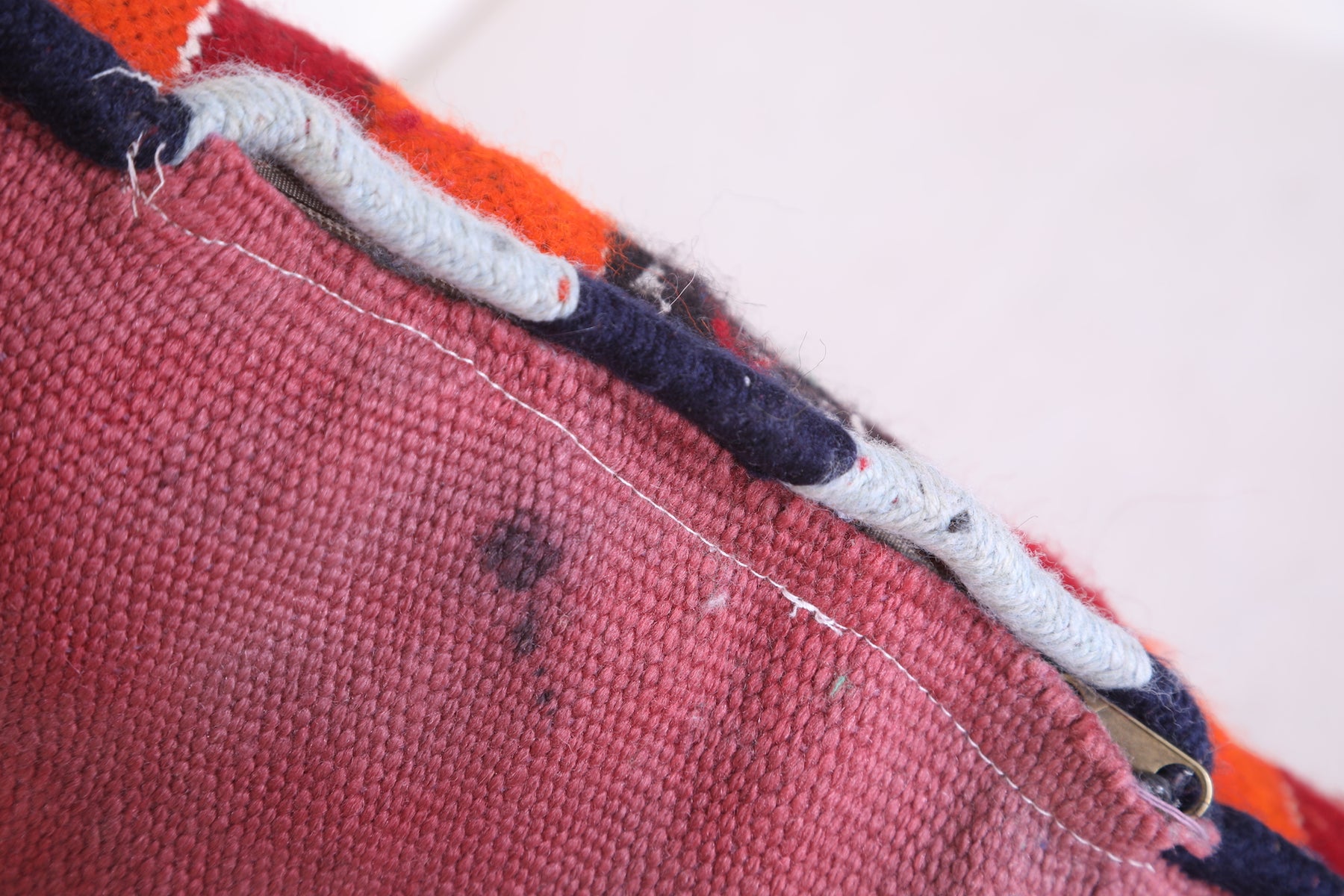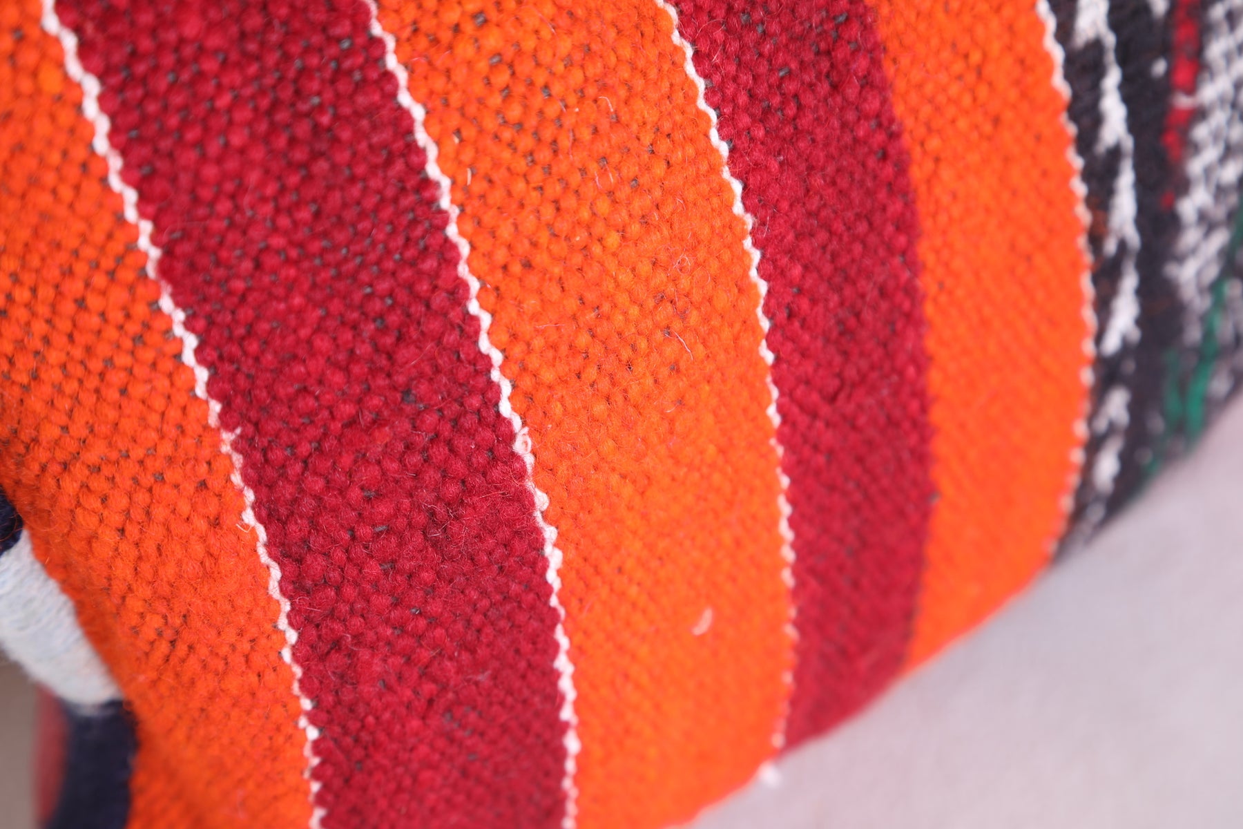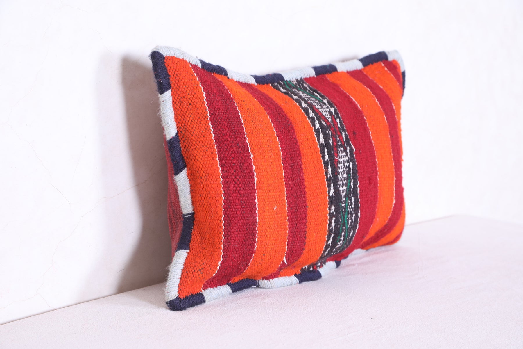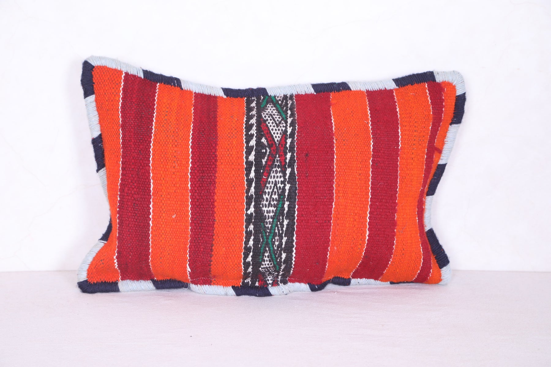 This Moroccan handmade kilim pillow will add a unique decorative touch to any room. Its bold geometric design and intricate detail add a unique texture that you won't find anywhere else. The beautiful cover measures 13.3 INCHES X 20.4 INCHES. Add style to your home with this handmade kilim pillow from Morocco.