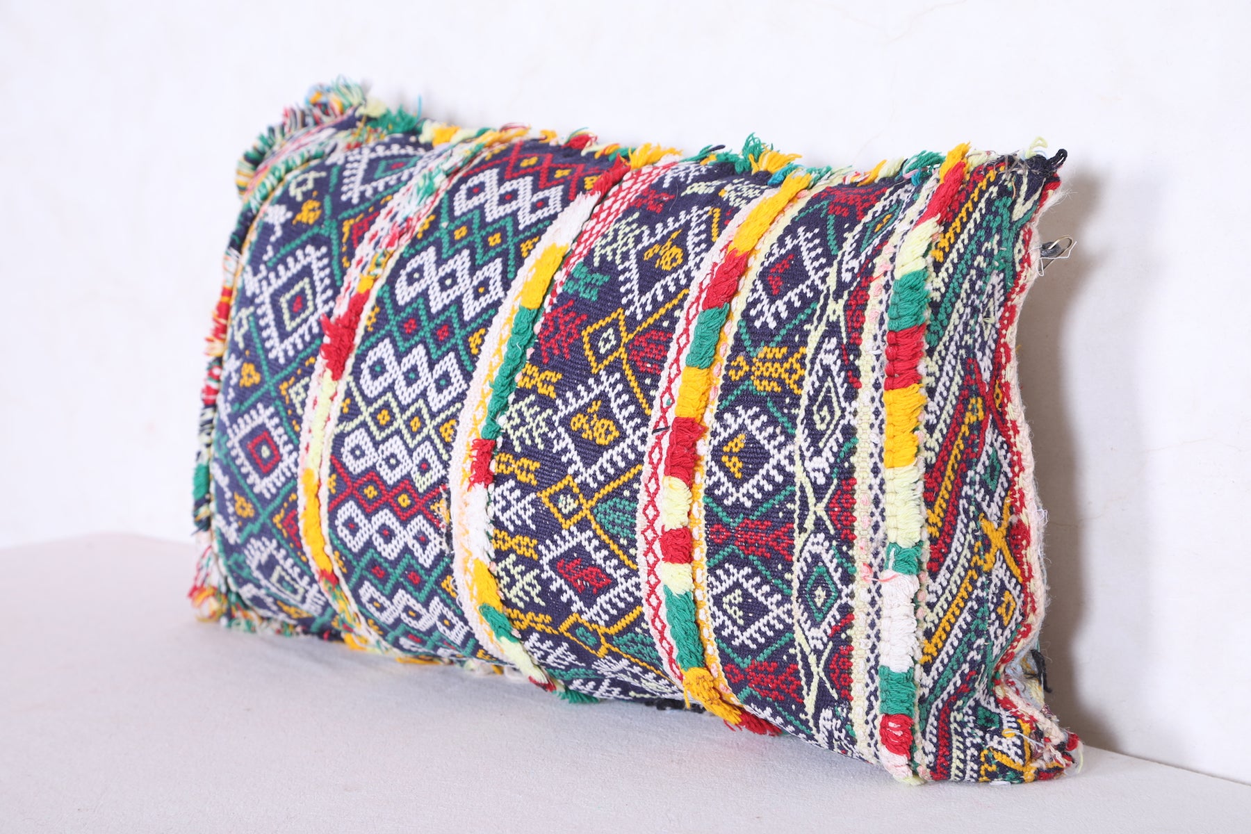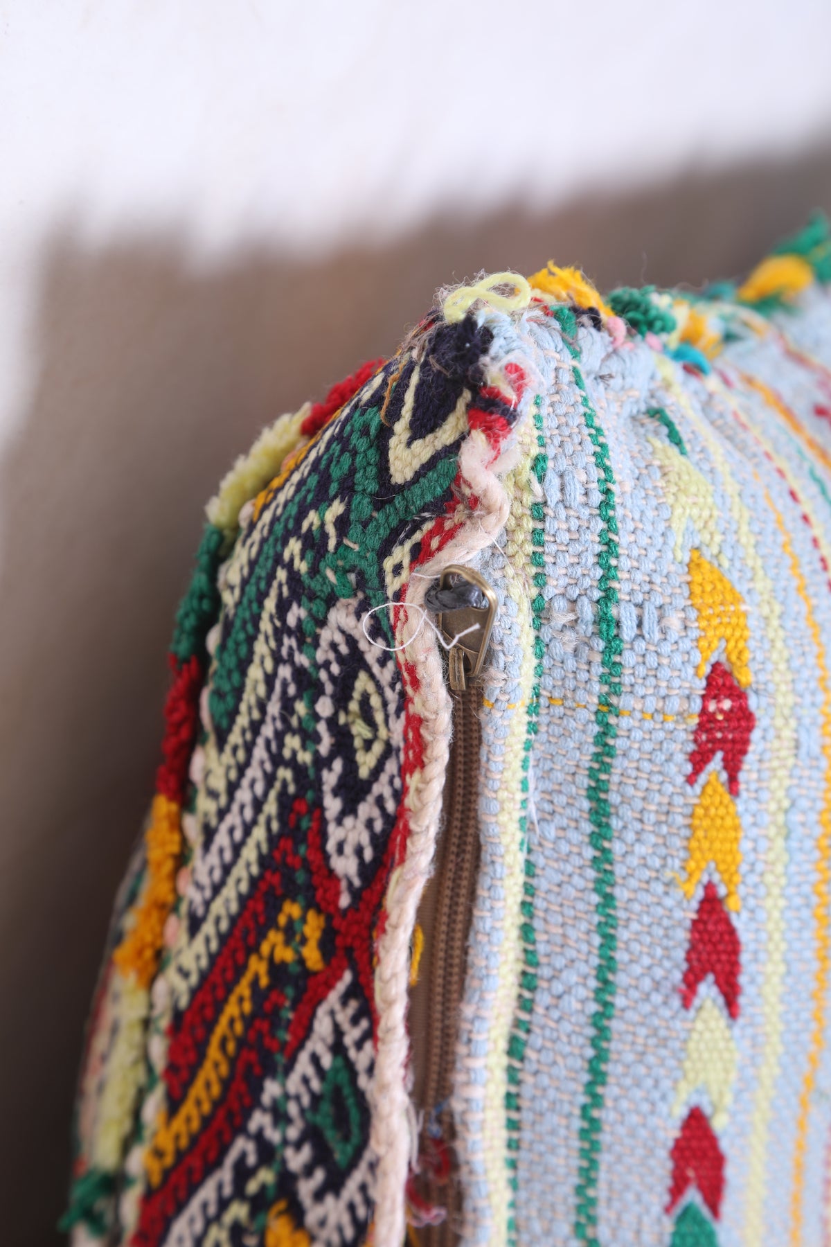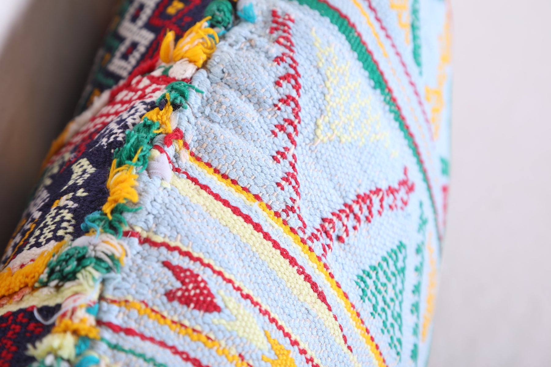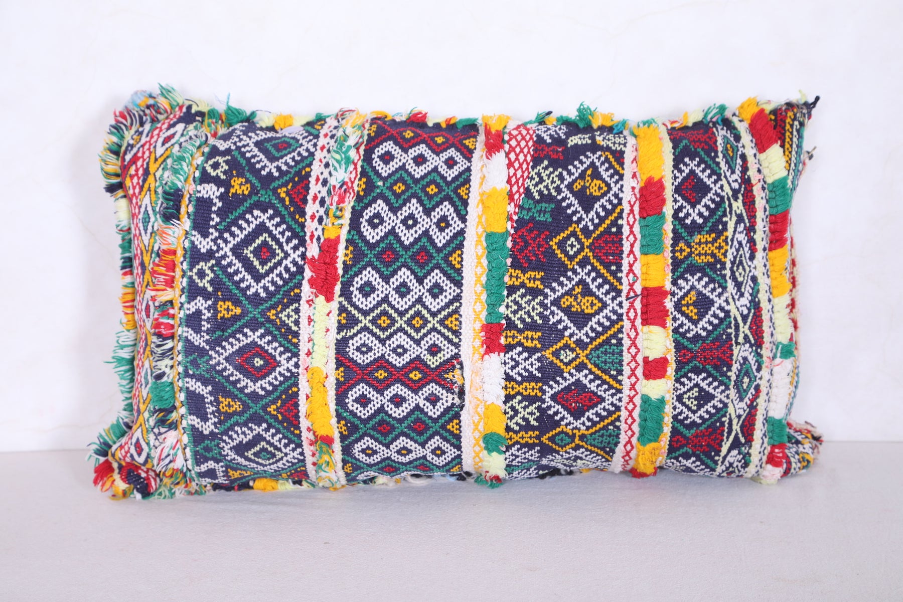 This handmade Moroccan kilim pillow is made with the finest materials, featuring a bright cover with intricate weaving patterns to add a unique touch of exotic style to any room. The 14.1 inch by 22 inch size will fit perfectly on any sofa or bed and provide a comfortable and fashionable resting spot.