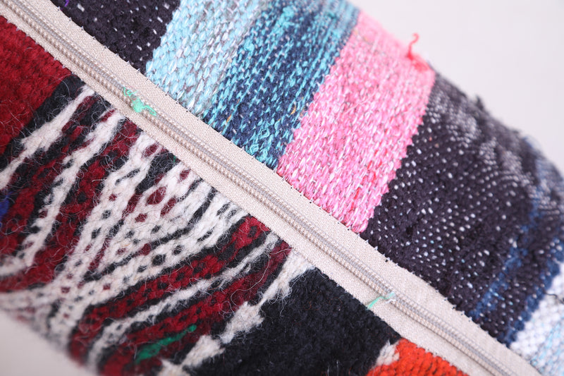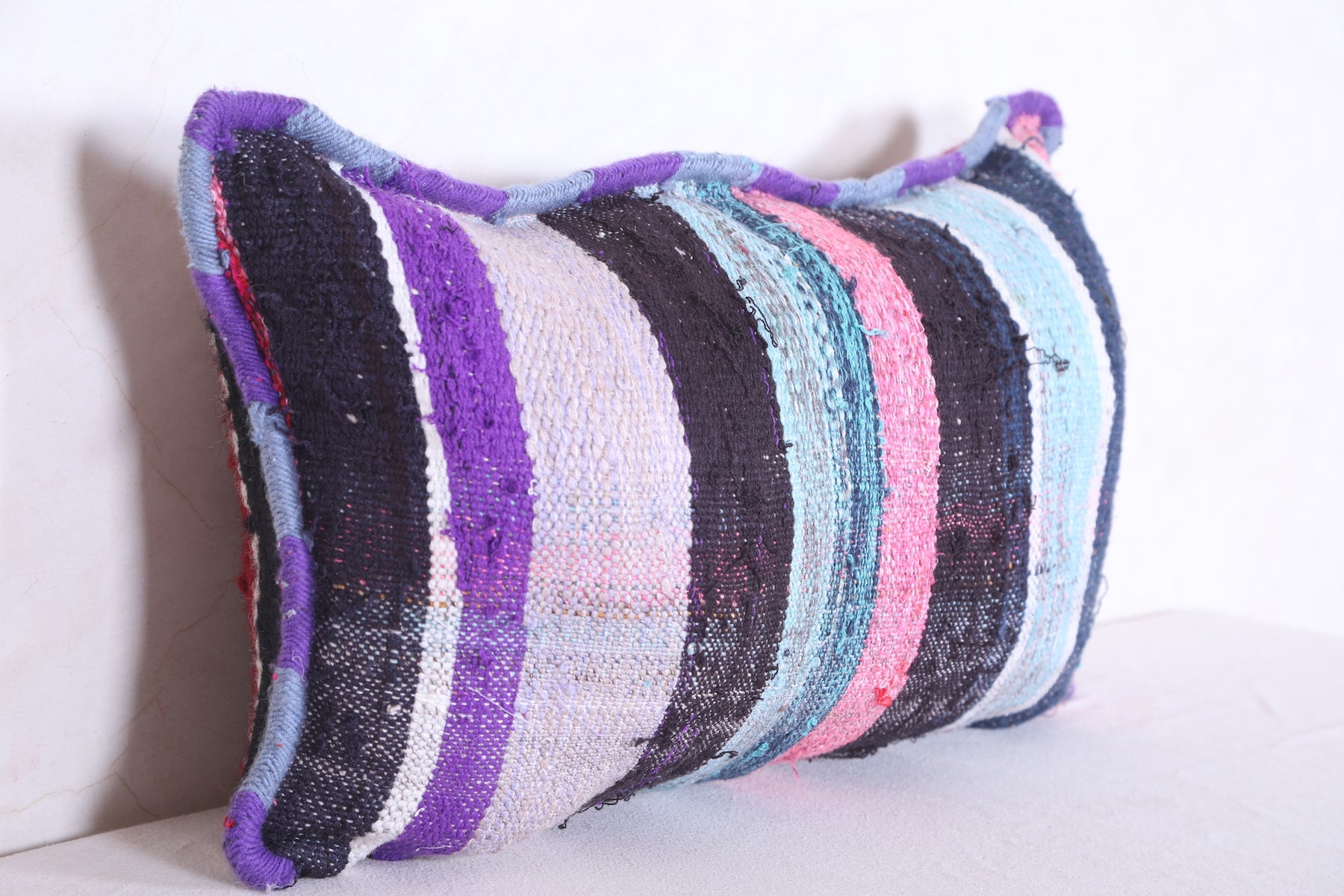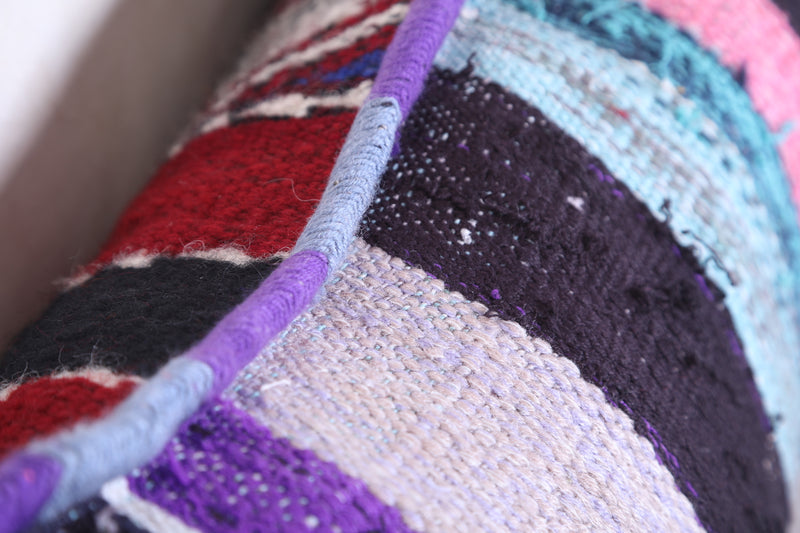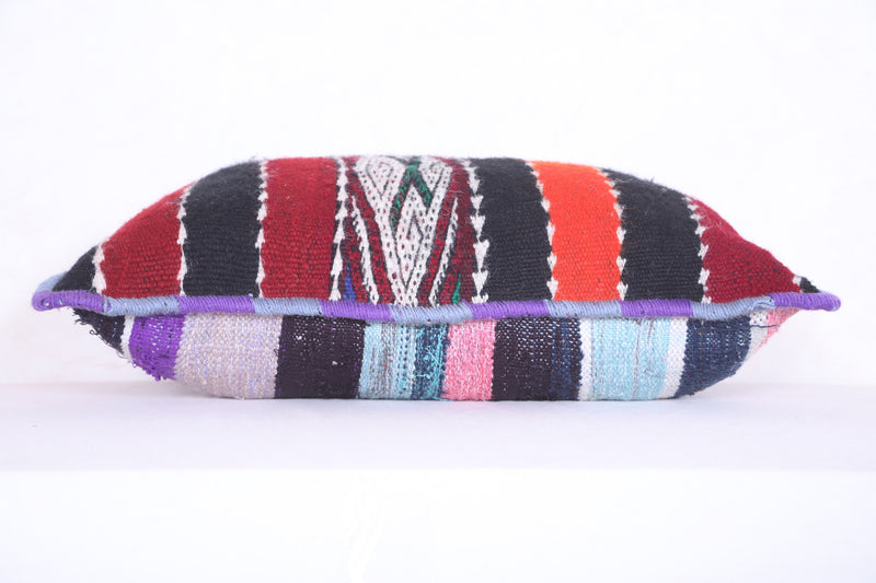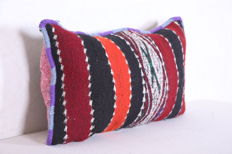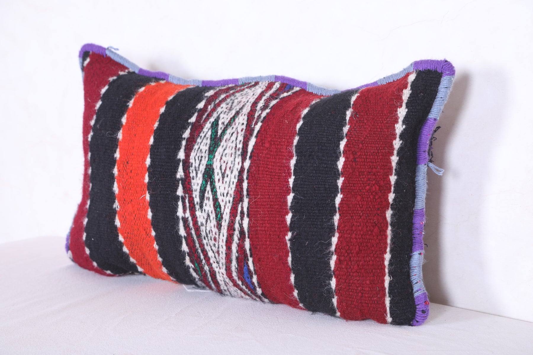 A Moroccan handmade kilim pillow with dimensions of 14.5 inches X 24.4 inches refers to a decorative pillow made from a kilim, which is a traditional flat-woven textile. Kilim pillows are known for their unique patterns, vibrant colors, and cultural significance.
