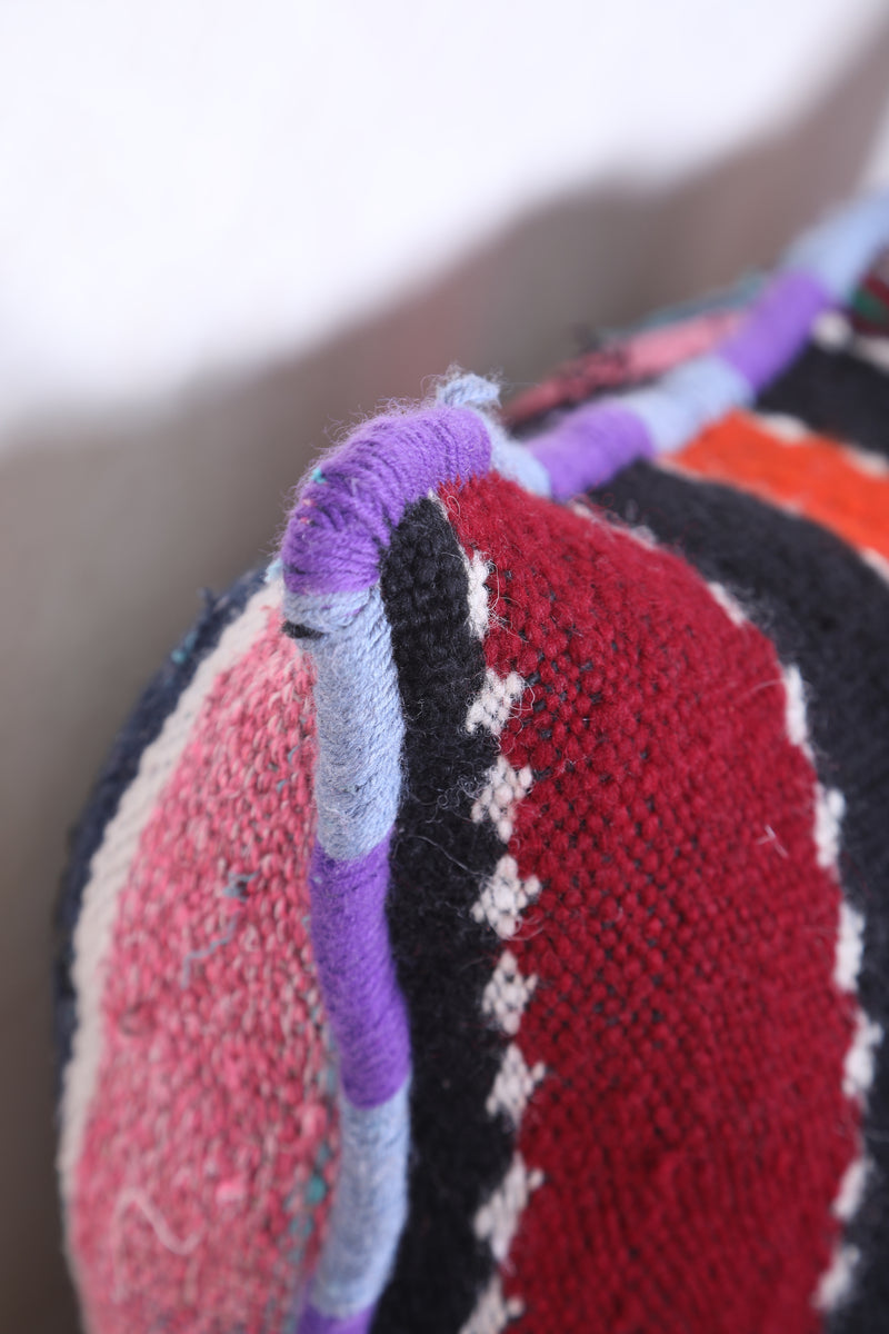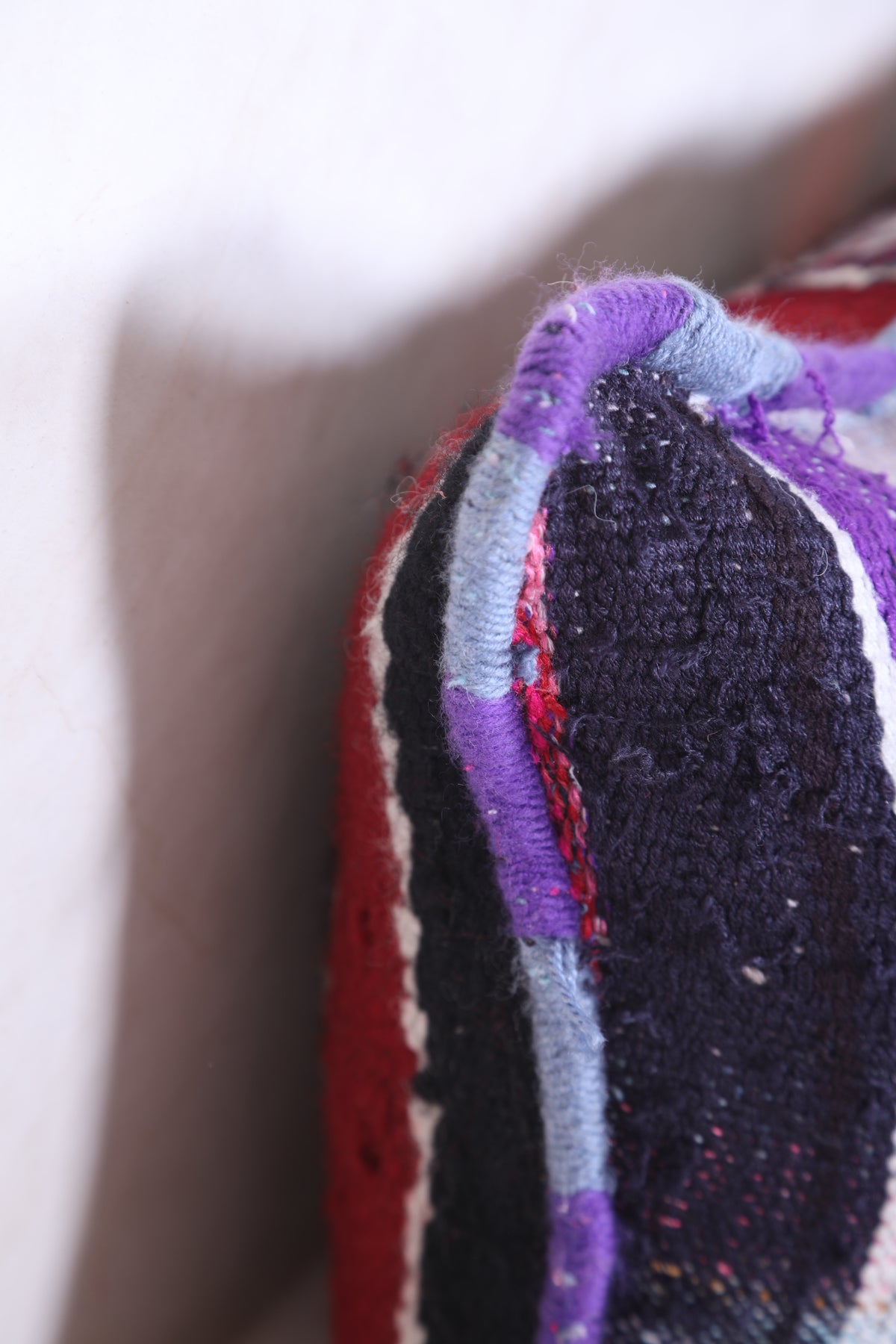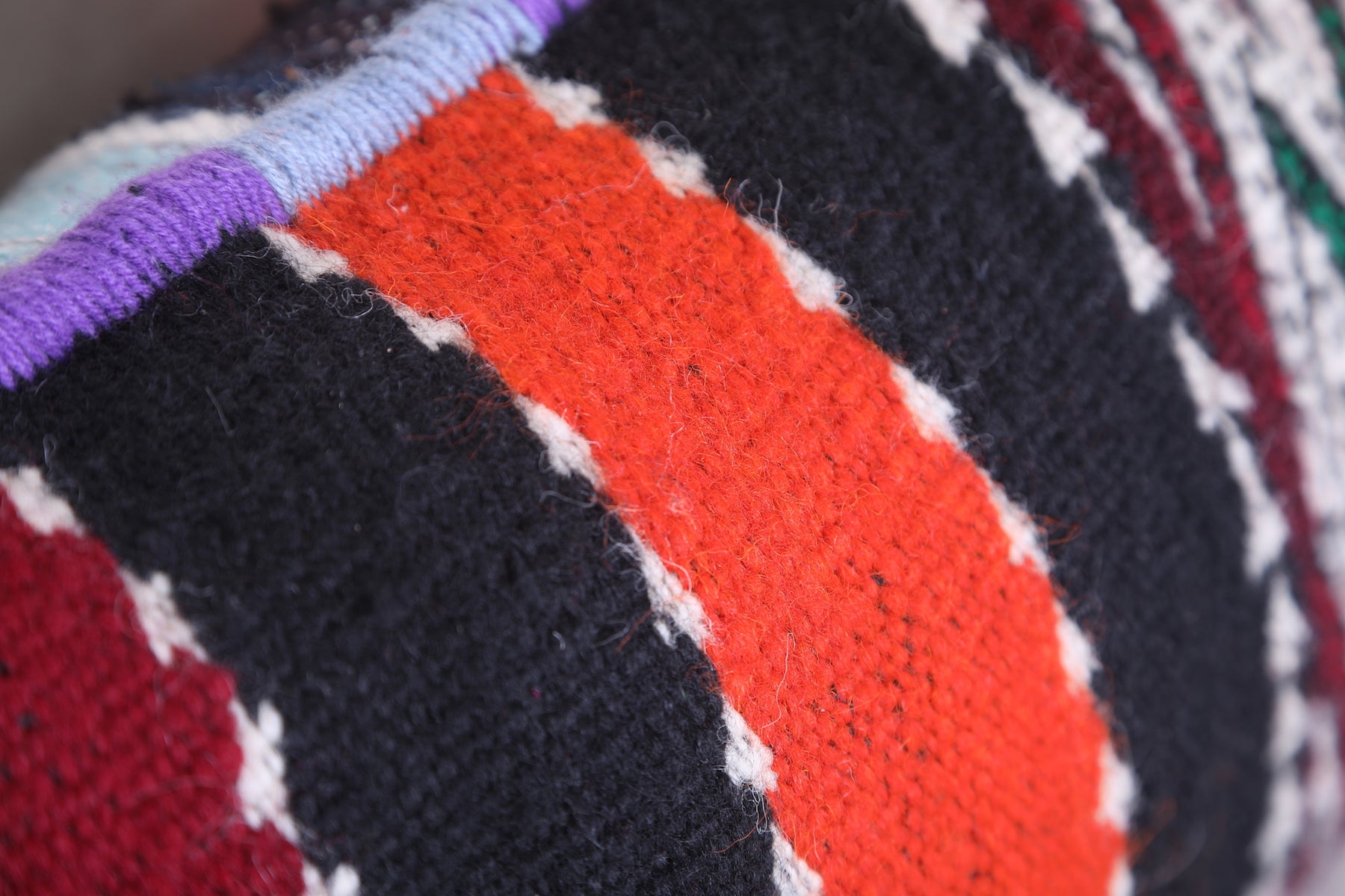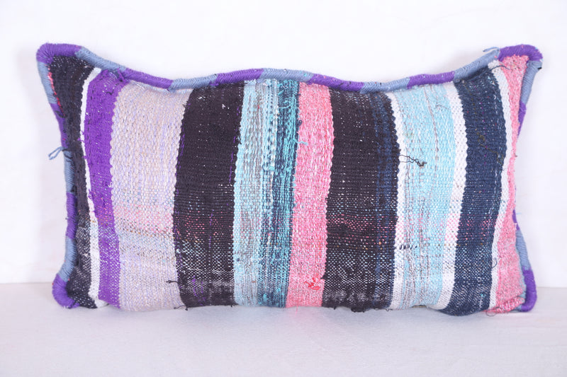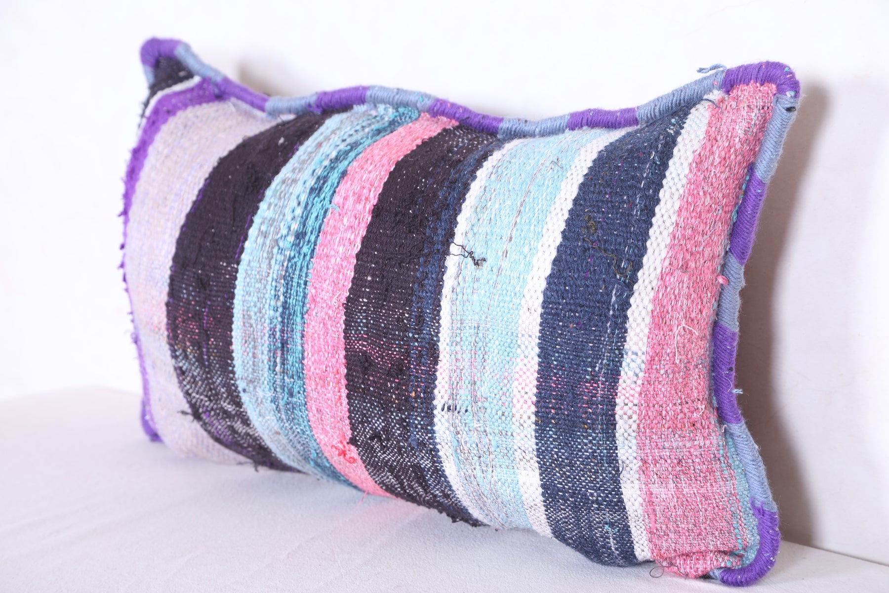 A Moroccan handmade kilim pillow with dimensions of 14.5 inches X 24.4 inches refers to a decorative pillow made from a kilim, which is a traditional flat-woven textile. Kilim pillows are known for their unique patterns, vibrant colors, and cultural significance.
